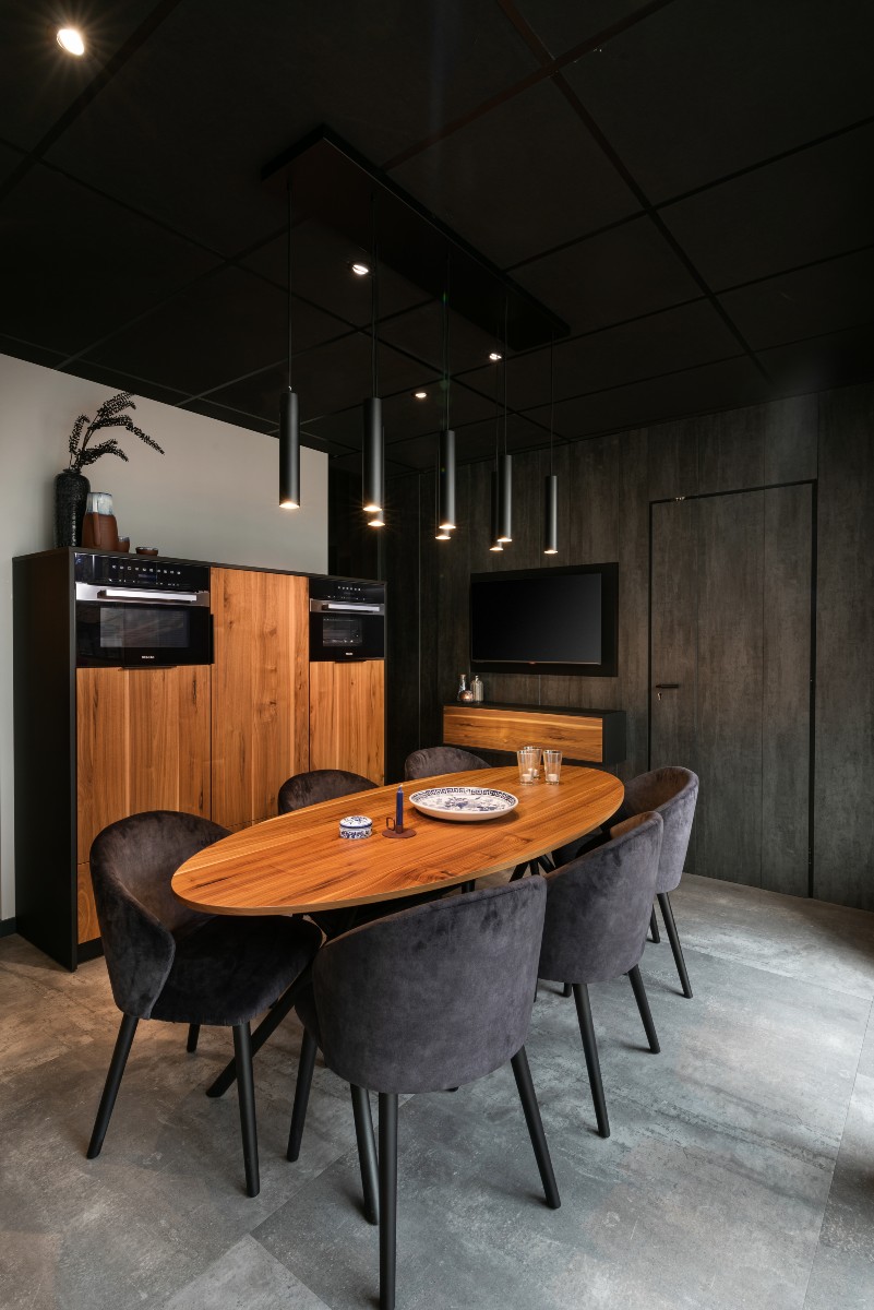 Deze keuken bestaat uit een kook- en spoelwand en een kastenwand. Zowel de kastenwand als de kook- en spoelwand hebben fronten van noten fineer. In de wand is ook gebruik gemaakt van betonfronten, waardoor de keuken een moderne touch krijgt. Er is ook een tv-meubel gerealiseerd in hetzelfde noten fineer dat is gebruikt in de keuken.