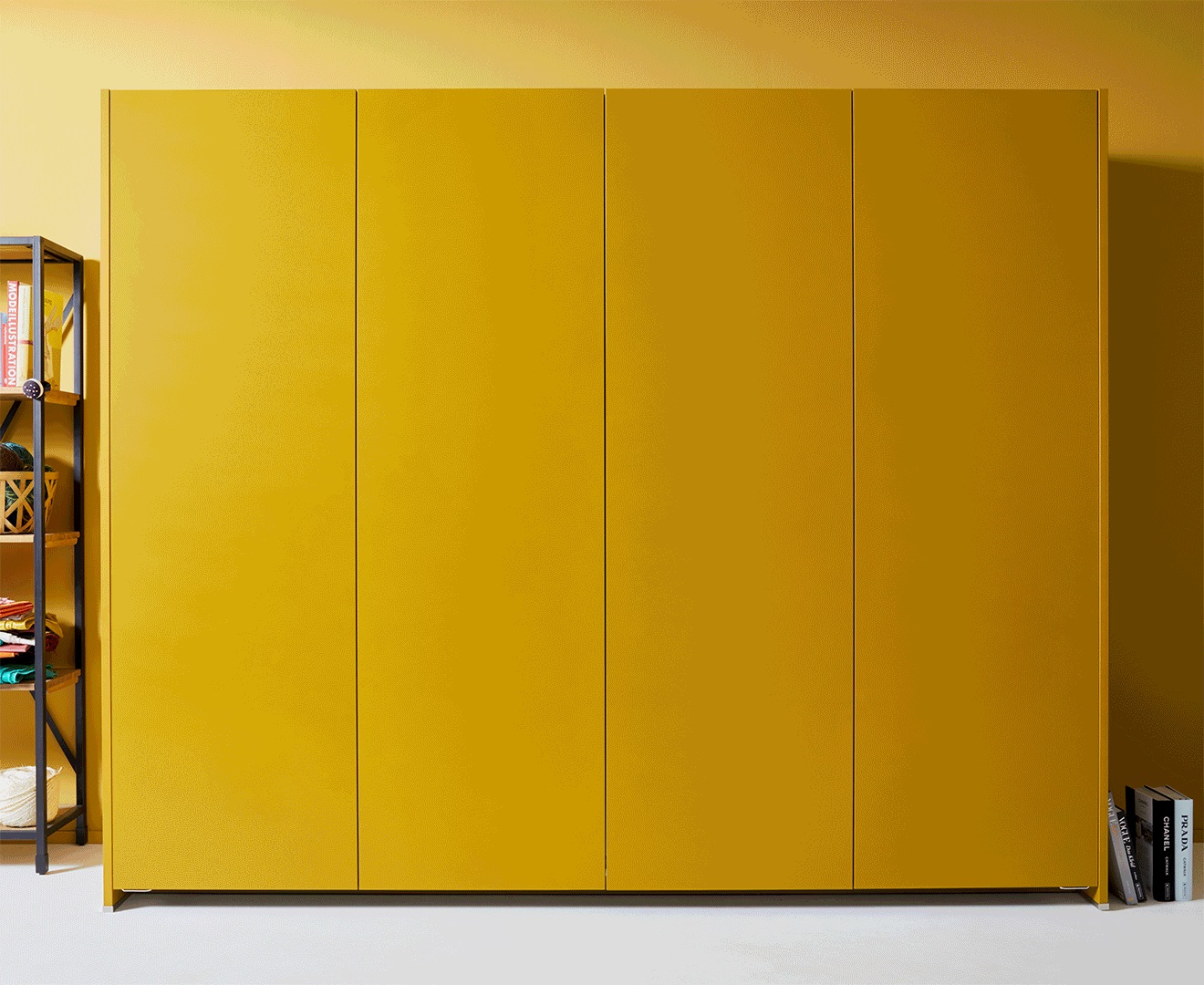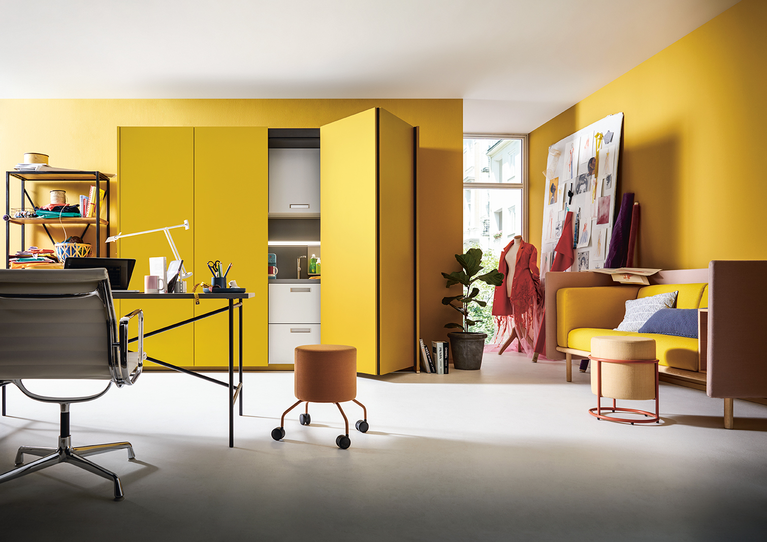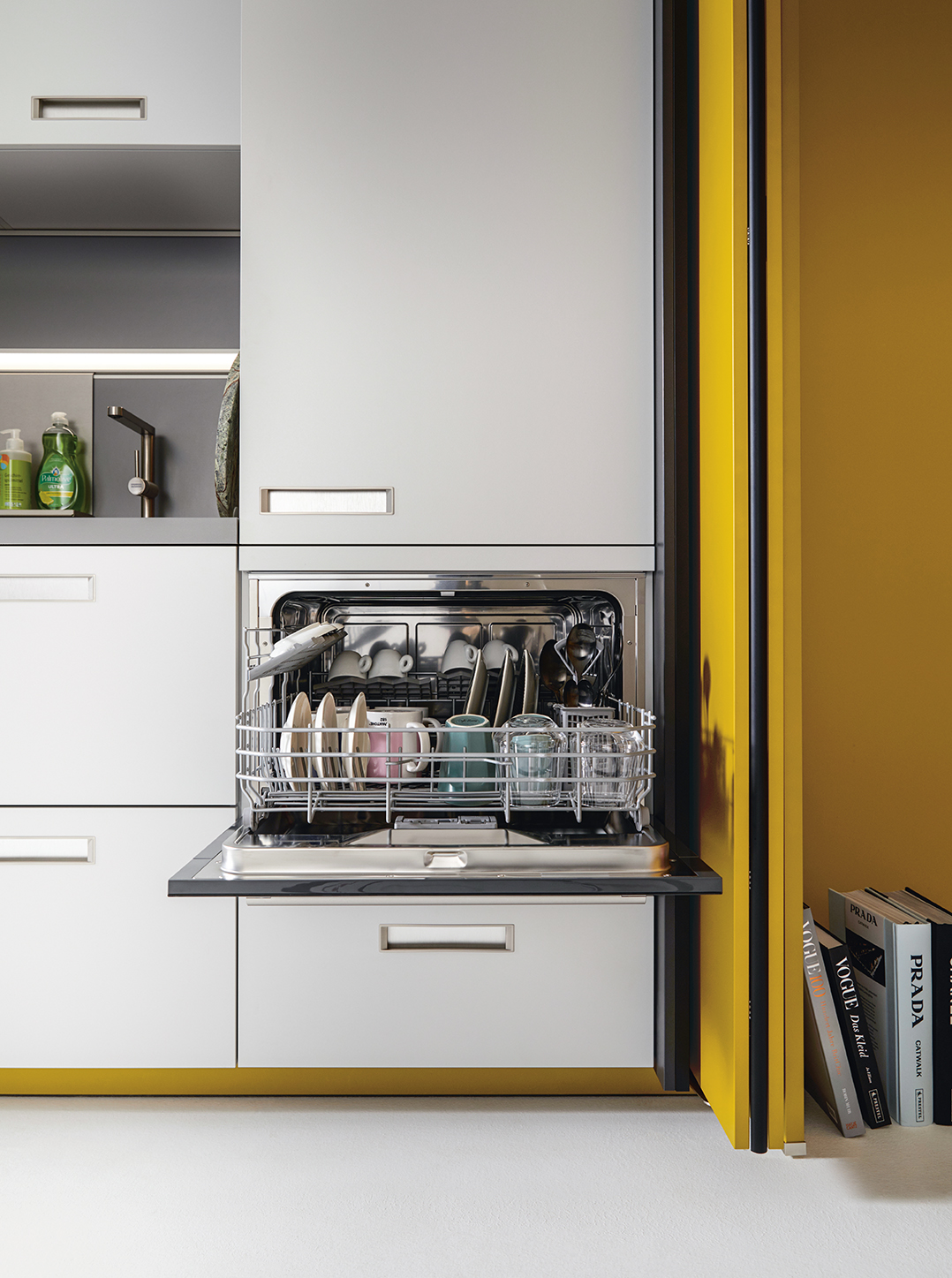 De NX505 kitchenette met fronten in vrolijk kerrie kleur combineert compacte functionaliteit, een huiselijk effect en onbeperkt kookplezier.