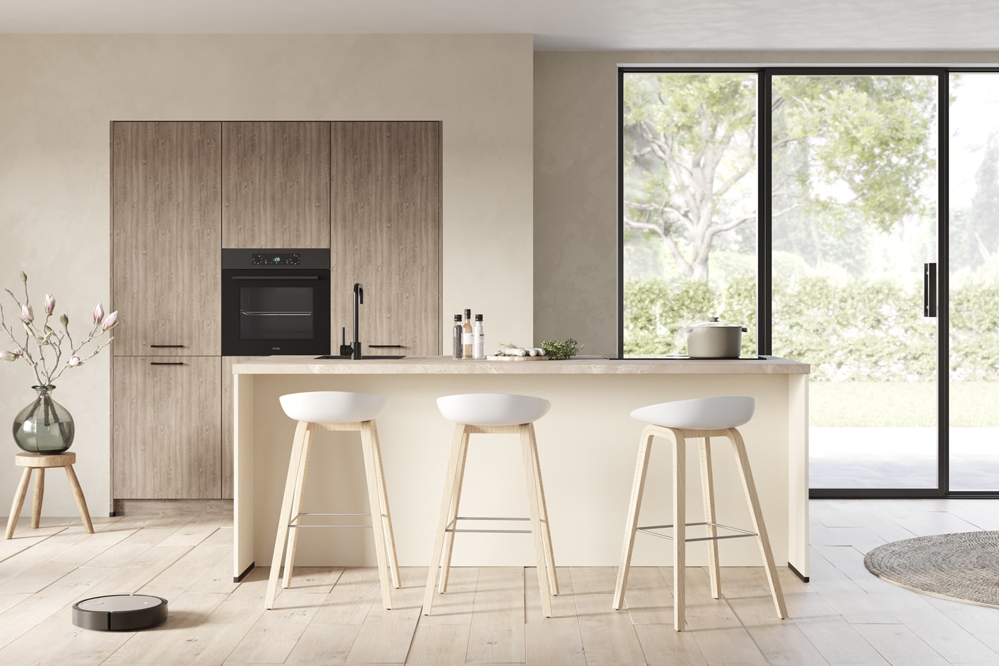 Een beige keuken creëert een serene en natuurlijke ambiance. De lichte tint van beige keukenkastjes weerkaatst het licht mooi, waardoor je keuken ruimtelijker aanvoelt — ideaal voor kleinere ruimtes. Door de bovenkasten weg te laten, versterk je dit effect nog meer. Een goed alternatief hiervoor is het installeren van een wandplank, waarmee je de ruimte open houdt en toch opbergruimte creëert. Heb je voorkeur voor meer opbergruimte waarin je spullen uit het zicht kunt bewaren? Overweeg dan een kastenwand. Dit biedt niet alleen veel opbergruimte, maar biedt ook de mogelijkheid om keukenapparatuur netjes in te bouwen. Neem bijvoorbeeld eens een kijkje naar onze eilandkeuken Rodez Eiken / Luanda Zand, die voorzien is van een elegante houten kastenwand.