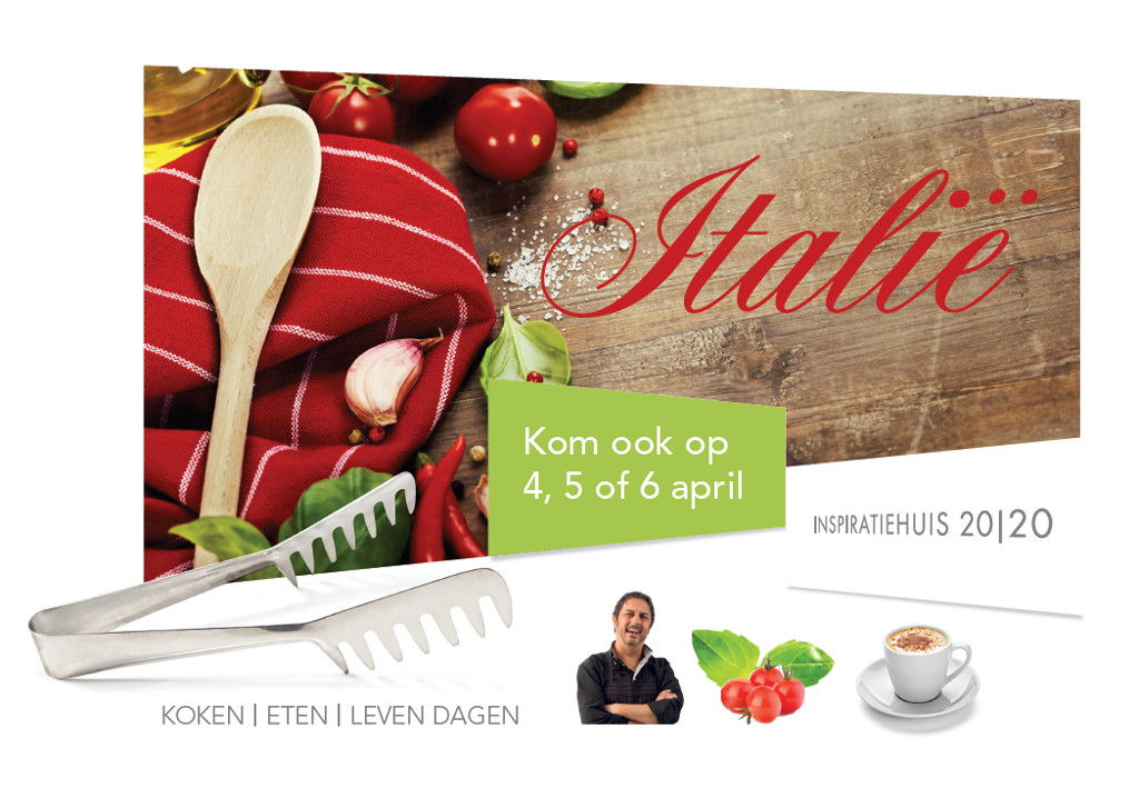Welkom in Italië. Proef de Chianti en de cappuccino, flaneer langs de pasta en pecorino en beleef de sfeer van ‘La Dolce Vita’. Het kan allemaal tijdens de Italiaanse koken|eten|leven dagen op 4, 5 en 6 april in inspiratiehuis 20|20.