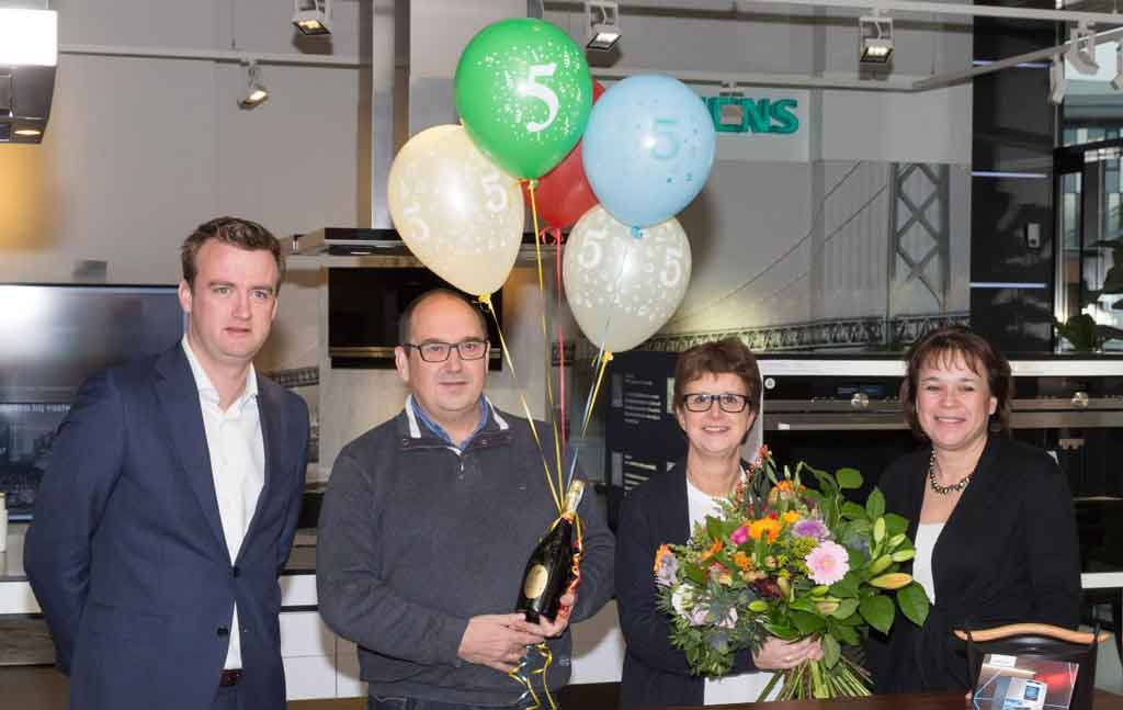 inspiratiehuis 20|20 verwelkomt vandaag de 100.000e bezoeker. Deze mijlpaal blijft niet onopgemerkt; de heer en mevrouw de Vries uit Hoofddorp werden verrast met een grote bos bloemen, een kookworkshop in inspiratiehuis 20|20 en een handige hakmolen voor in hun nieuwe keuken. Het is dubbel feest, want inspiratiehuis 20|20 viert deze maand haar lustrum. Al vijf jaar kunnen consumenten uit het hele land zich in Hoofddorp laten inspireren en zich oriënteren op nieuwe keuken - en huishoudapparatuur in de showrooms van Bosch, Siemens, Gaggenau en NEFF.
