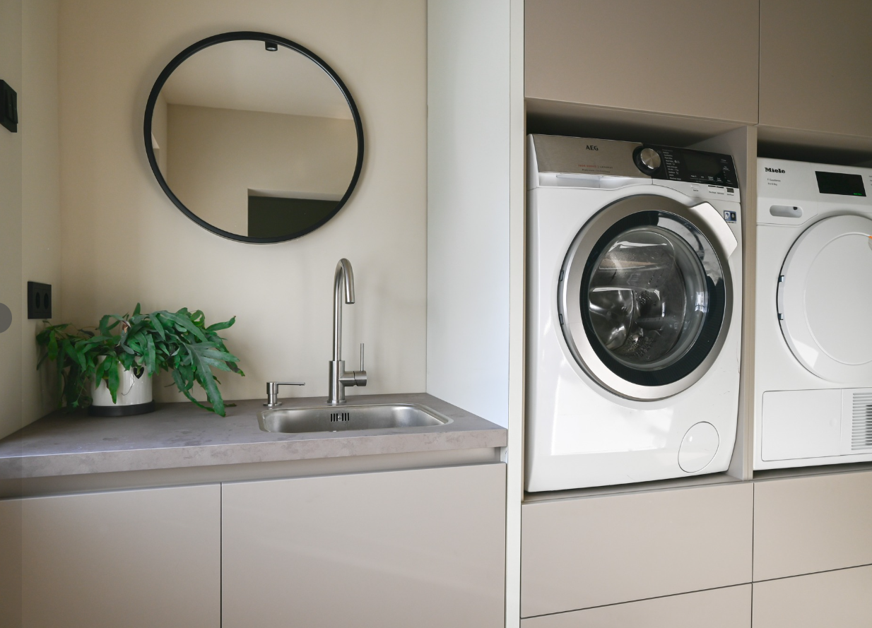 In dit project is een slimme en efficiënte indeling gerealiseerd, waarbij optimaal gebruik is gemaakt van de beschikbare ruimte. Het praktische aspect staat centraal, met een doordachte opstelling van de wasmachine en droger op ergonomische hoogte. Dit maakt het gebruik een stuk comfortabeler en voorkomt onnodig bukken.