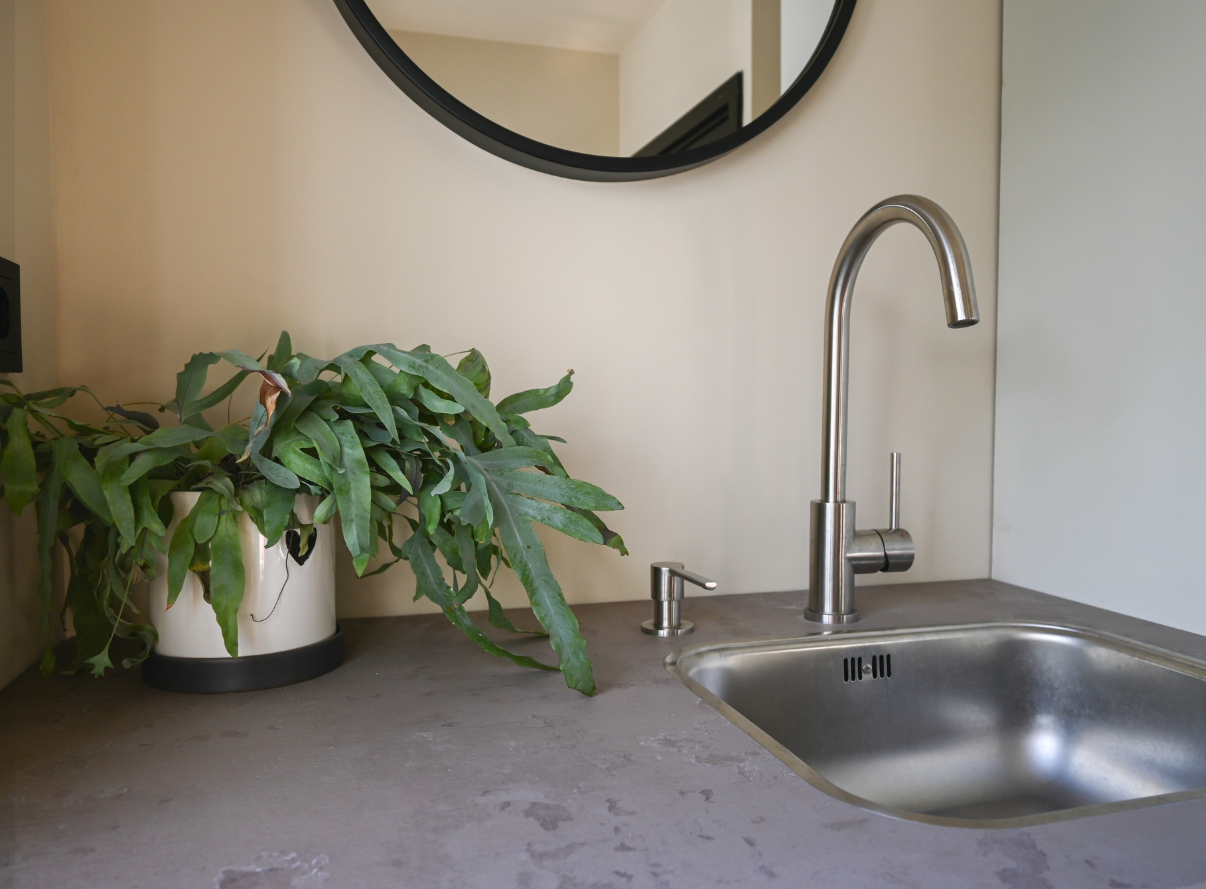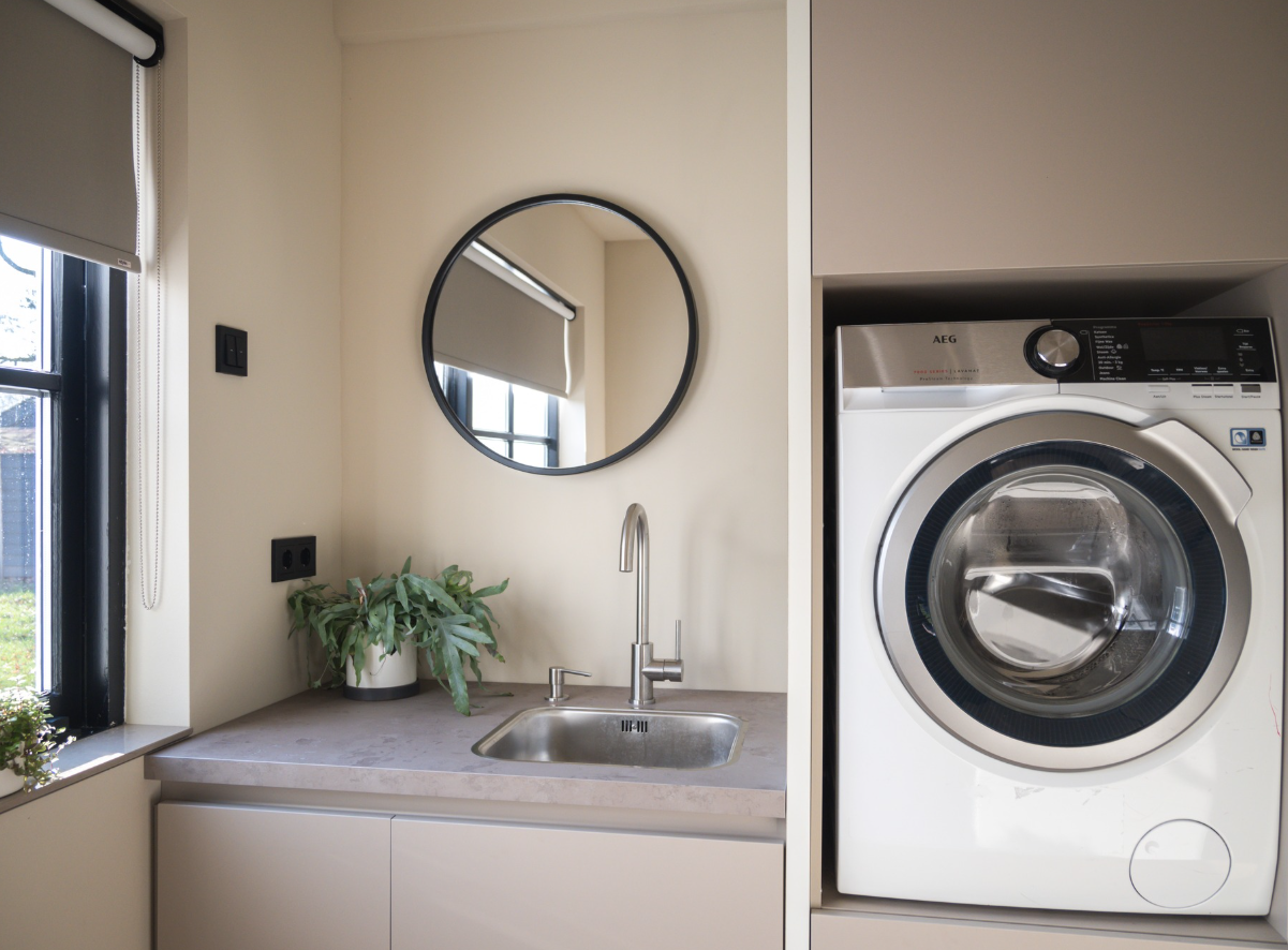 Wat deze ruimte extra bijzonder maakt, is het kleurgebruik. Zachte en lichte tinten creëren een frisse en uitnodigende sfeer, waardoor de bijkeuken niet alleen functioneel, maar ook esthetisch aantrekkelijk is. Een opgeruimde en prettige omgeving maakt dagelijkse klusjes net wat aangenamer.