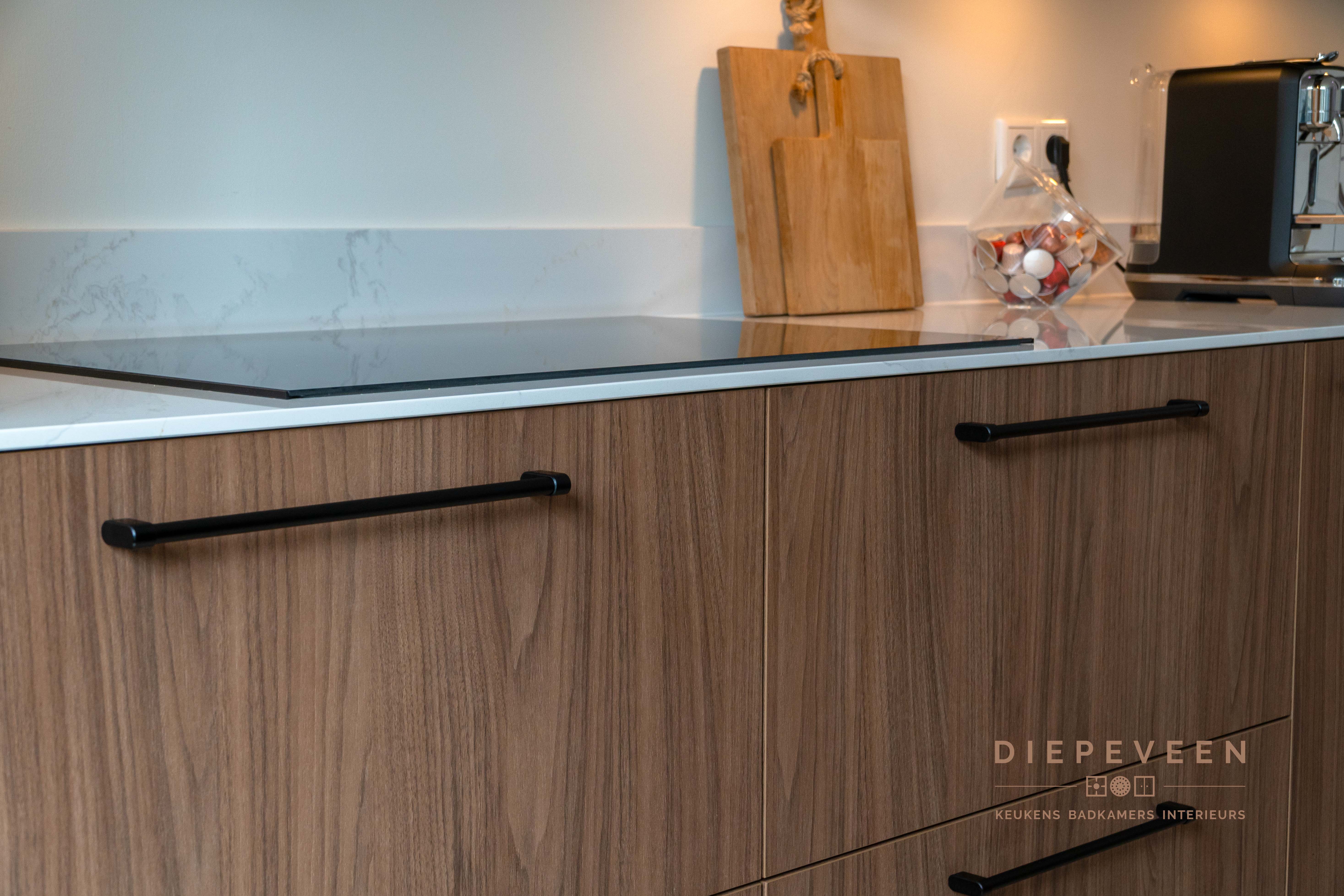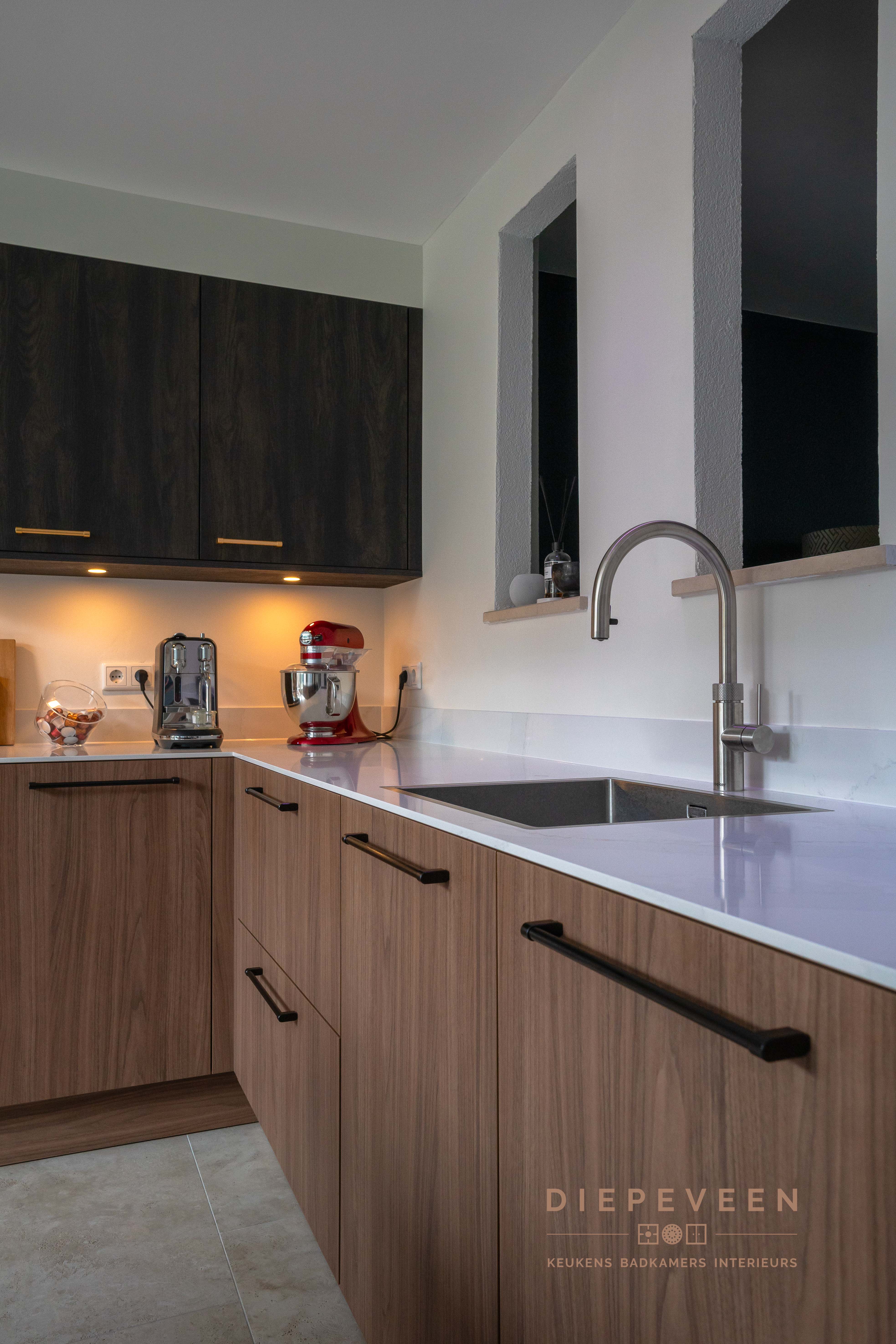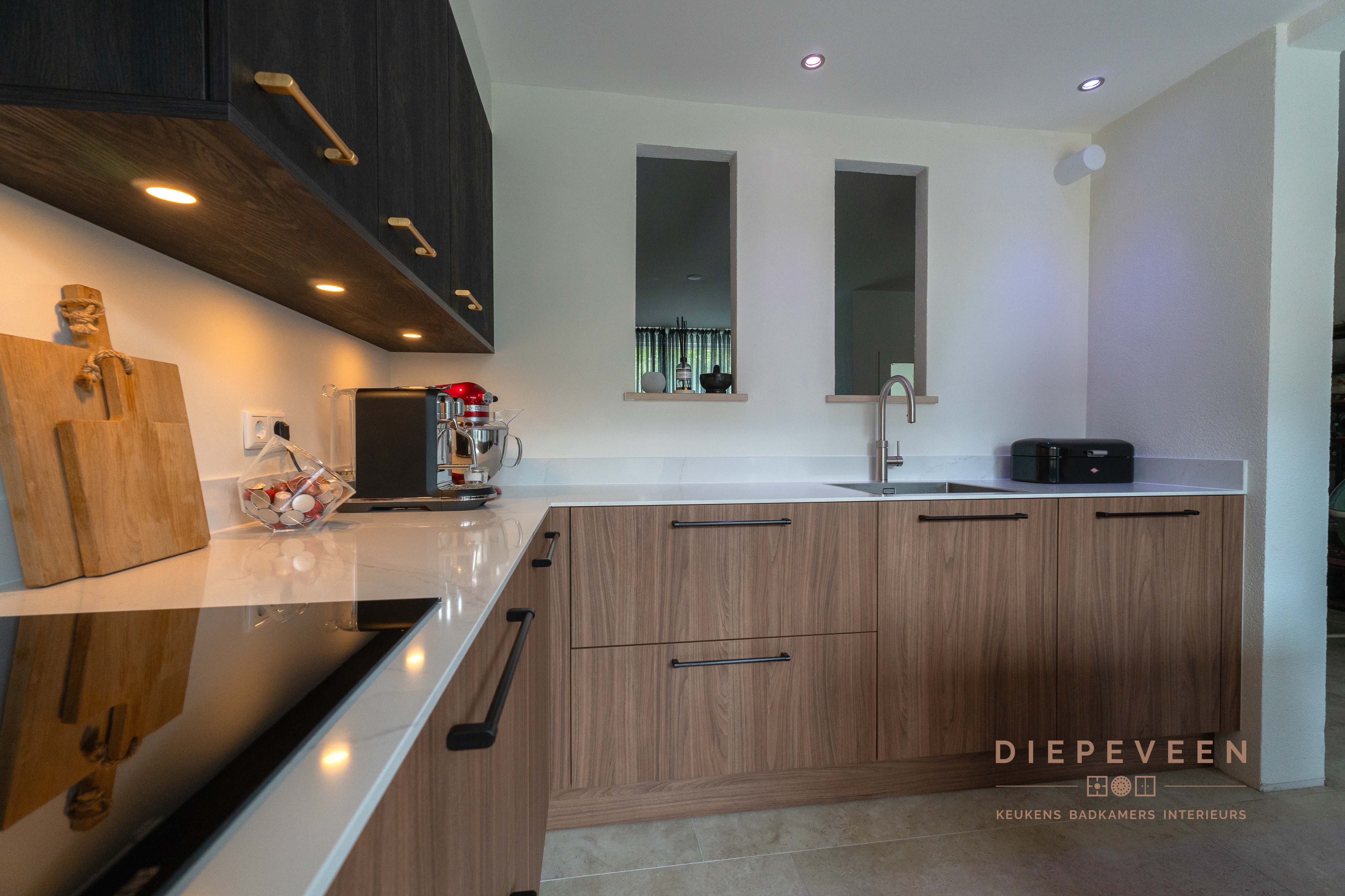 || RUIME HOUTLOOK KEUKEN || Uniek. Door te kiezen voor een keukenblok in het midden van de ruimte creëer je extra werkplek, dat is wat deze keuken uniek maakt! De kleurenvariatie in het hout maakt de gehele keuken modern en tijdloos. Het witte werkblad met een vleugje marmer er door heen zorgt voor een frisse touch. Geen gebrek aan opbergruimte omdat er ook is gedacht aan bovenkasten. Genoeg plek voor al je keukengerei!