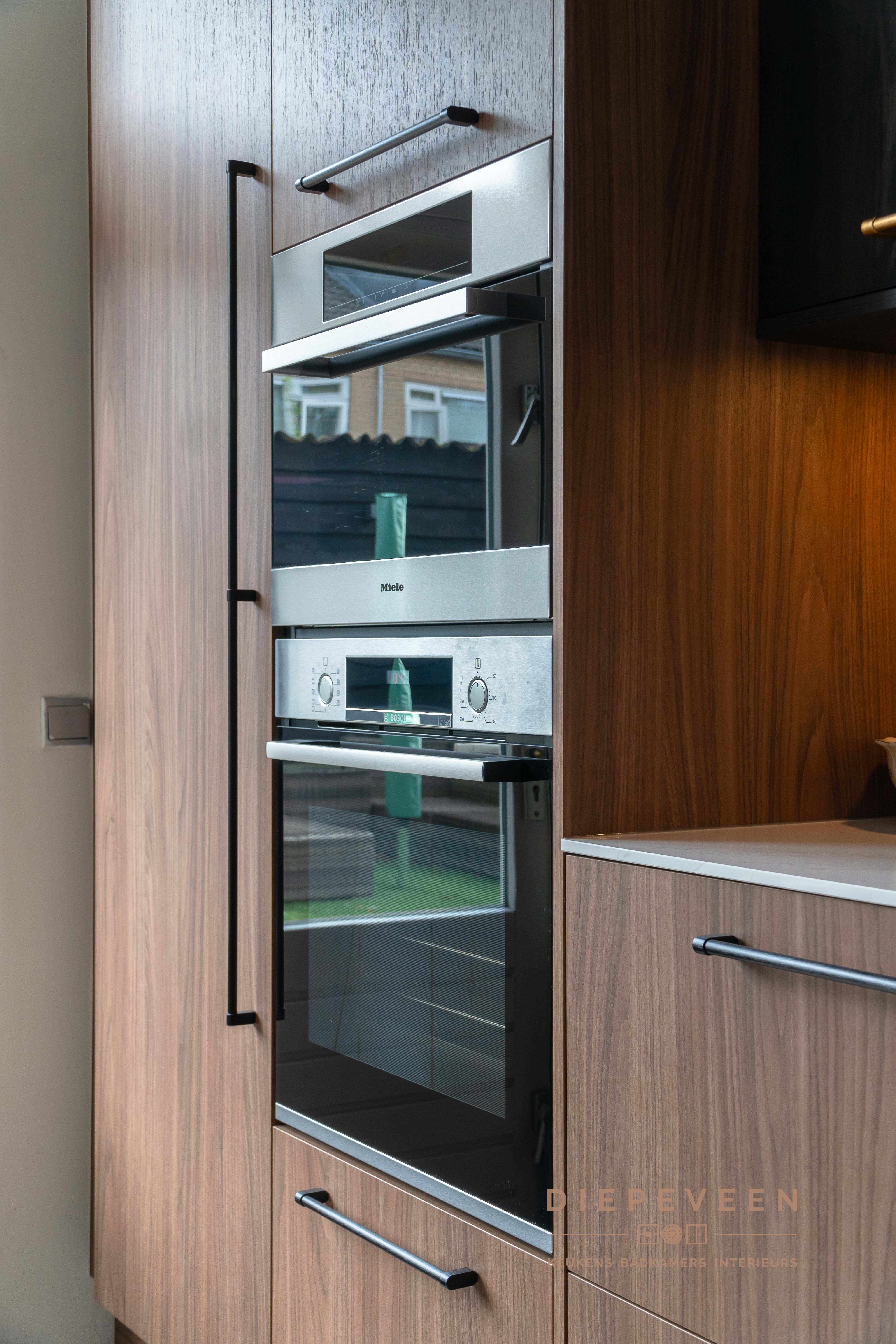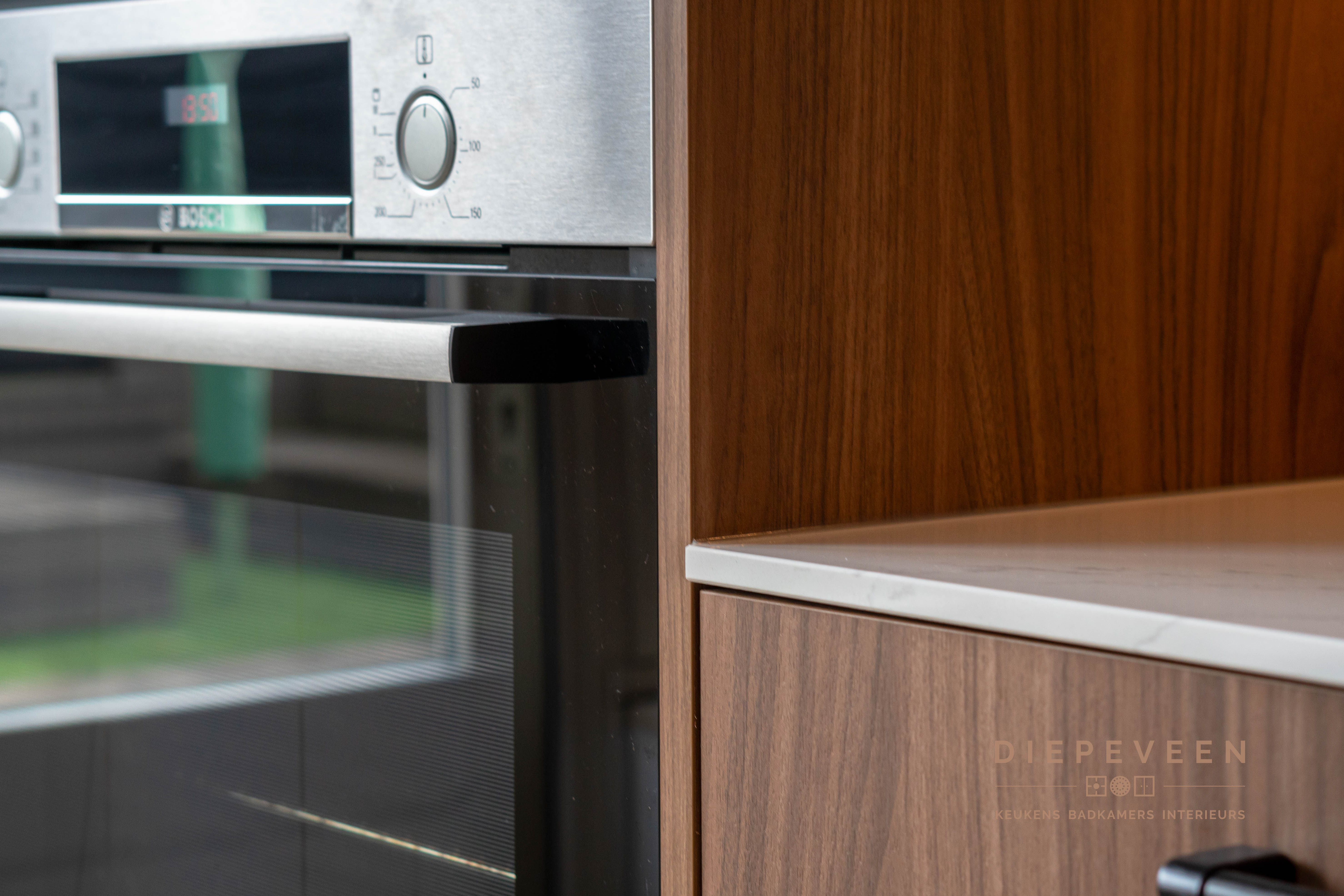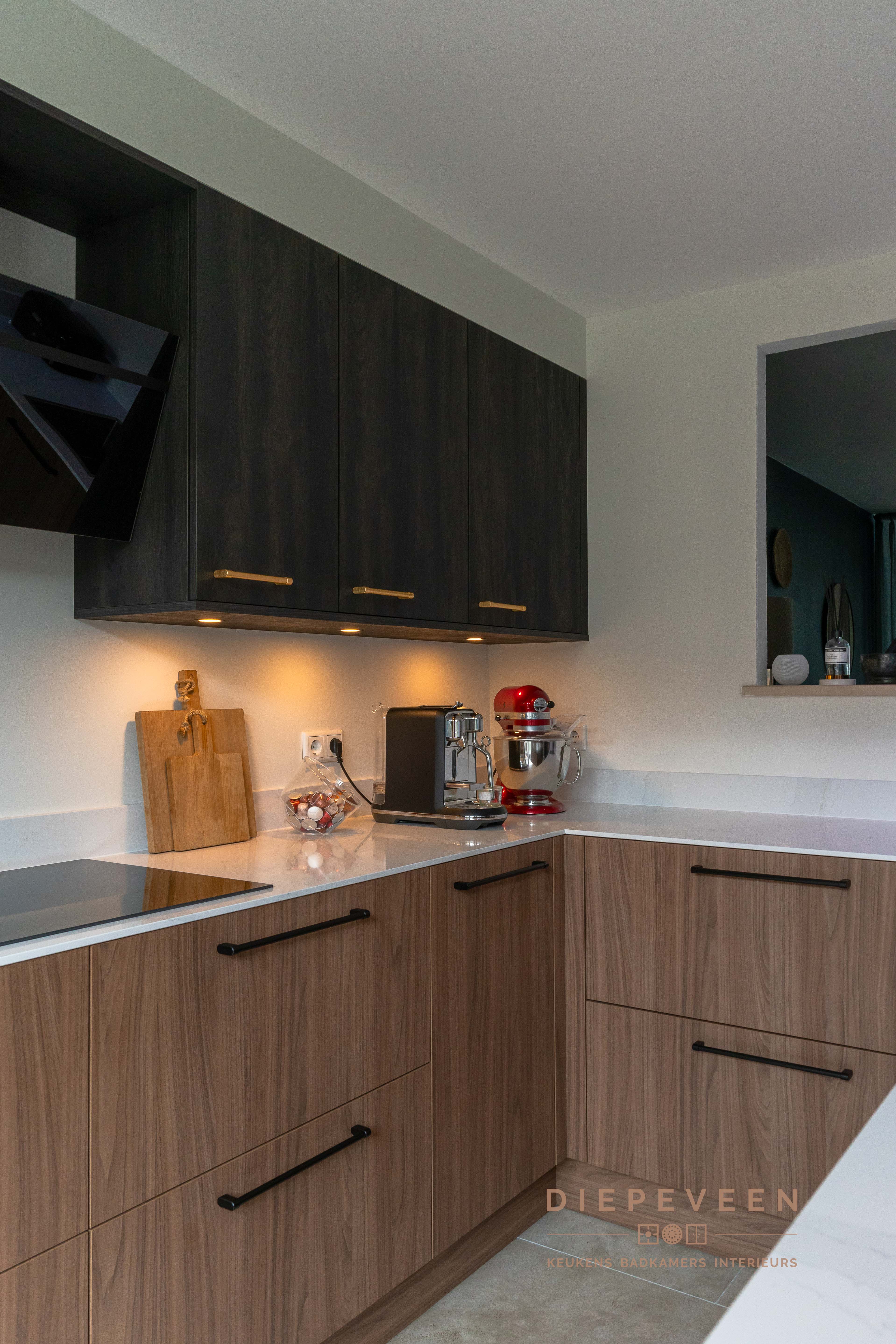 || RUIME HOUTLOOK KEUKEN || Uniek. Door te kiezen voor een keukenblok in het midden van de ruimte creëer je extra werkplek, dat is wat deze keuken uniek maakt! De kleurenvariatie in het hout maakt de gehele keuken modern en tijdloos. Het witte werkblad met een vleugje marmer er door heen zorgt voor een frisse touch. Geen gebrek aan opbergruimte omdat er ook is gedacht aan bovenkasten. Genoeg plek voor al je keukengerei!
