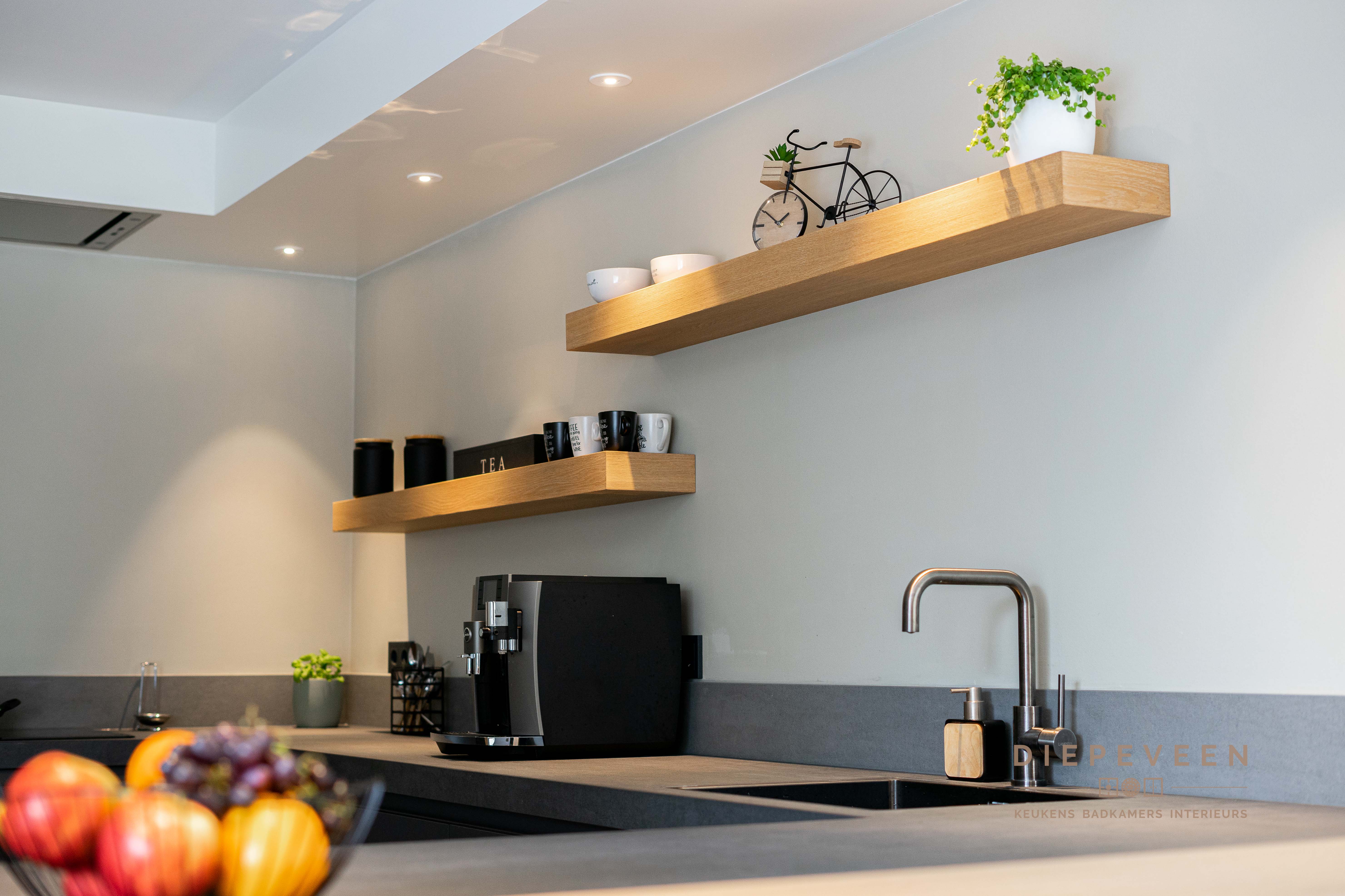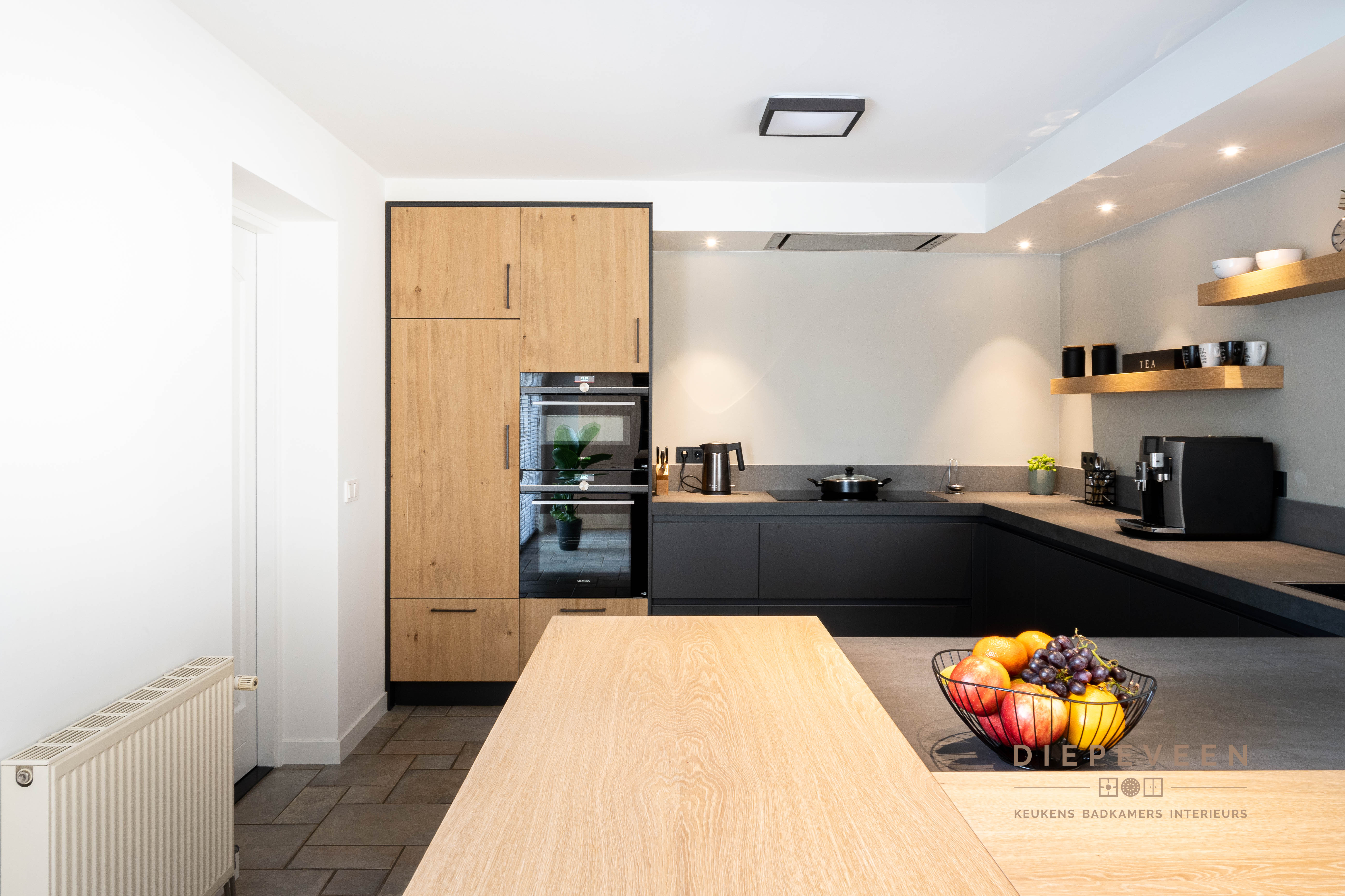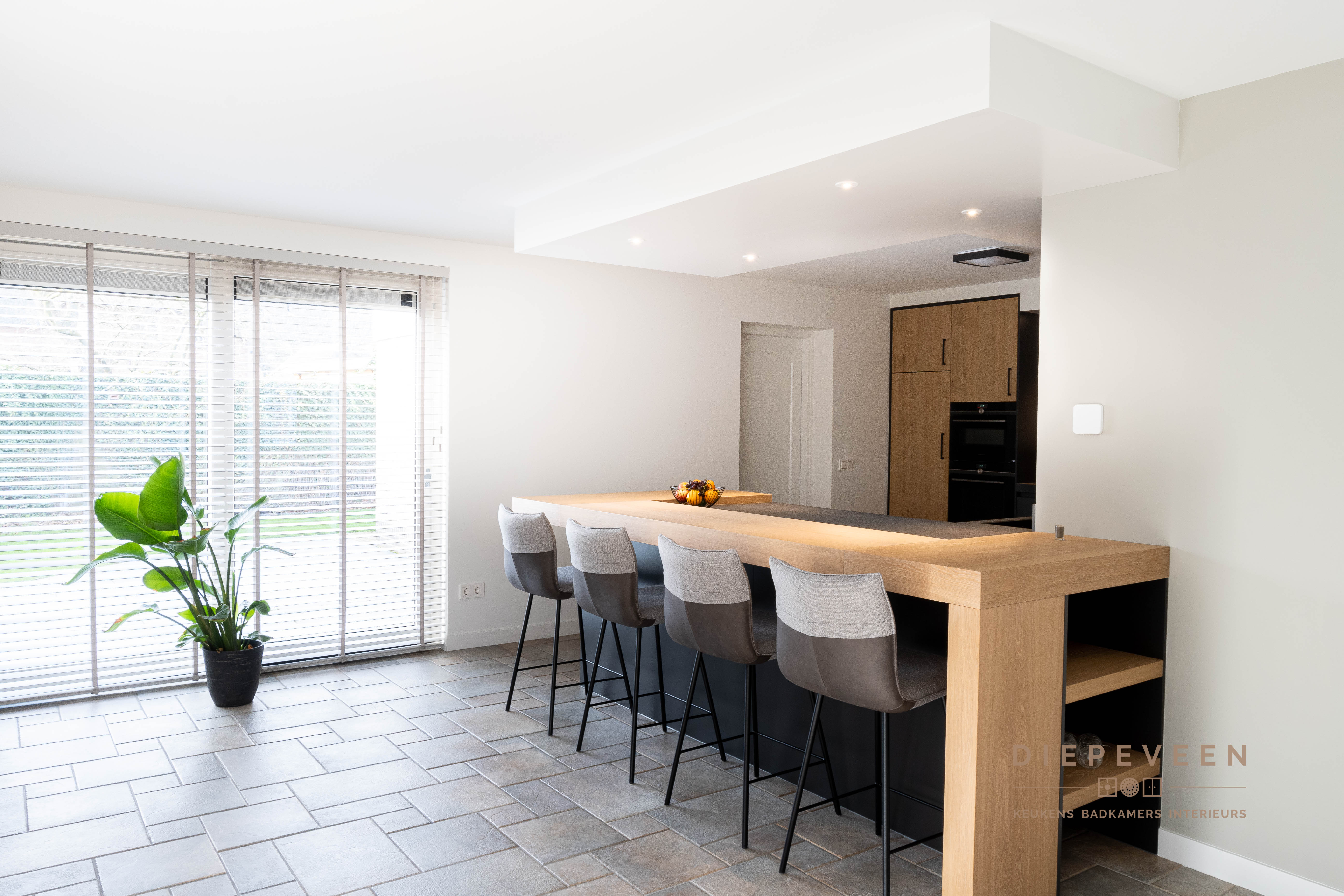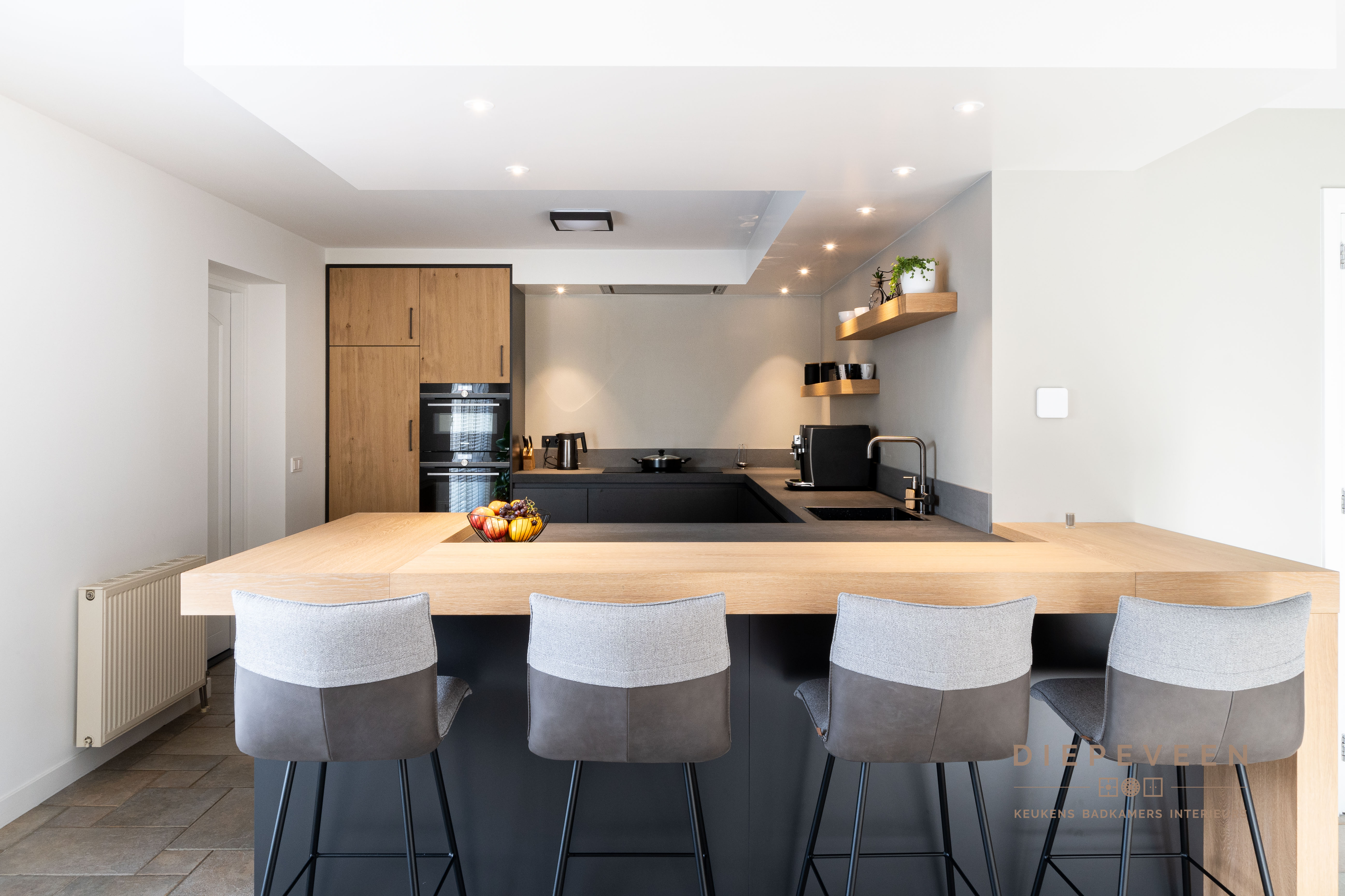 In deze ruime woonkeuken geniet je van de overvloed aan ruimte en opbergruimte. Het keukenapparatuur is op hoogte geplaatst wat zorgt voor extra gemak. Het schiereiland is omlijst met een dikke houten design plank. Waarbij de design planken boven het werkblad een mooi geheel creëert. De keuken is afgemaakt met gezellige spotjes. Kortom, een warme woonkeuken om elke dag weer optimaal van te genieten!