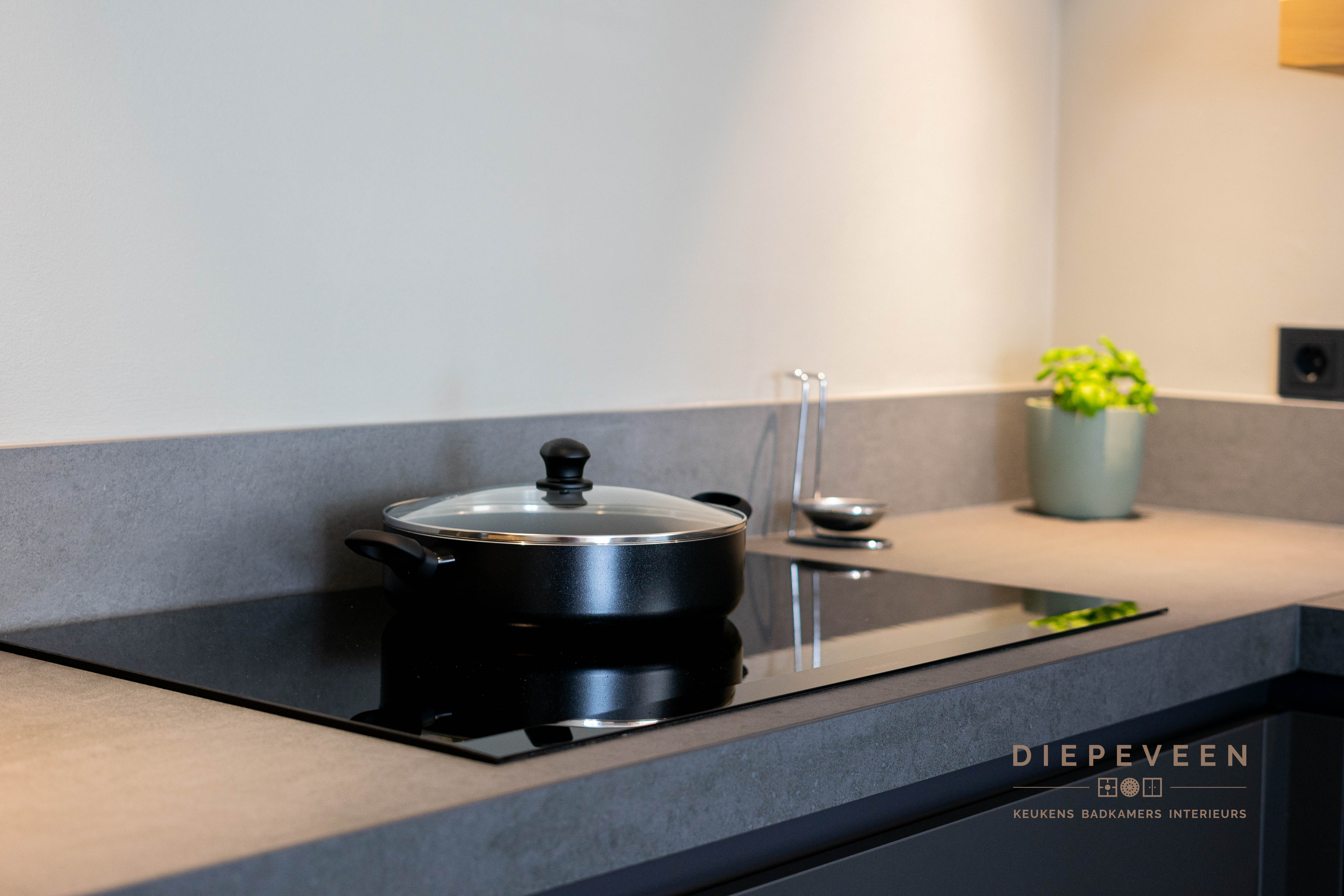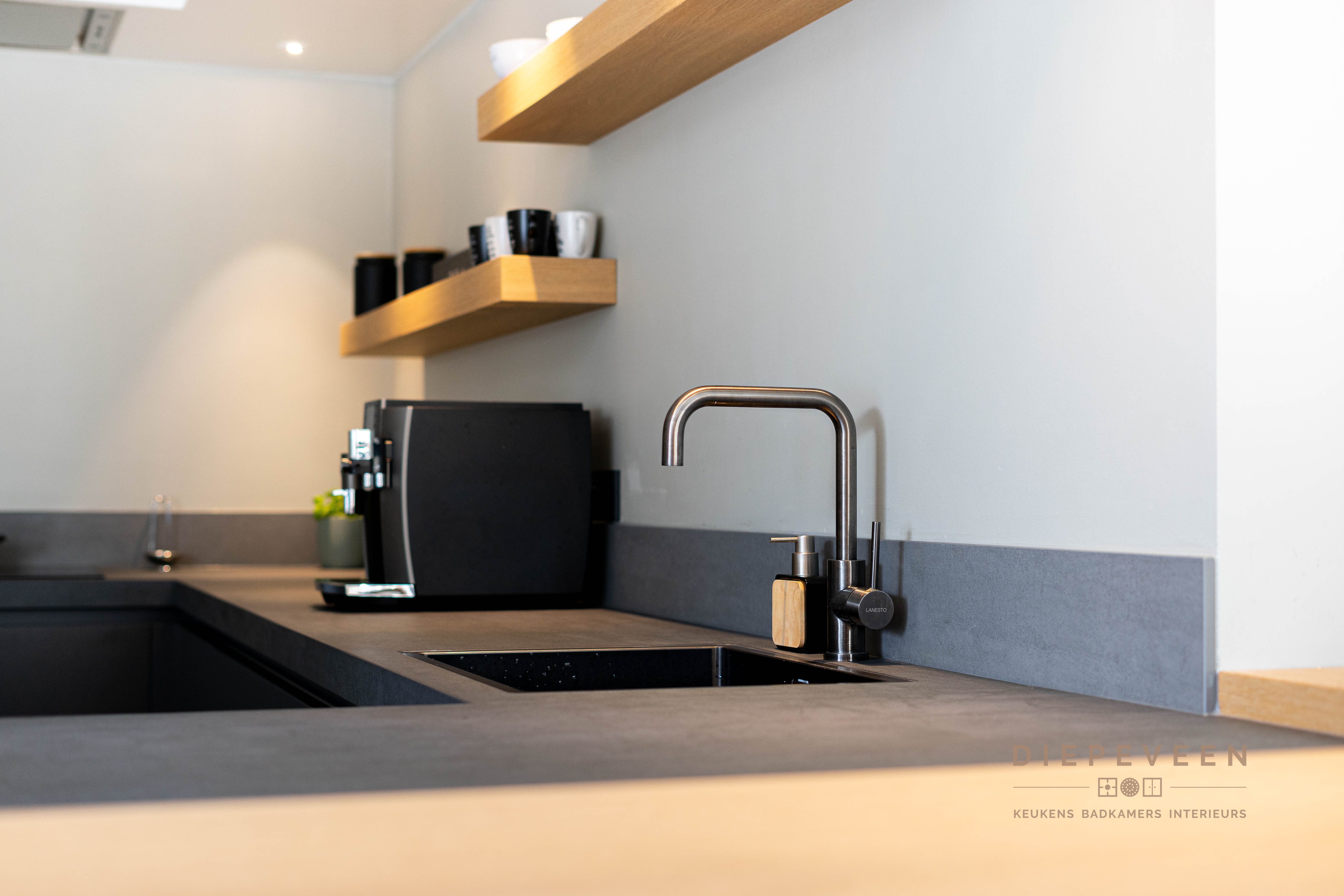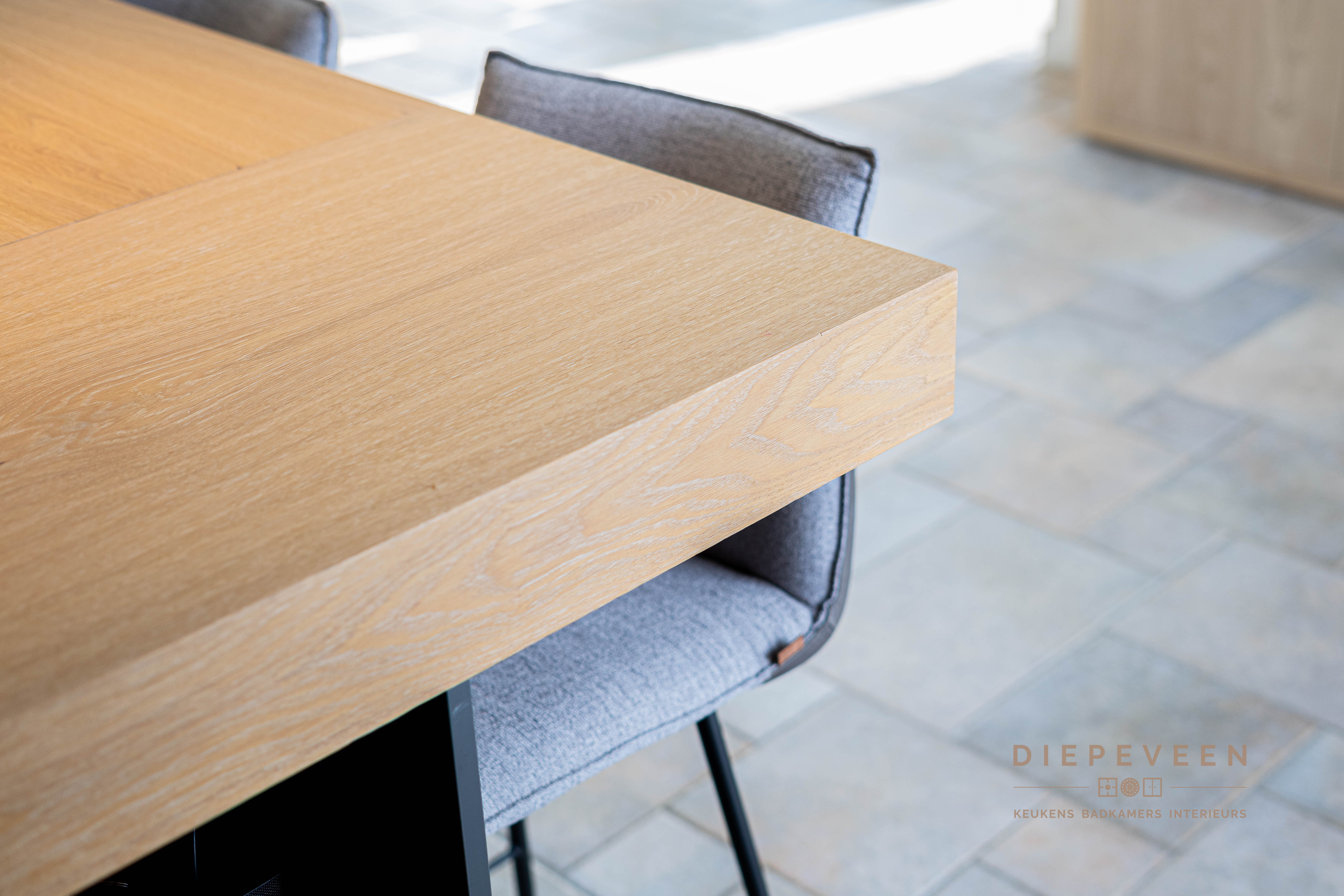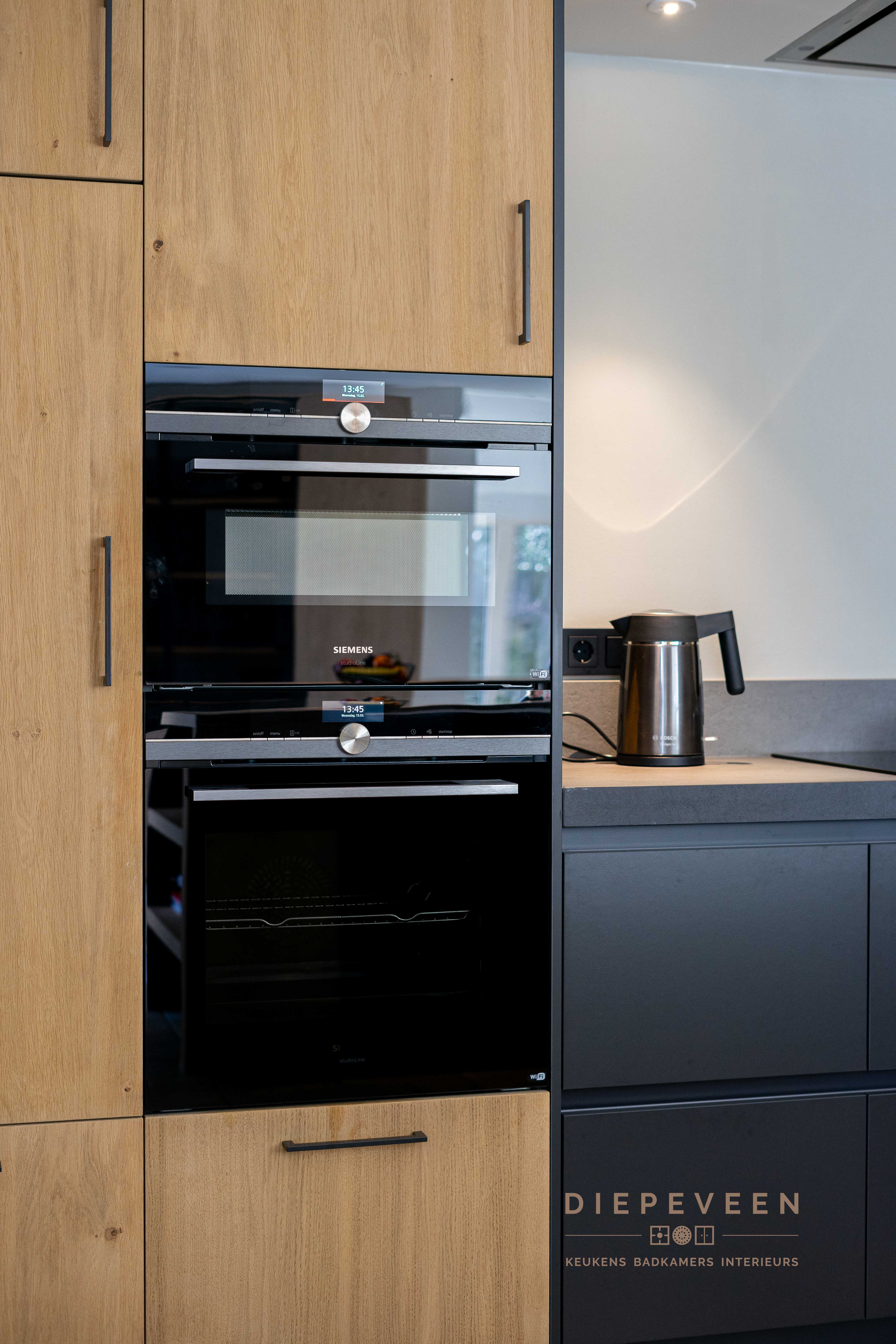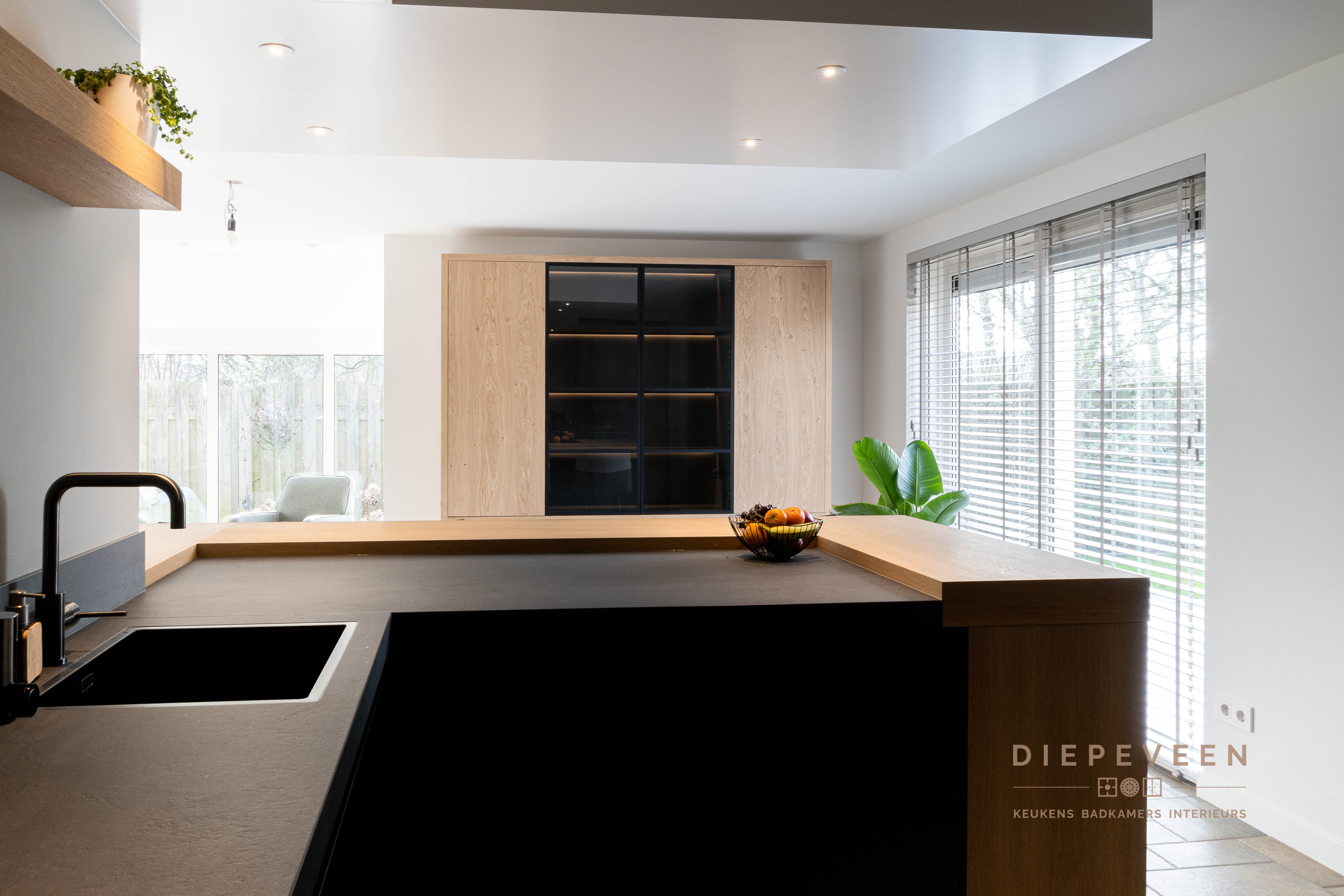 In deze ruime woonkeuken geniet je van de overvloed aan ruimte en opbergruimte. Het keukenapparatuur is op hoogte geplaatst wat zorgt voor extra gemak. Het schiereiland is omlijst met een dikke houten design plank. Waarbij de design planken boven het werkblad een mooi geheel creëert. De keuken is afgemaakt met gezellige spotjes. Kortom, een warme woonkeuken om elke dag weer optimaal van te genieten!