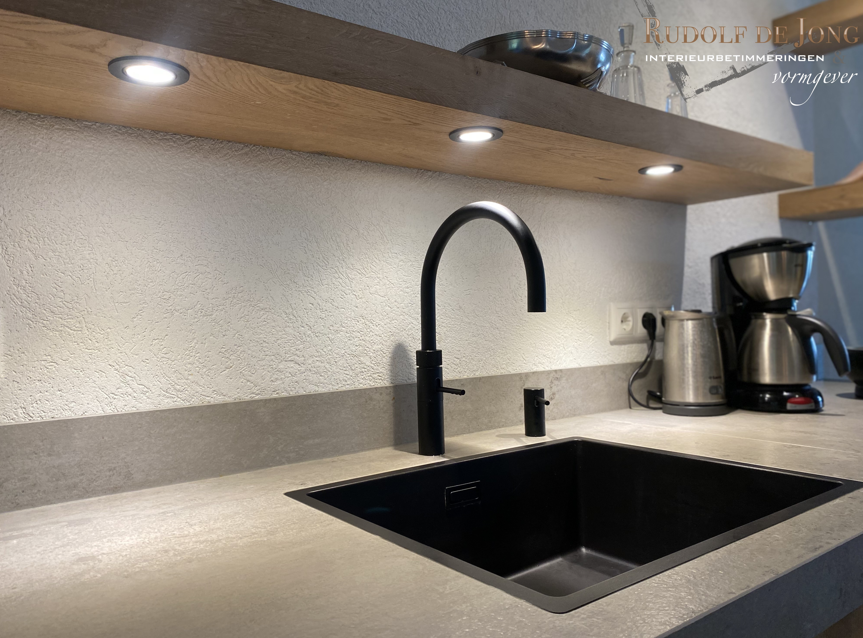 Rustieke, eikenhouten keuken met een keramiek aanrechtblad en stoere metalen handgrepen. De vrijdragende planken zijn voorzien van led-spots.