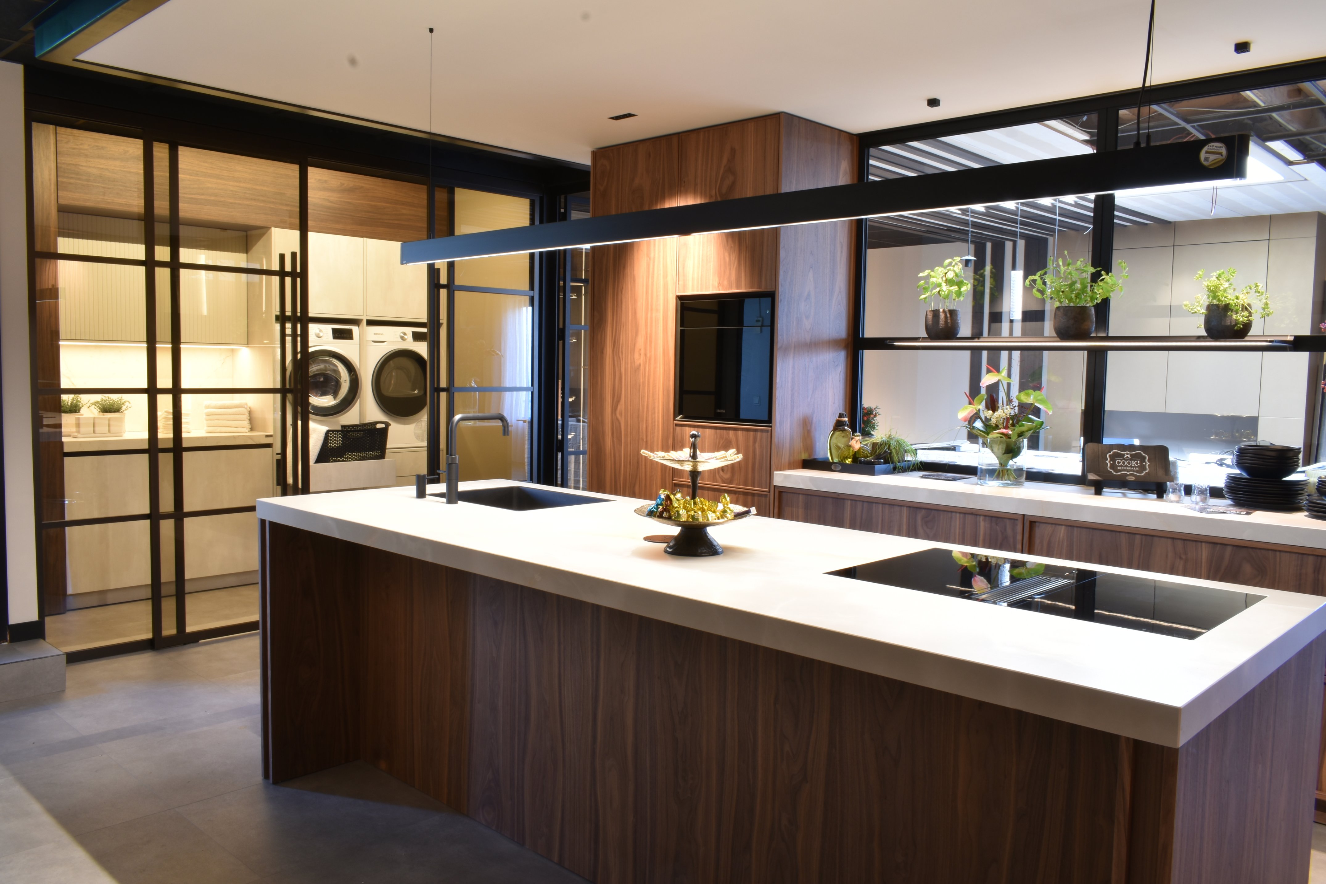 In deze keuken is gekozen voor een Smeg inductiefornuis, het Victoria-model van 90 cm met vijf kookzones en drie ovens in zwart. Dit fornuis versterkt de landelijke uitstraling van de keuken. Daarnaast zijn er een AEG koelkast, vriezer en vaatwasser geplaatst en een ingebouwde afzuigkap van Novy.