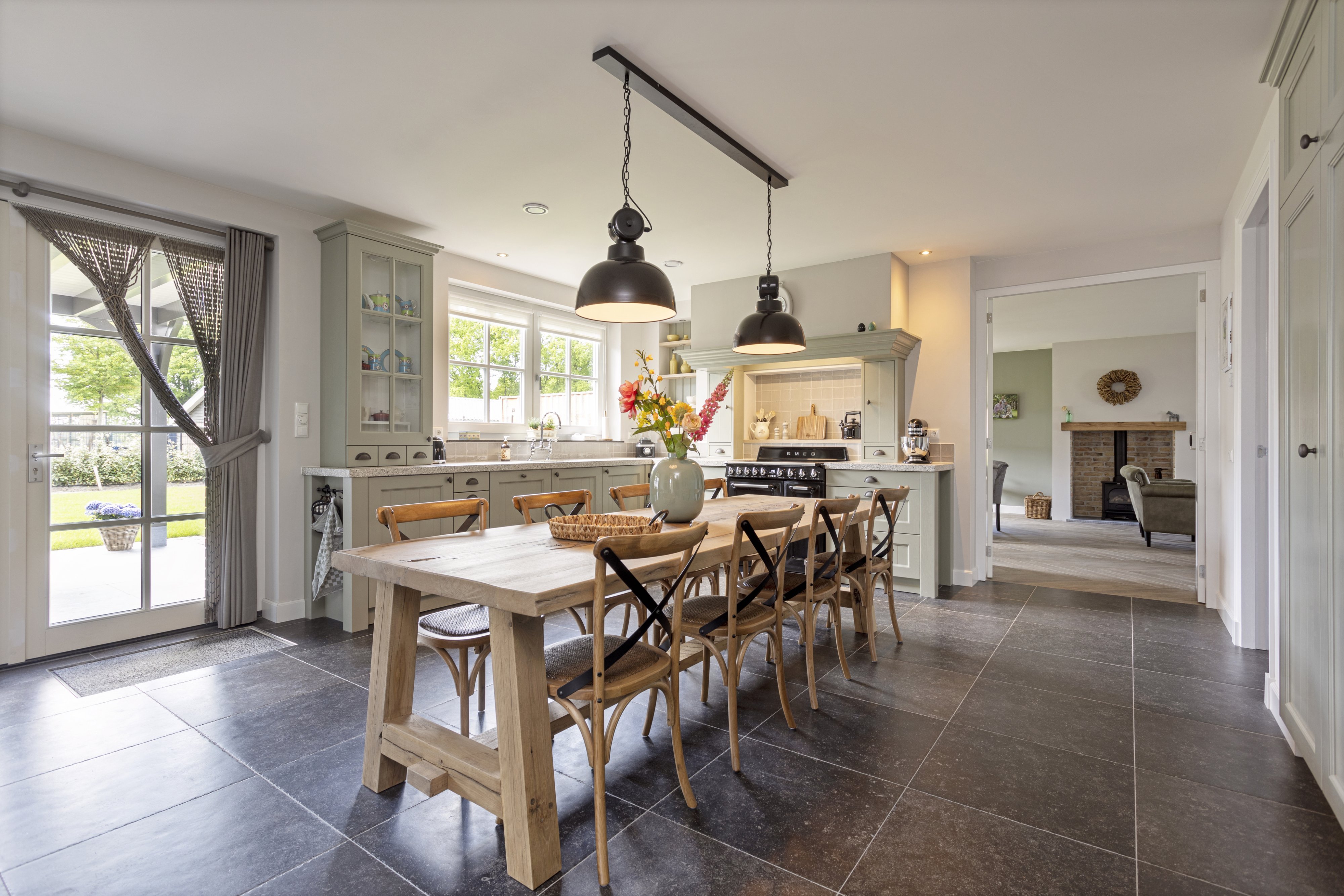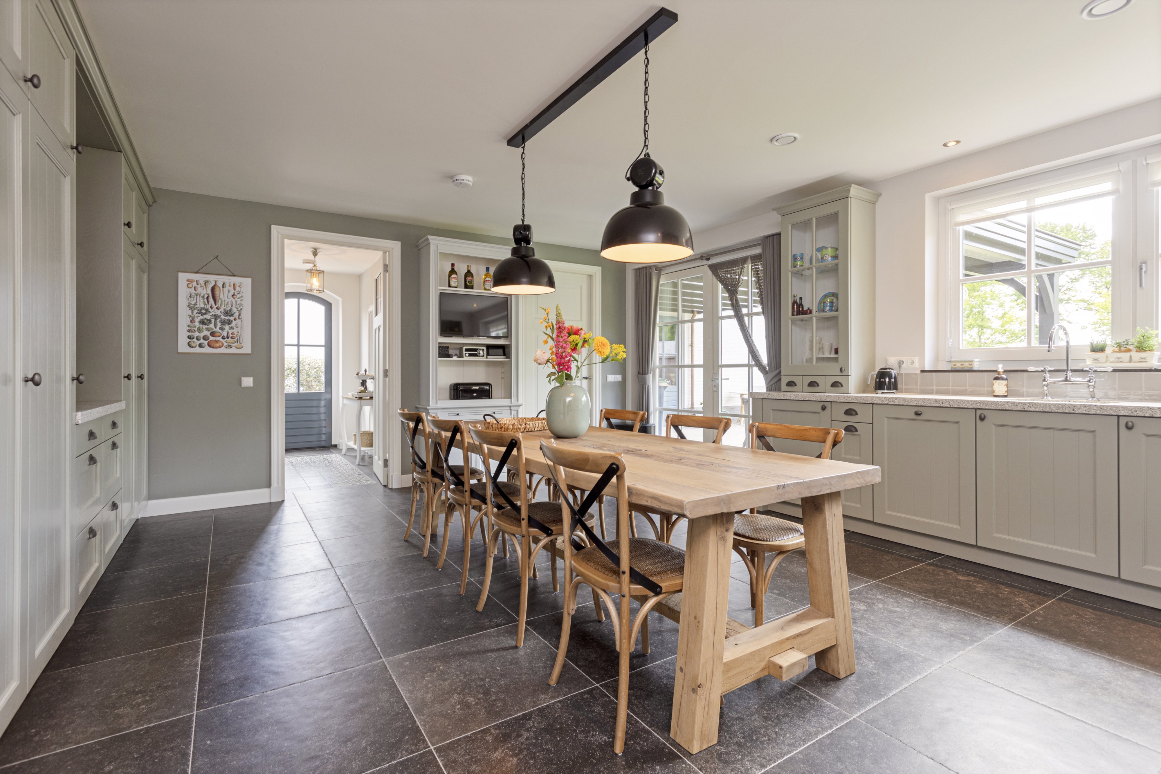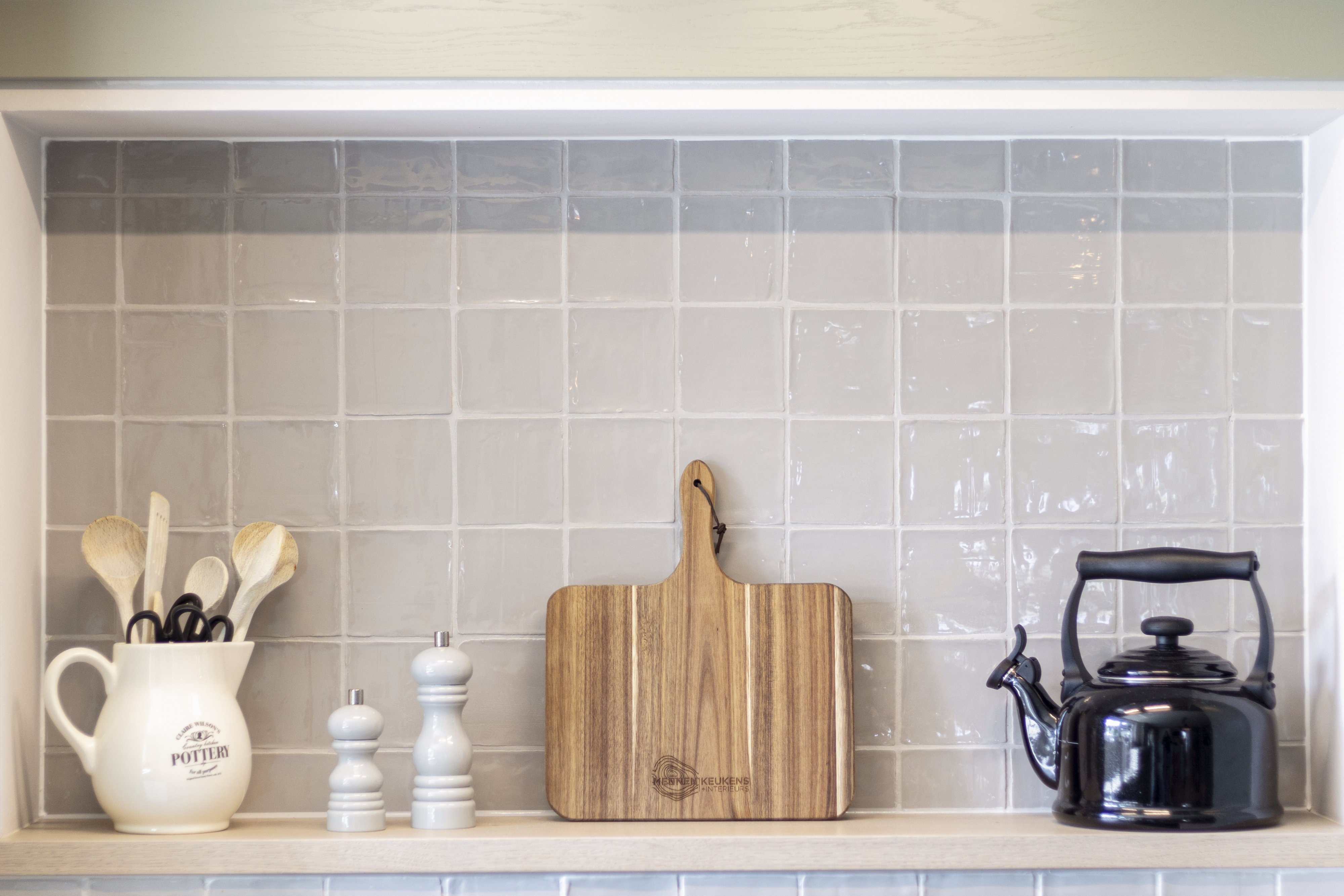 Wat meteen opvalt aan deze landelijke keuken is de grijsgroene kleur, die zowel in de fronten als in de details van de rest van de ruimte terugkomt. Deze bijzondere tint sluit perfect aan bij de stijl van de keuken, het terrazzo werkblad en de tegelspoelbak. De keuken is uitgerust met Kent fronten, wat zorgt voor een klassieke, landelijke uitstraling.