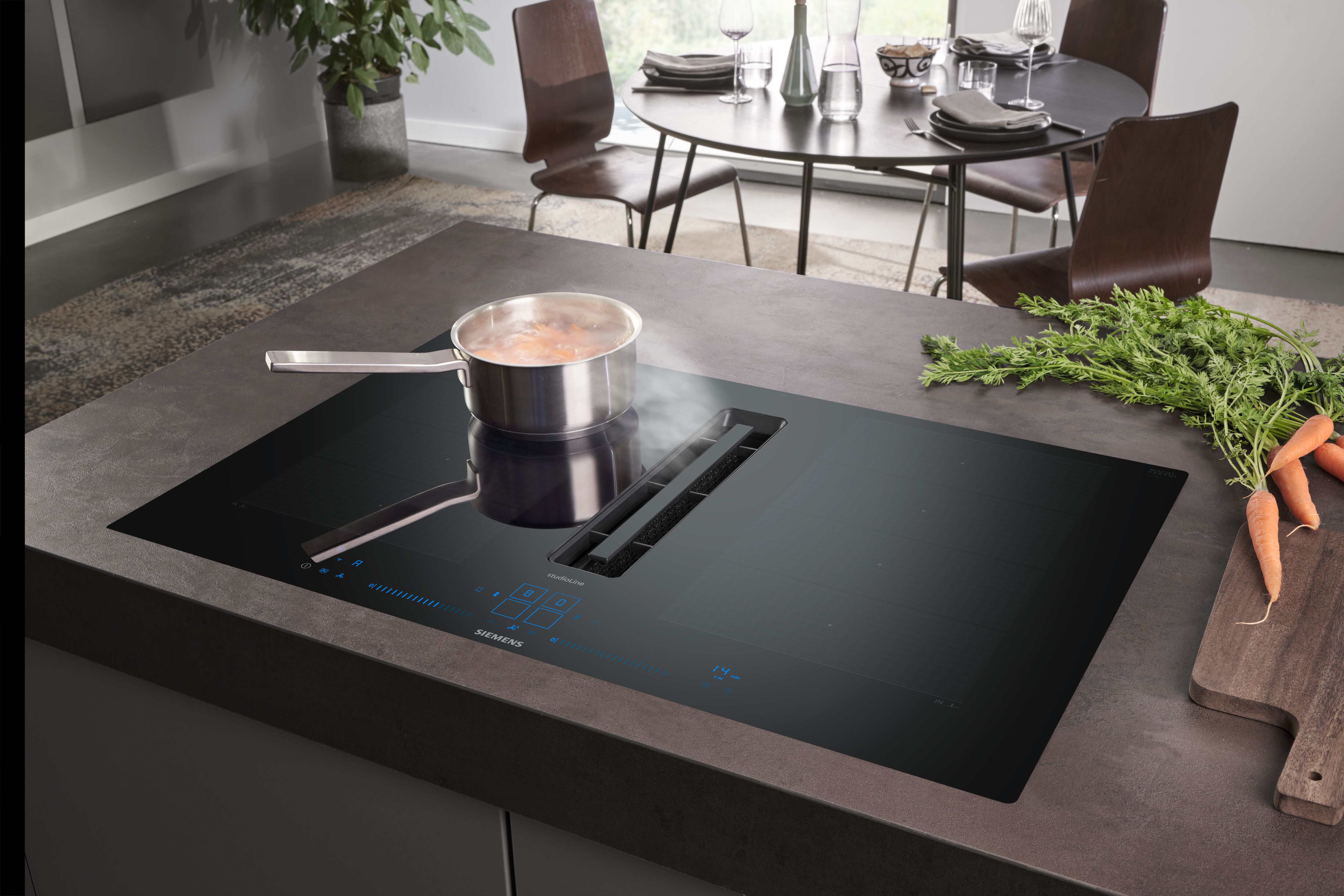 De revolutionaire Siemens inductionAir Plus combineert twee geweldige apparaten: een inductiekookplaat met flexibele kookzones en een krachtige afzuiging. De consumentenbond heeft de Siemens EX807NX68E in 2023 met een 7.8 verkozen tot de beste uit de test in de categorie inductiekookplaat met geïntegreerde afzuiging. De ideale 2-in-1 oplossing van kookplaat én afzuigkap in een strak design.
