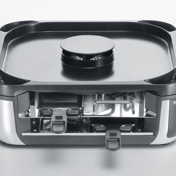 Het digitale aanraakscherm met helder LED-display maakt het instellen van zowel de temperatuur als de filtersterkte moeiteloos. De raclette heeft een modern design, met een fraaie afwerking in geborsteld staal en zwarte accenten. En na afloop mogen de grillplaat en pannetjes gewoon in de vaatwasser.