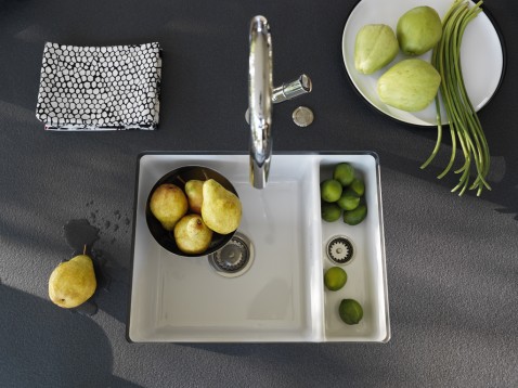 In het dagelijks gebruik in de badkamer heeft keramiek al lang bewezen dat het een robuust materiaal is. In de keuken worden echter nog hogere eisen gesteld. Daarom heeft Duravit DuraCeram ontwikkeld, een gepatenteerde speciale substantie die anders is dan de fijne vuurklei die meestal wordt gebruikt voor keukenspoelbakken. DuraCeram heeft een hogere slagvastheid en is door zijn hoogwaardige kwaliteit perfect voor toepassingen in de keuken. Phoenix Design voelde zich uitgedaagd om de bijzondere eigenschappen van keramiek uit te buiten: “We hadden ons voorgenomen om de spoelbak hoogwaardiger te maken en een relatie te leggen met servies of vergelijkbare hoogwaardige keukenaccessoires die je graag gebruikt of op tafel zet. Werken met keramiek is fascinerend: je kunt vormen creëren die eruitzien alsof ze met de hand gemaakt zijn. Tegelijkertijd stralen ontwerpen in keramiek ook helderheid en precisie uit, zonder technisch aan te doen.”