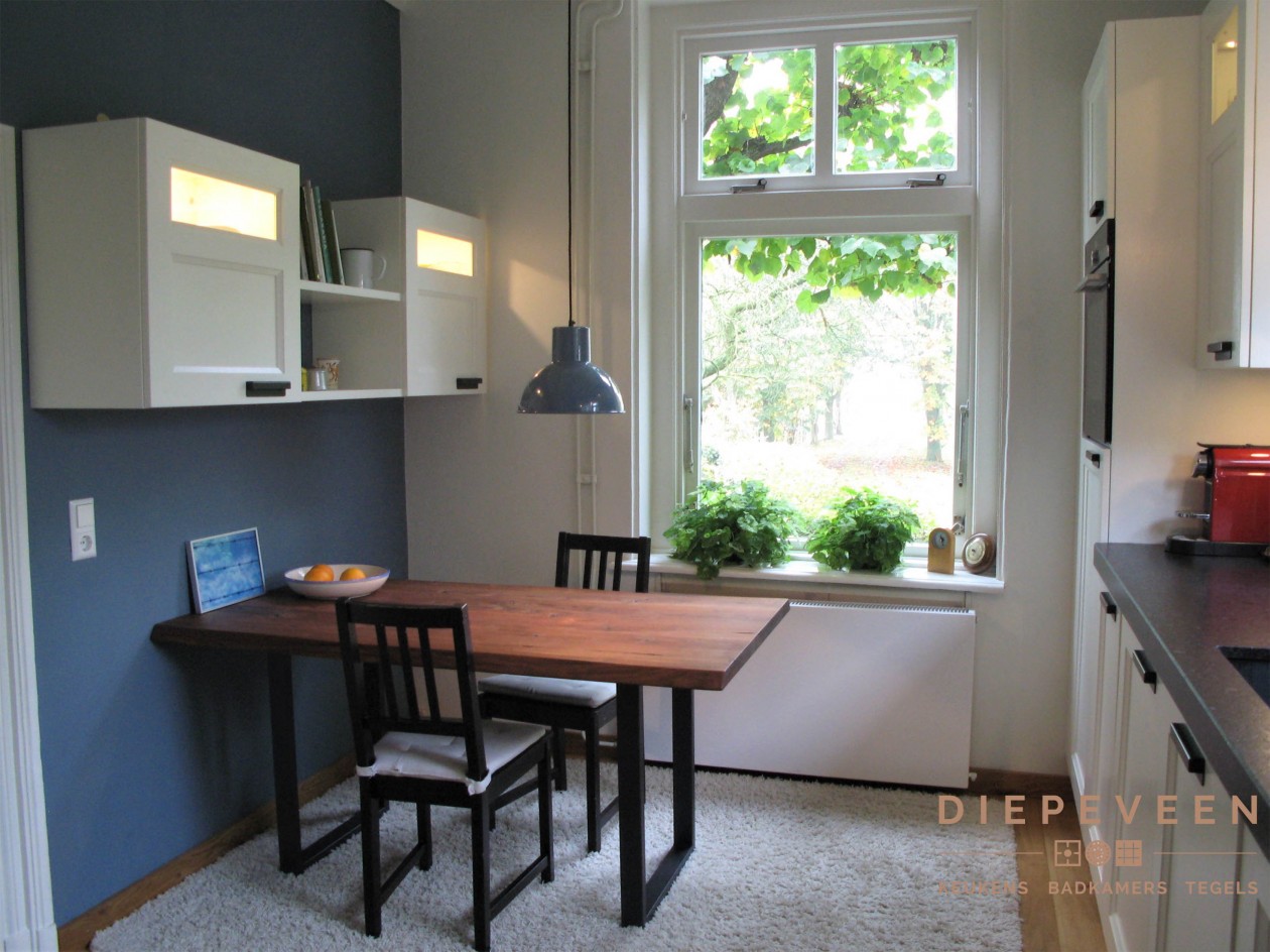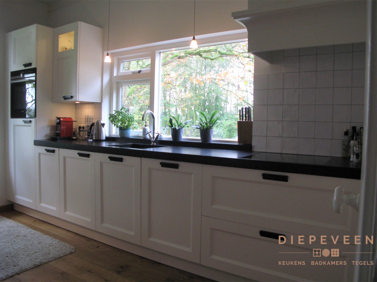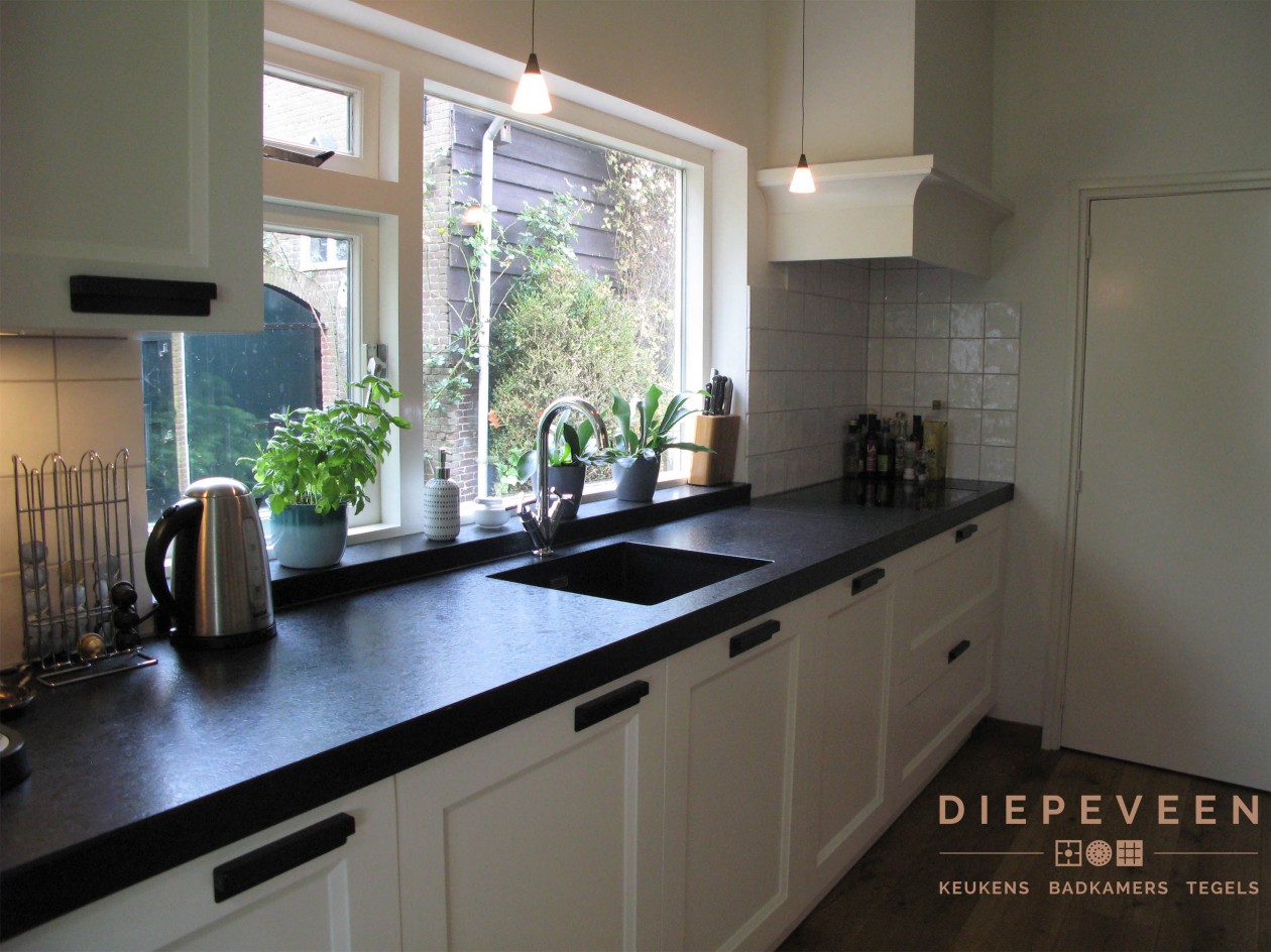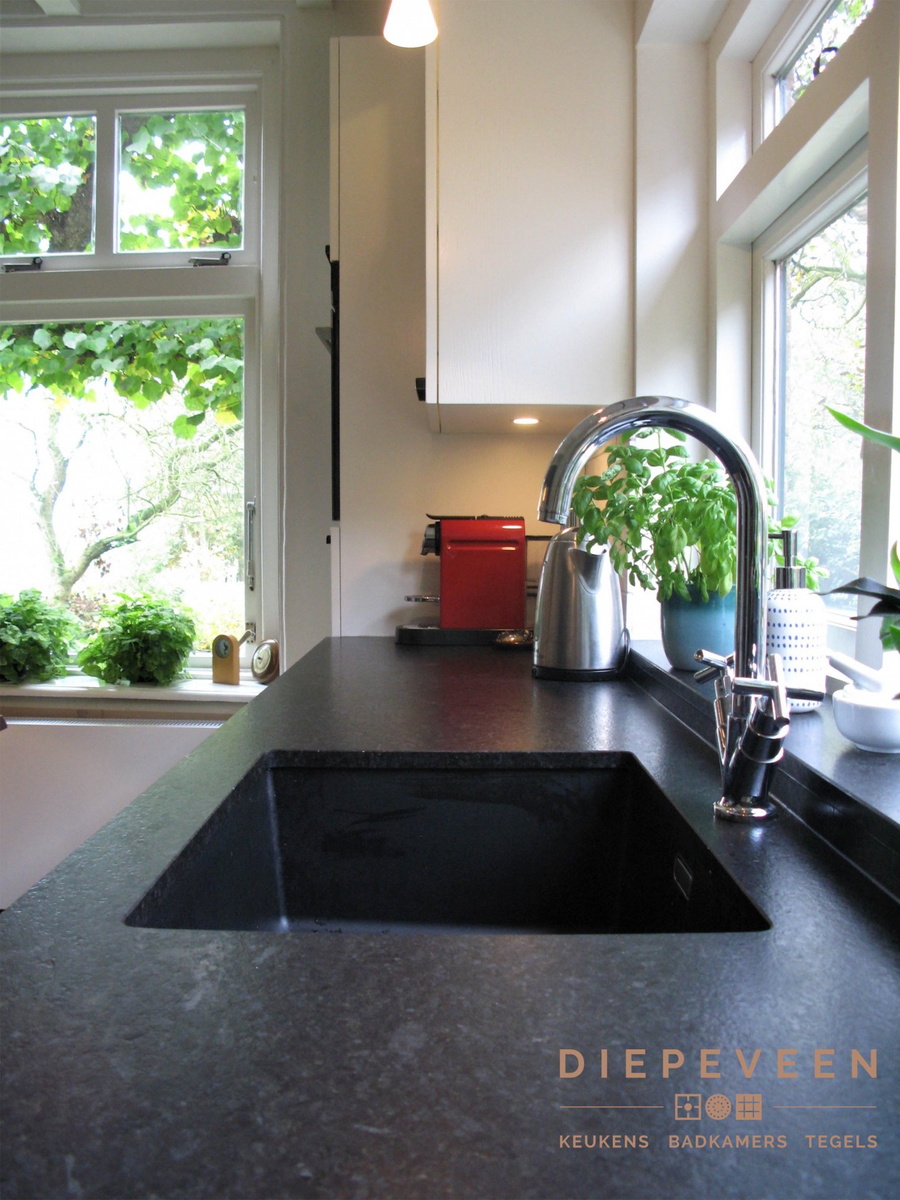 Deze stoere landelijke keuken is geplaatst in een oude boerderij. In deze keuken is er gekozen voor een zwarte wasbak, deze past mooi bij het donkere werkblad.