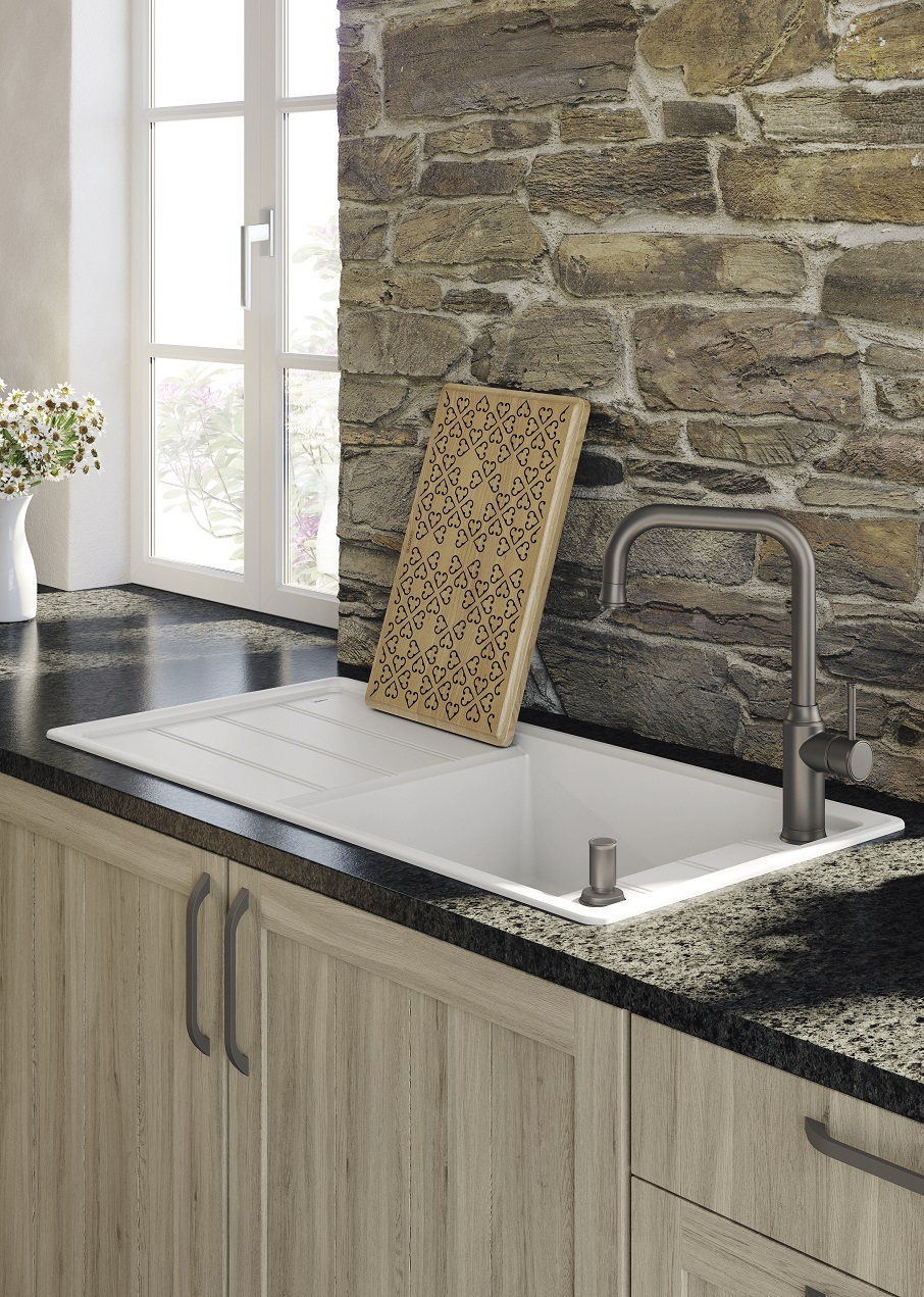 De als optie verkrijgbare snijplank uit massief essenhout is ook verkrijgbaar met een ingebrand ornament. Zo zorgt dit bijzondere accessoire voor een bijkomend accent in de keuken en levert het elke dag opnieuw goed werk bij het voorbereiden en bereiden van maaltijden. BLANCO FARON XL 6 S is gemaakt van het onderhoudsvriendelijke SILGRANIT® PuraDur® en is in alle 10 kleuren uit de CombiColours-reeks verkrijgbaar.