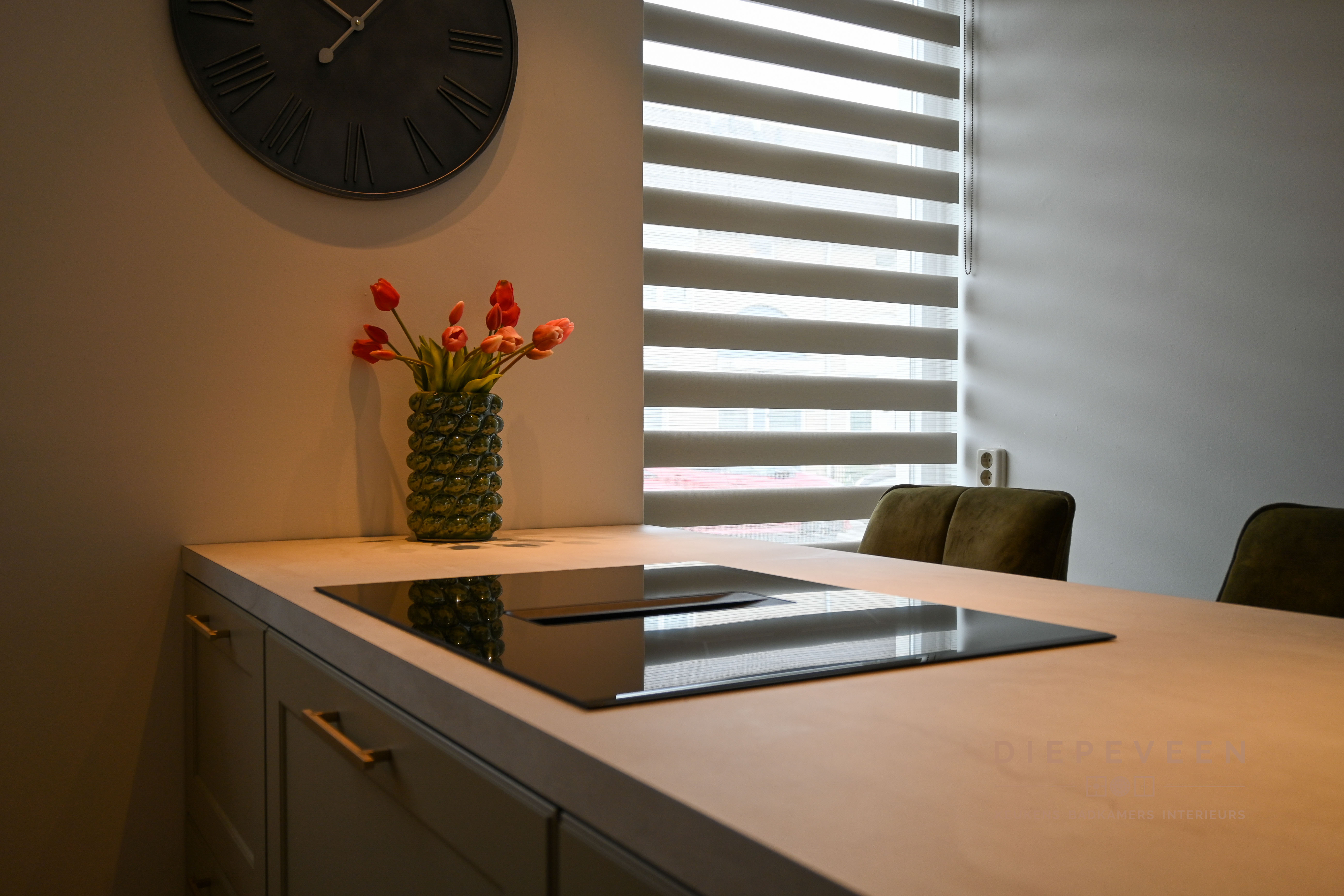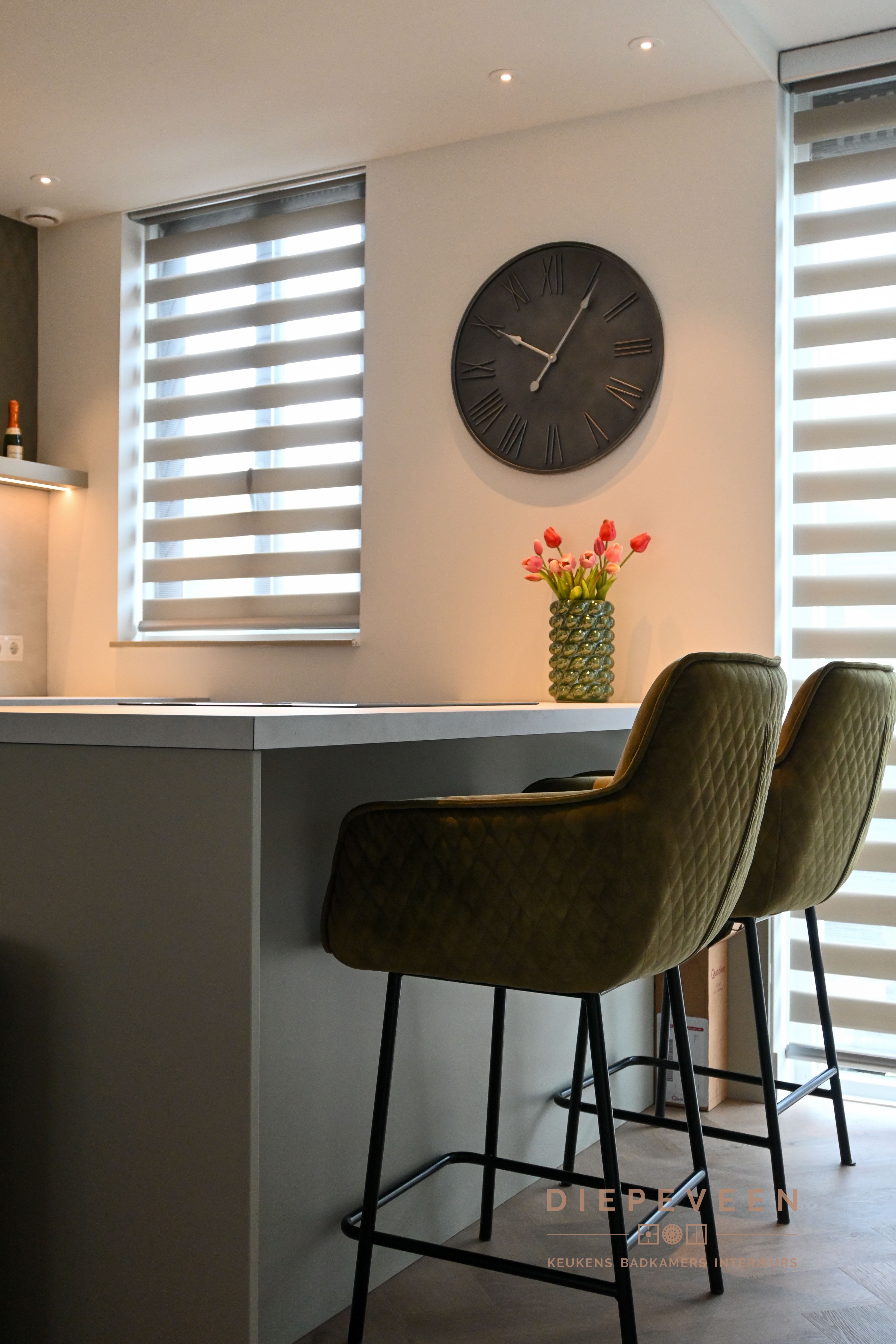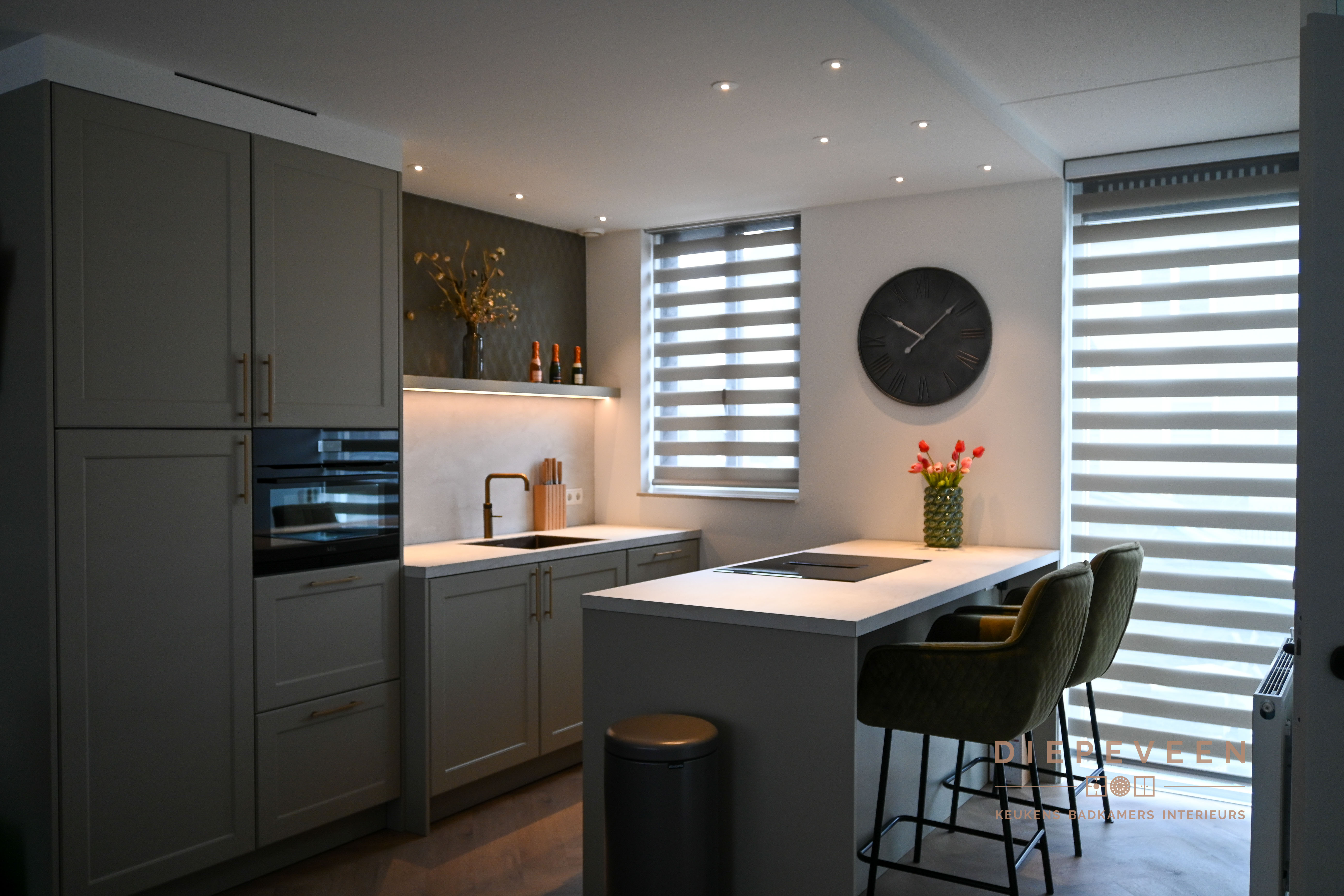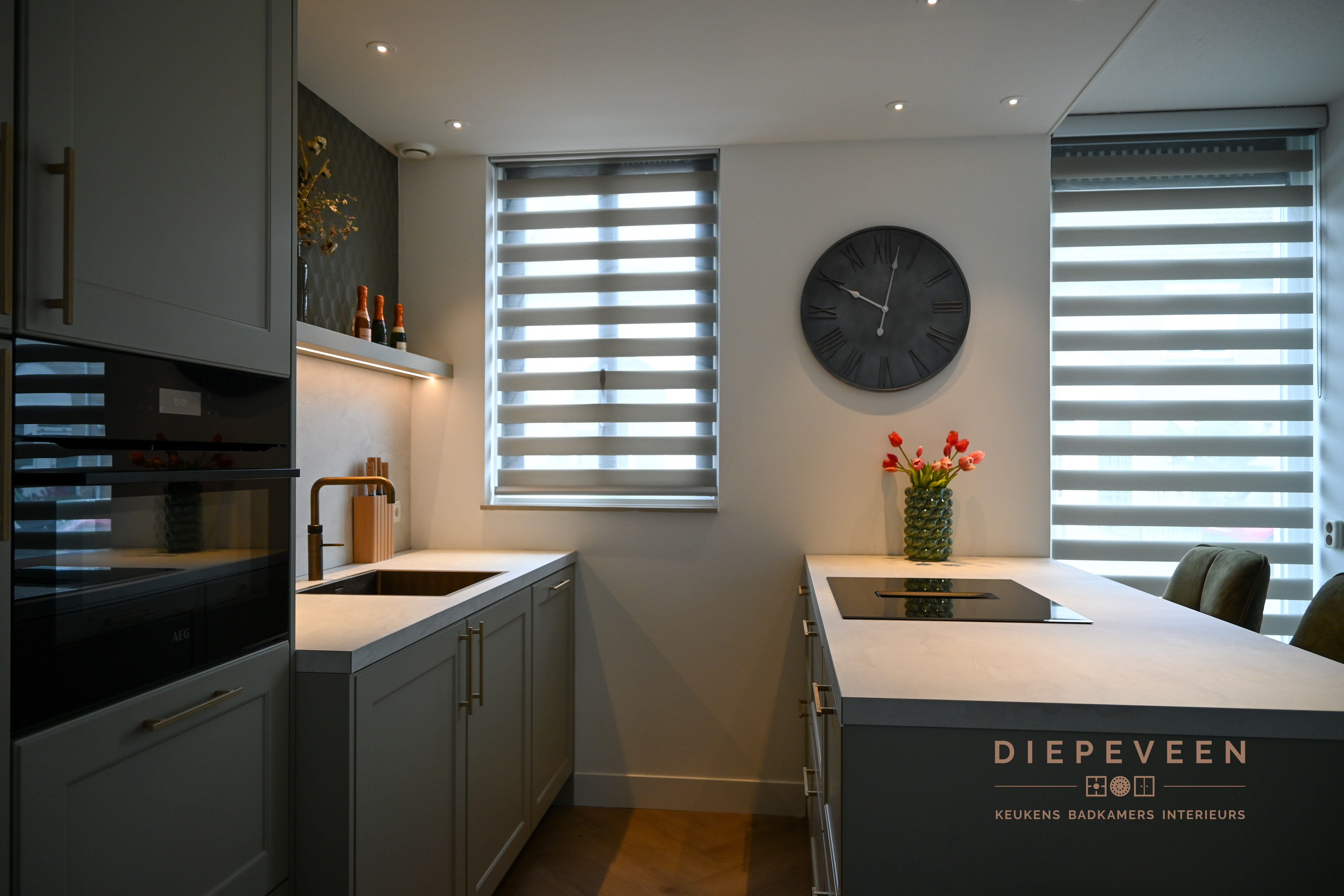 || STIJLVOL || Deze keuken ademt stijl en elegantie. De groene kastjes in een zachte tint en het lichte marmeren werkblad geven de keuken een frisse uitstraling, terwijl de gouden greepjes een luxe touch toevoegen. De kraan heeft een unieke kleur, namelijk de messing patina, die een bijzonder accent toevoegt. Boven de keuken hangt een plankje met ingebouwde verlichting, die de ruimte prachtig accentueert. Het kookeiland, vast aan de muur, biedt niet alleen ruimte om te koken, maar ook een gezellige plek om samen te zitten. De geïntegreerde oven in de hoge kasten maakt het geheel compleet.
