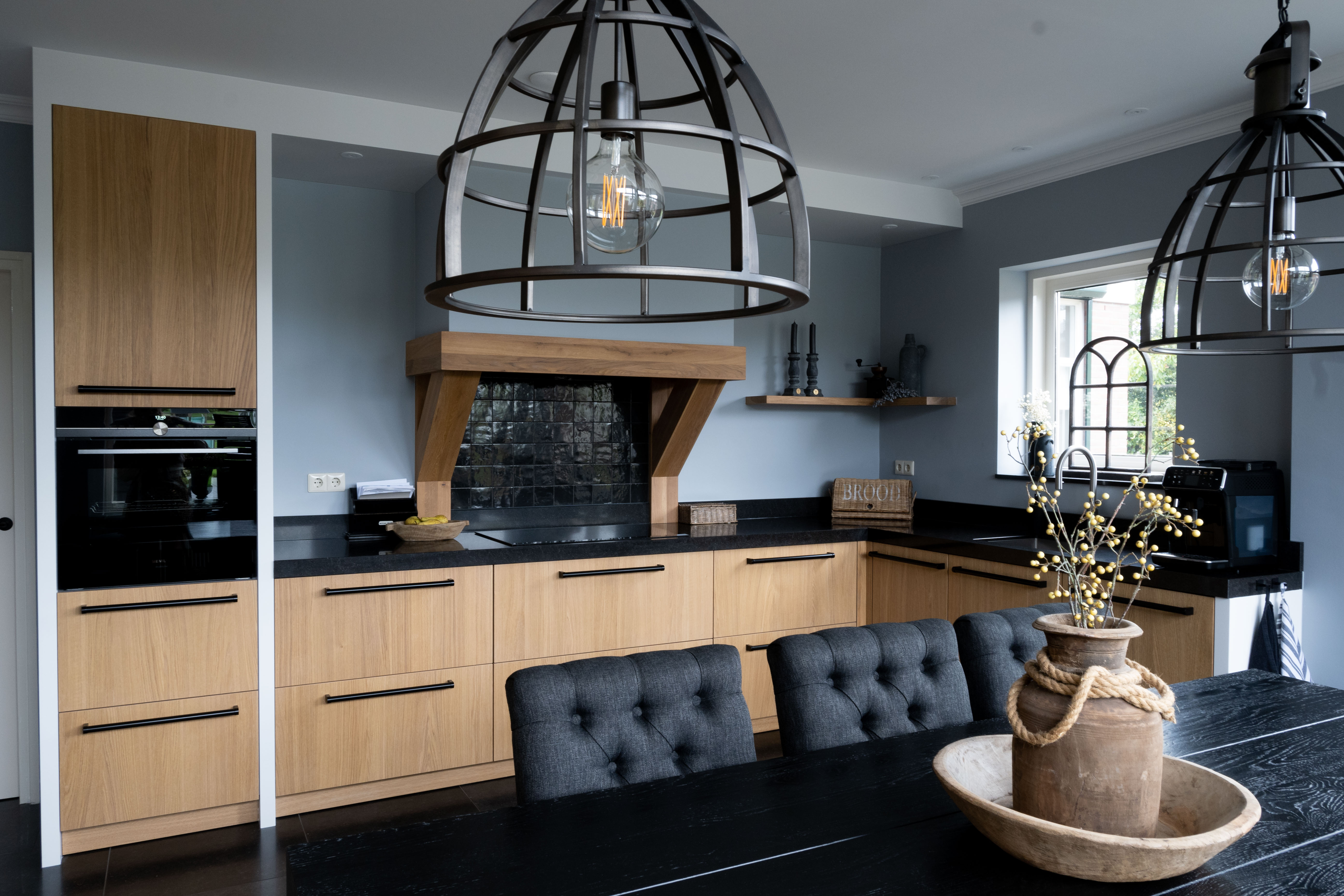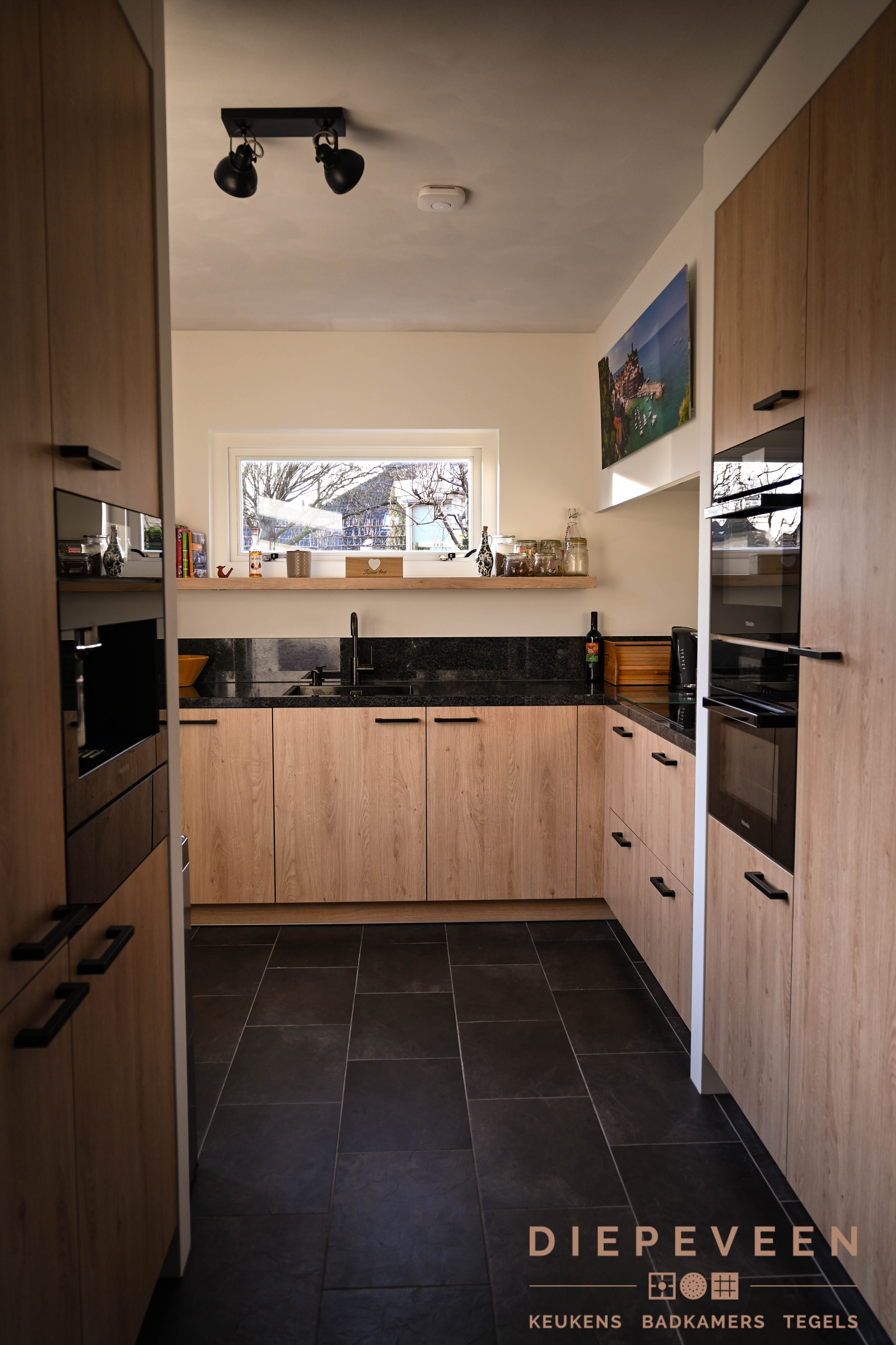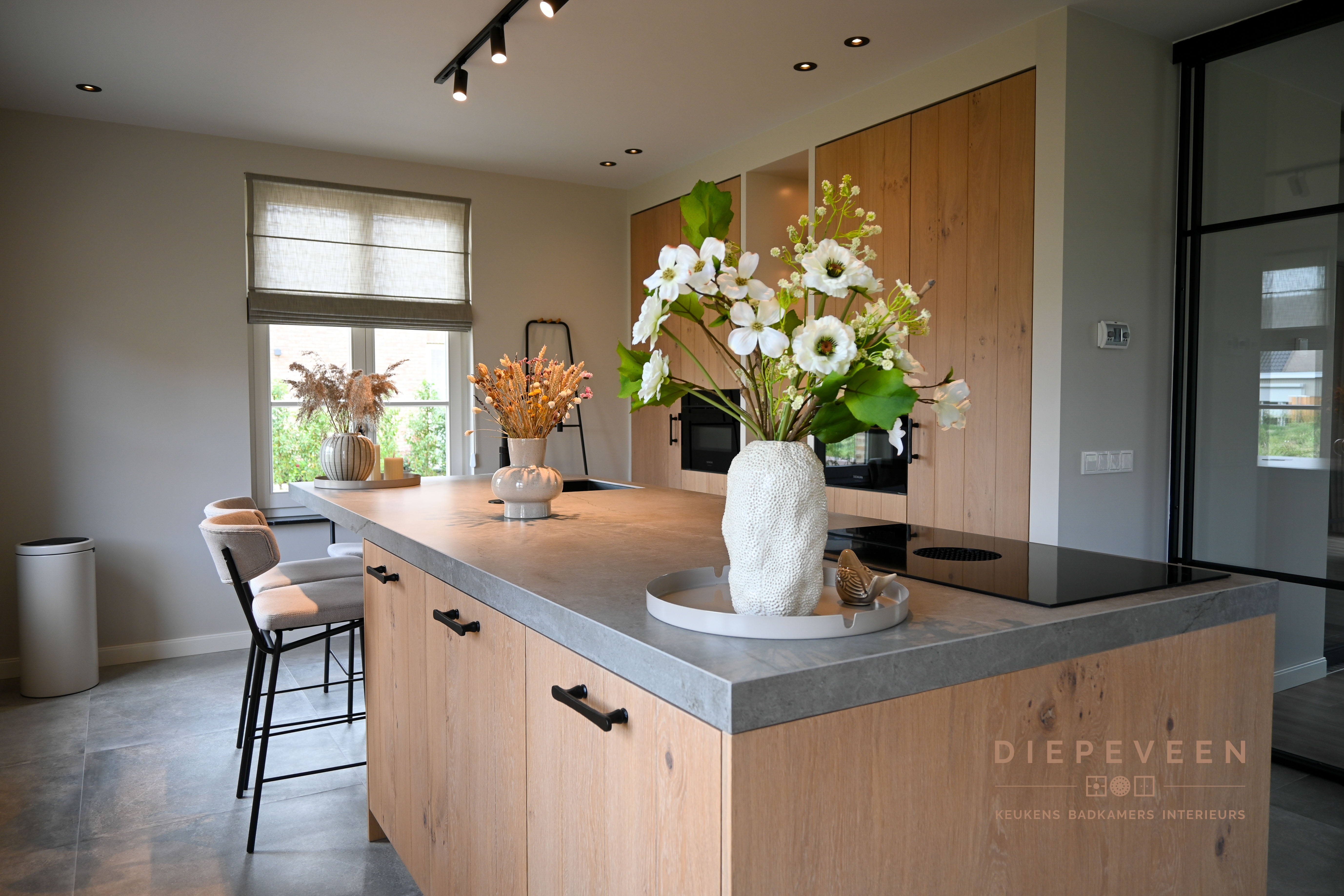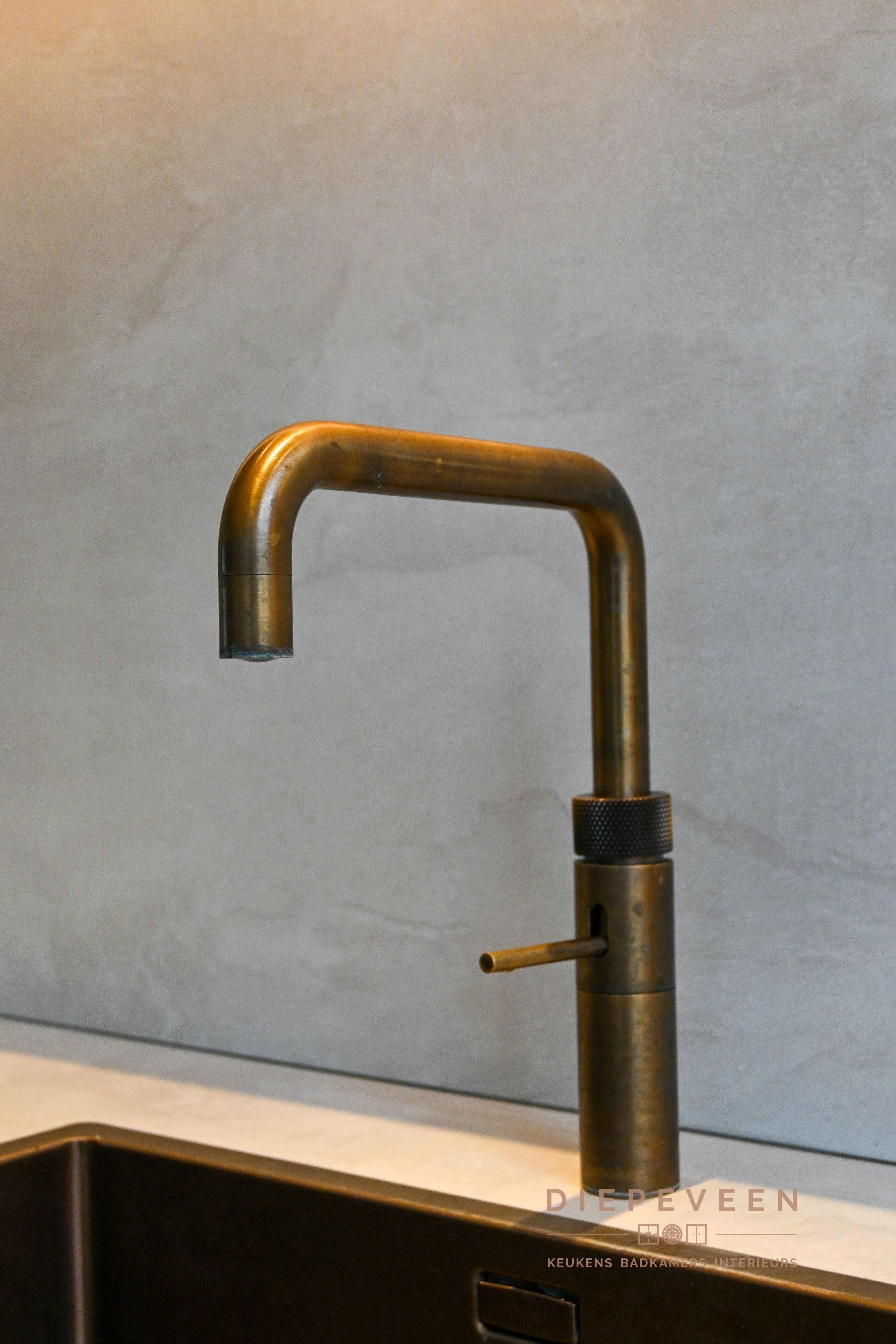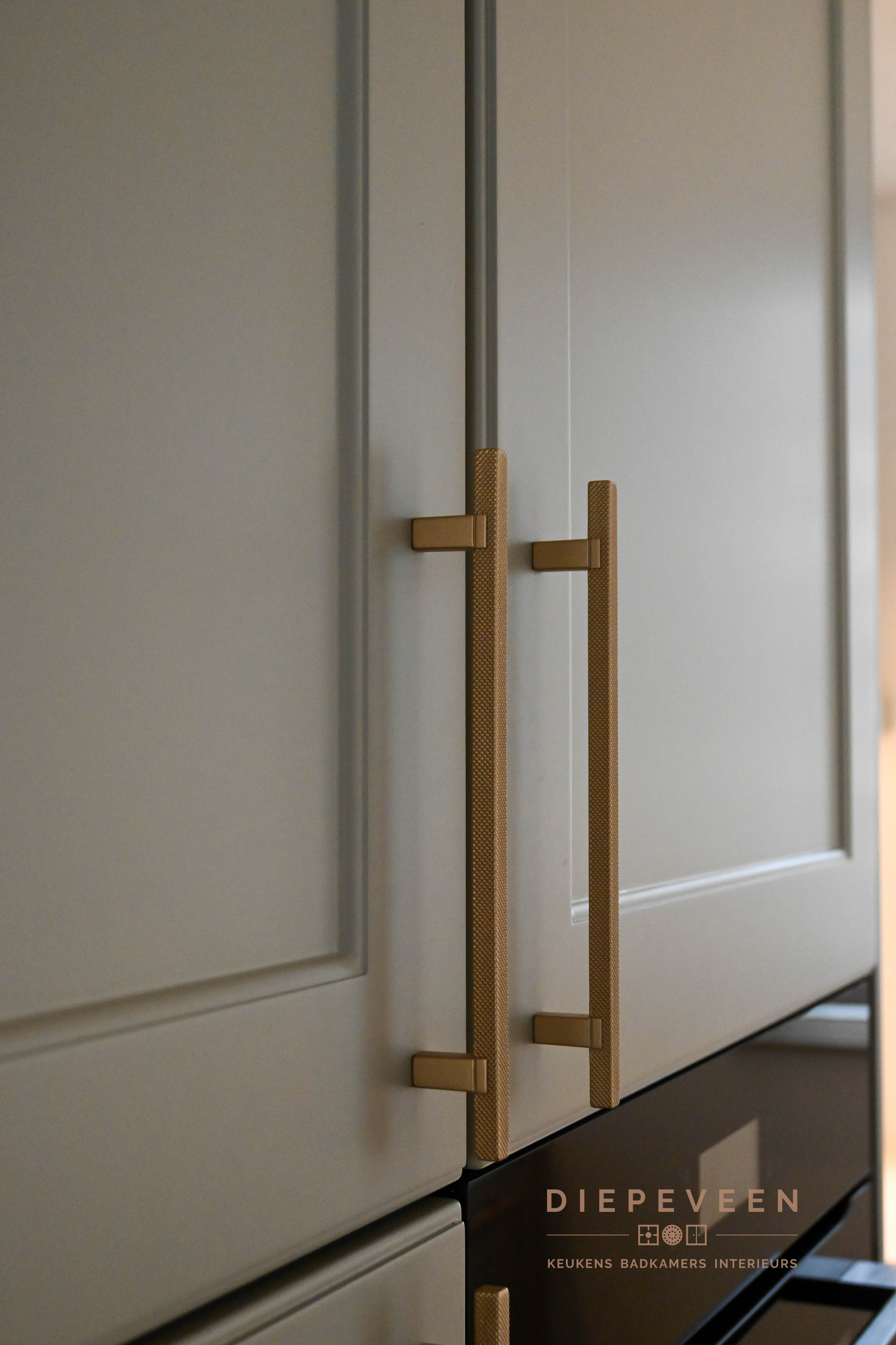 || STIJLVOL || Deze keuken ademt stijl en elegantie. De groene kastjes in een zachte tint en het lichte marmeren werkblad geven de keuken een frisse uitstraling, terwijl de gouden greepjes een luxe touch toevoegen. De kraan heeft een unieke kleur, namelijk de messing patina, die een bijzonder accent toevoegt. Boven de keuken hangt een plankje met ingebouwde verlichting, die de ruimte prachtig accentueert. Het kookeiland, vast aan de muur, biedt niet alleen ruimte om te koken, maar ook een gezellige plek om samen te zitten. De geïntegreerde oven in de hoge kasten maakt het geheel compleet.