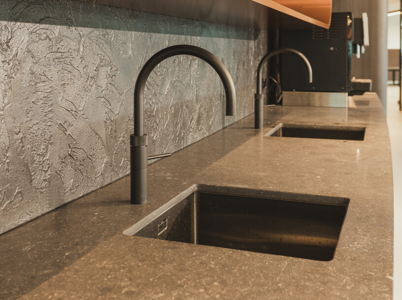 Deze twee Mereno Houston bedrijfskeukens stralen elegantie en luxe uit dankzij de zorgvuldige materiaalkeuzes. De keukens zijn uitgevoerd met Houston fronten in een stijlvolle zwarte kleur, gecombineerd met verfijnde koperen details die de uitstraling naar een hoger niveau tillen.