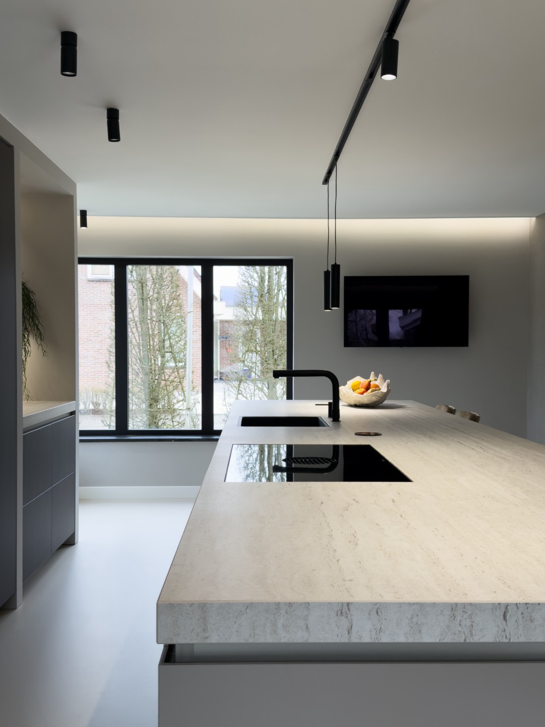 De fronten van de keuken zijn uitgevoerd in een zachte taupetint, wat zorgt voor rust en een warme basis. Deze kleur combineert prachtig met het aanrechtblad, de achterwand en stollen in Dekton Marmorio Satin: een hoogwaardig materiaal met een verfijnde marmerlook. Het lichte, gemarmerde oppervlak voegt luxe toe, zonder overheersend te zijn. Bovendien is Dekton krasvast, hittebestendig en onderhoudsvriendelijk: perfect voor dagelijks gebruik.