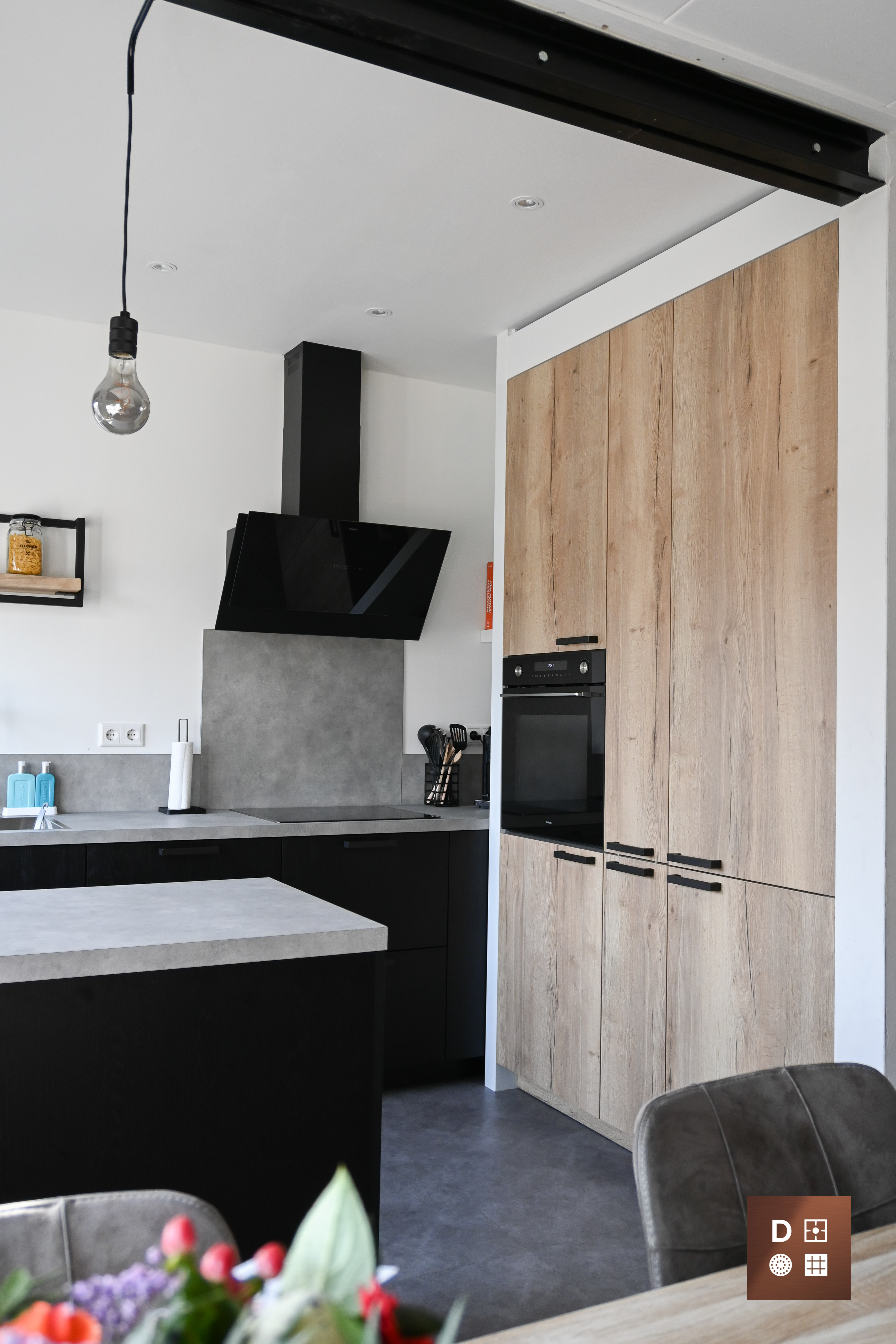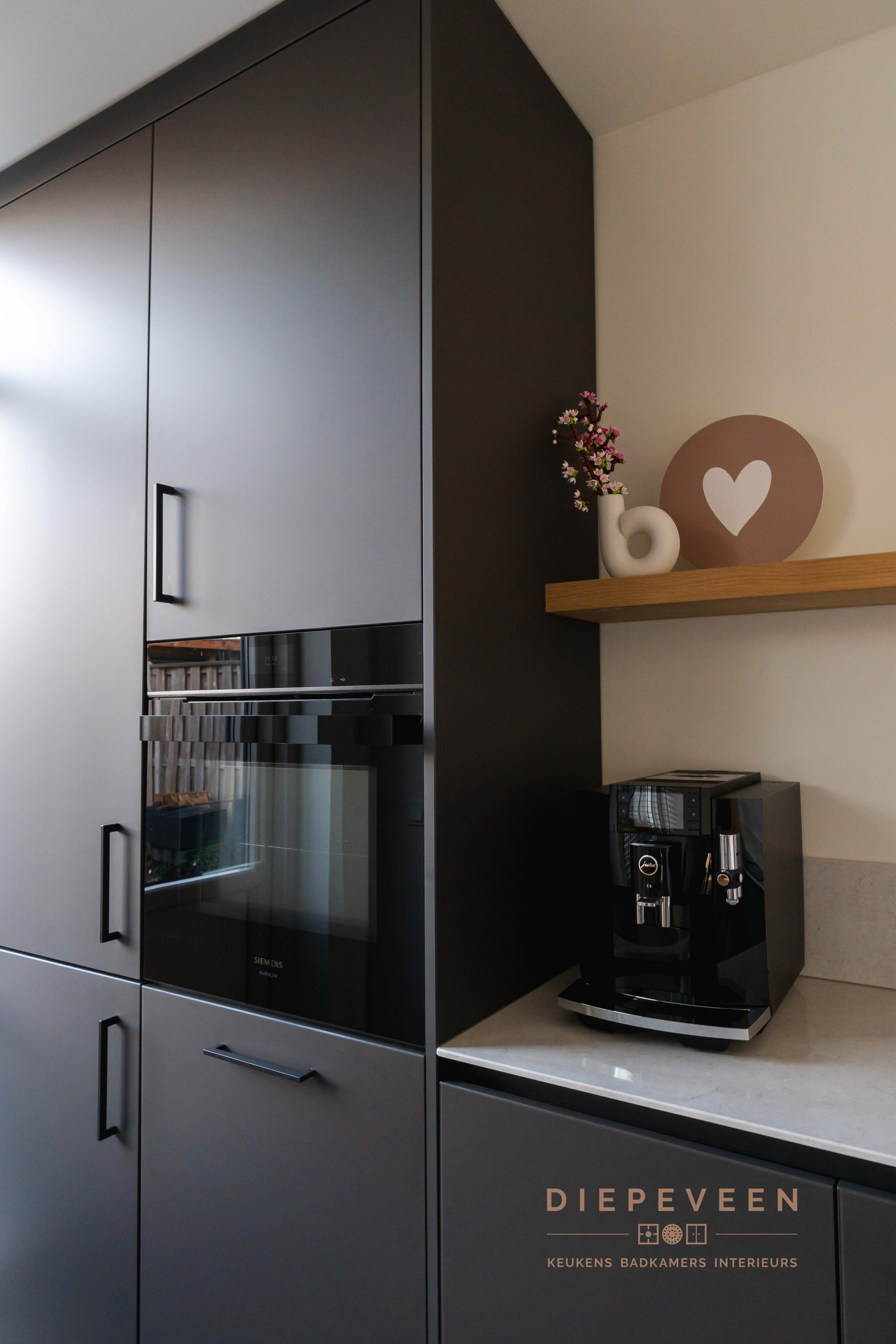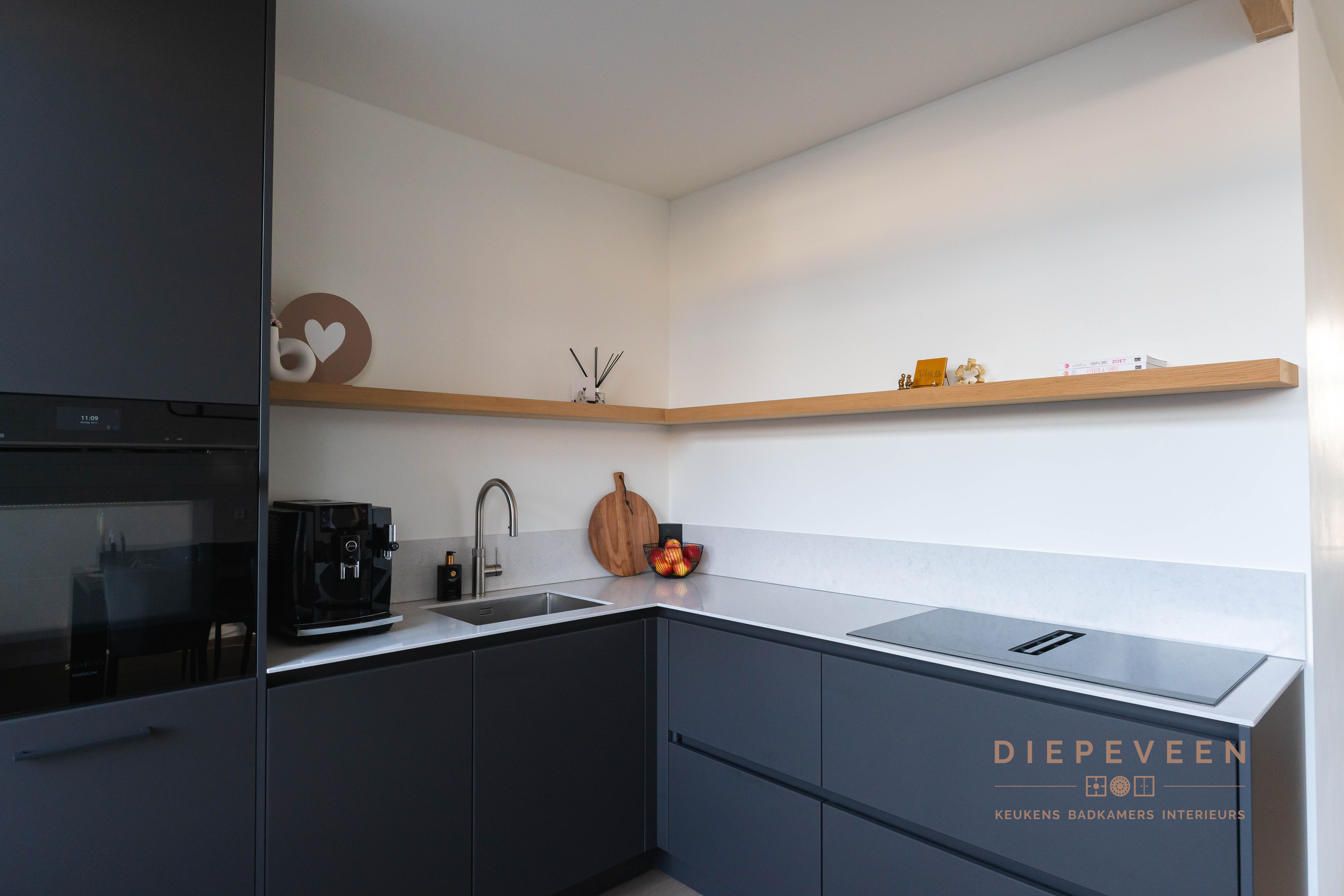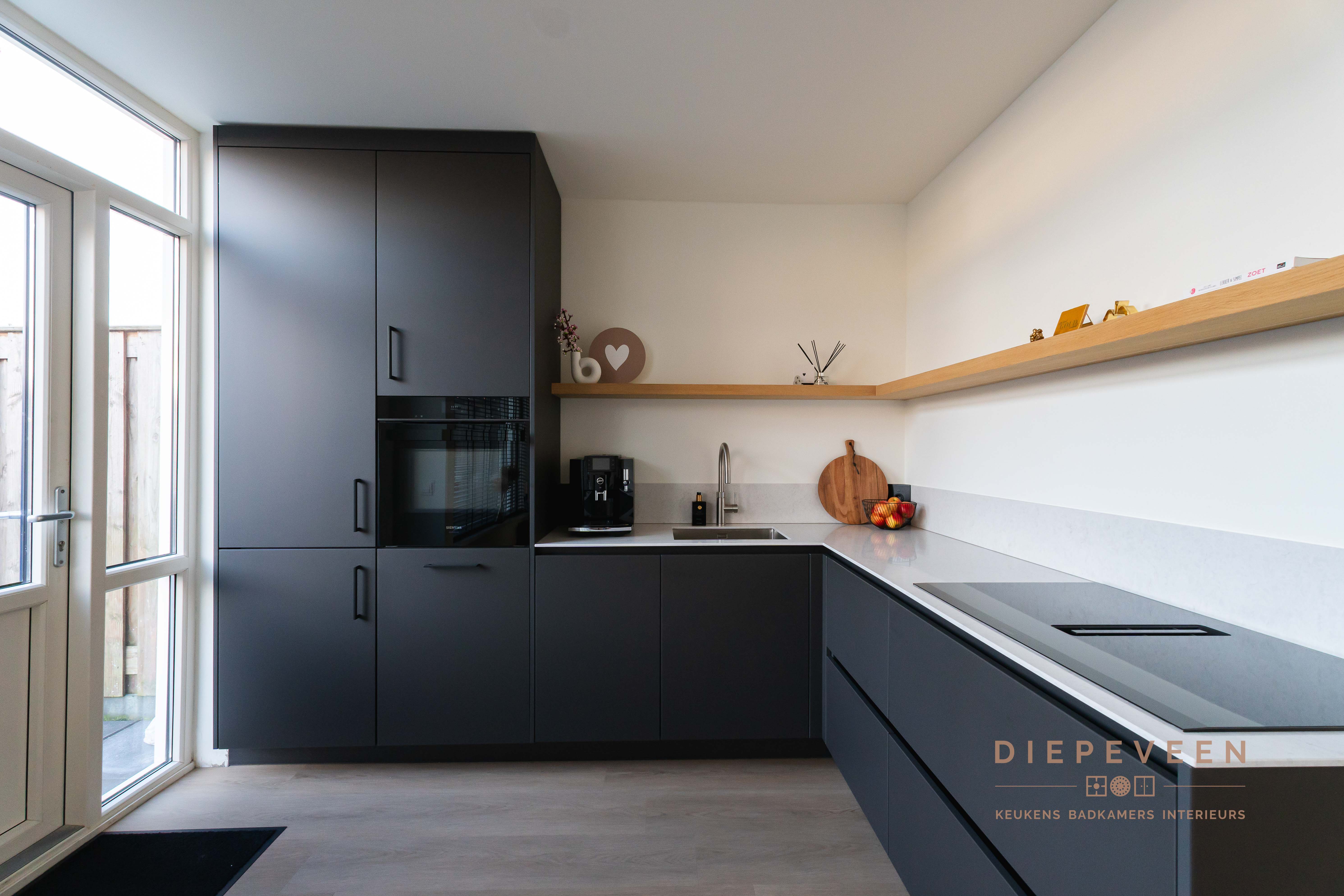 || TIJDLOOS || Met deze keuken haal je stijl en functionaliteit in huis! De hoekopstelling combineert zwarte kastjes met een wit marmeren werkblad, wat zorgt voor een modern en verfijnd geheel. Boven de keuken loopt een houten plank, wat warmte en karakter toevoegt aan het ontwerp. De hoge kasten bieden volop opbergruimte en hebben een geïntegreerde oven die naadloos opgaat in het strakke design. Een praktische en moderne keuken!