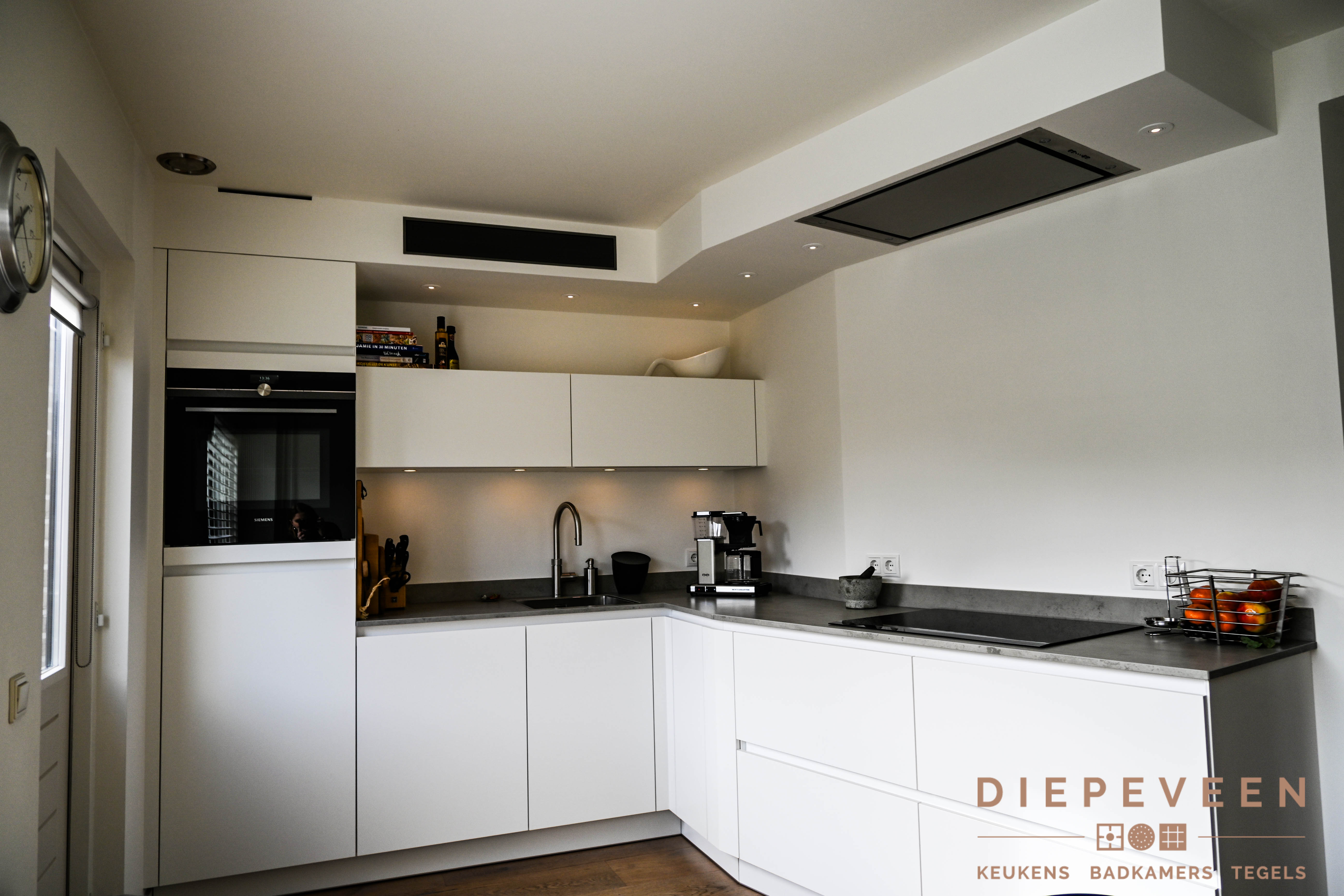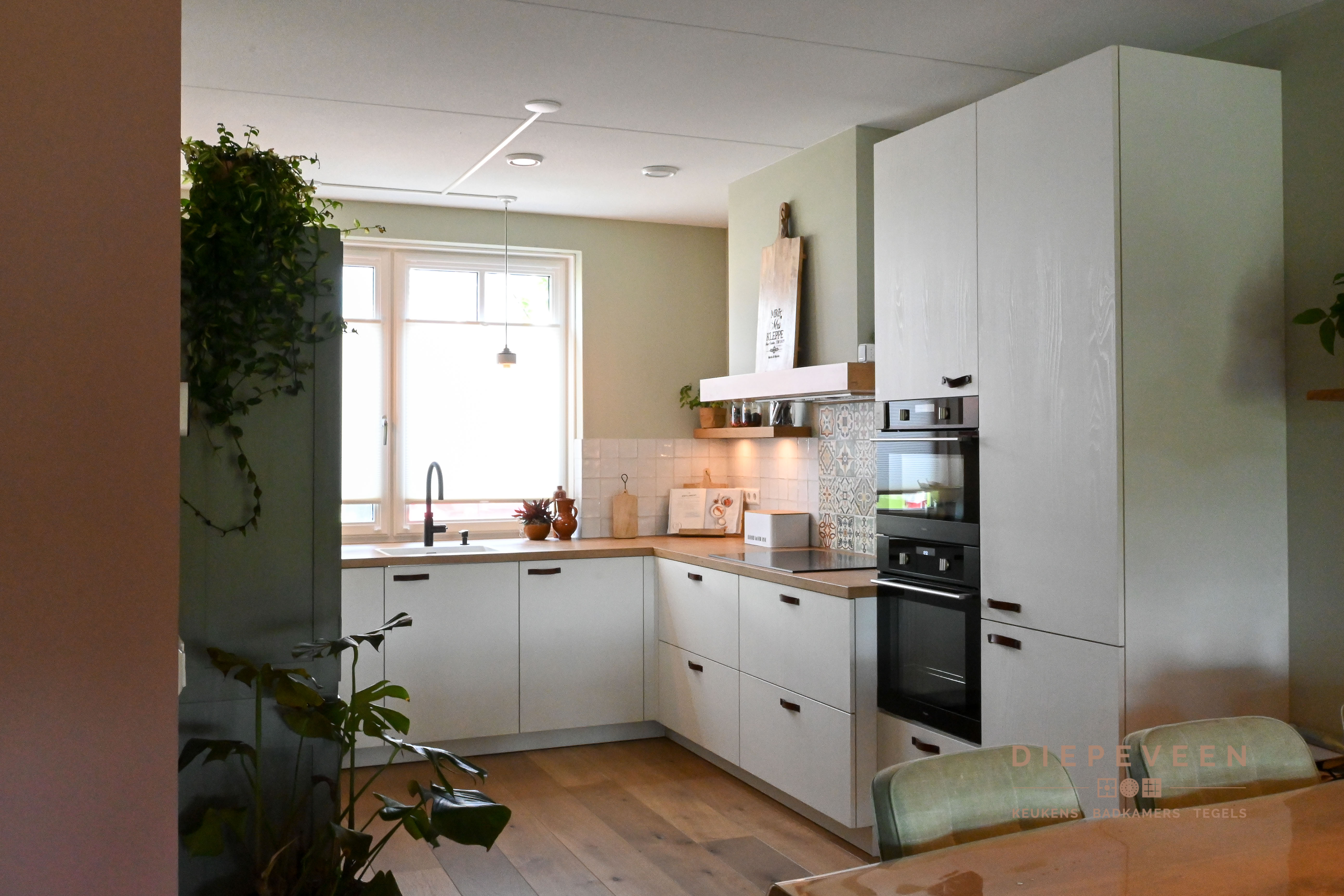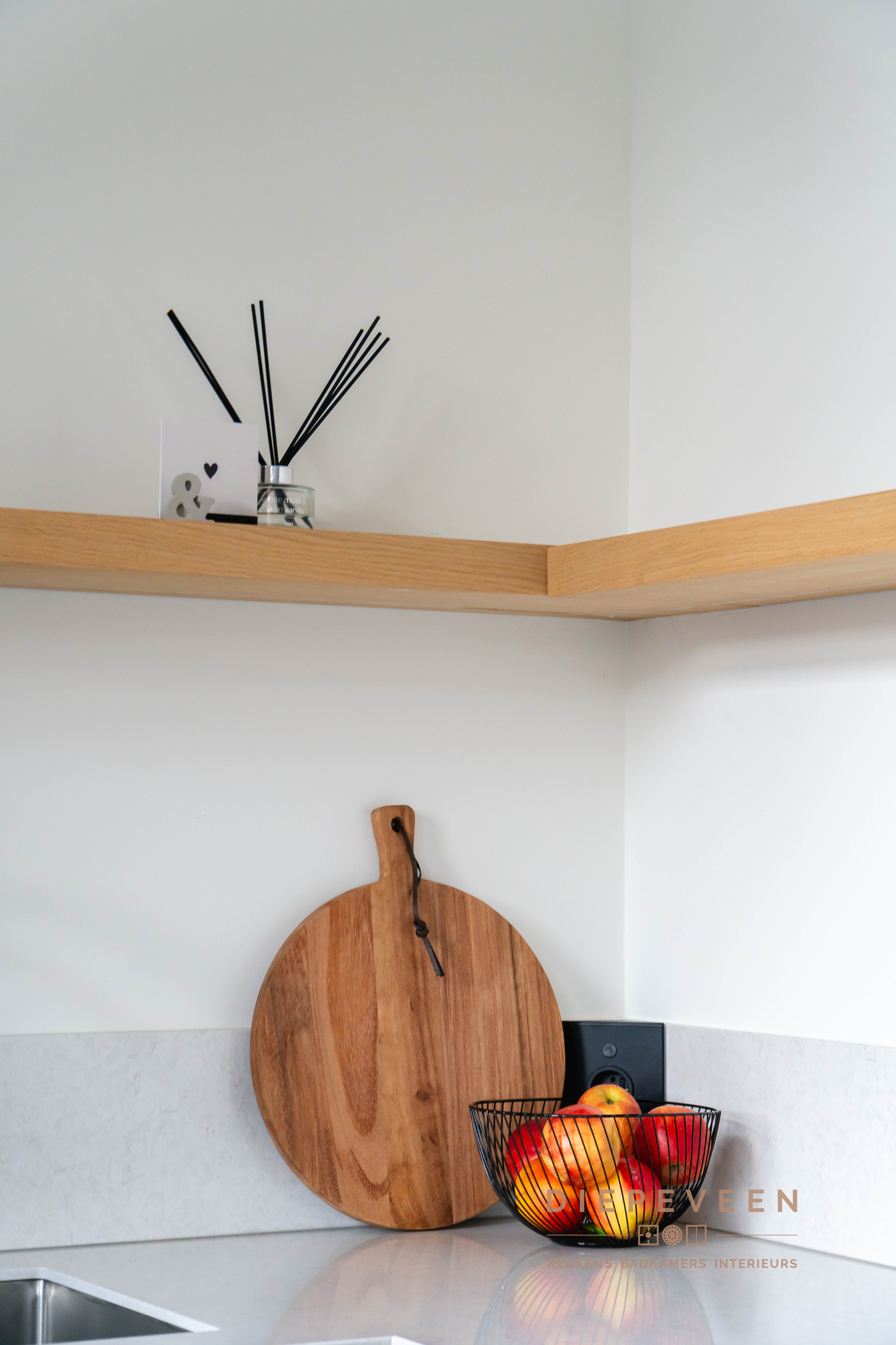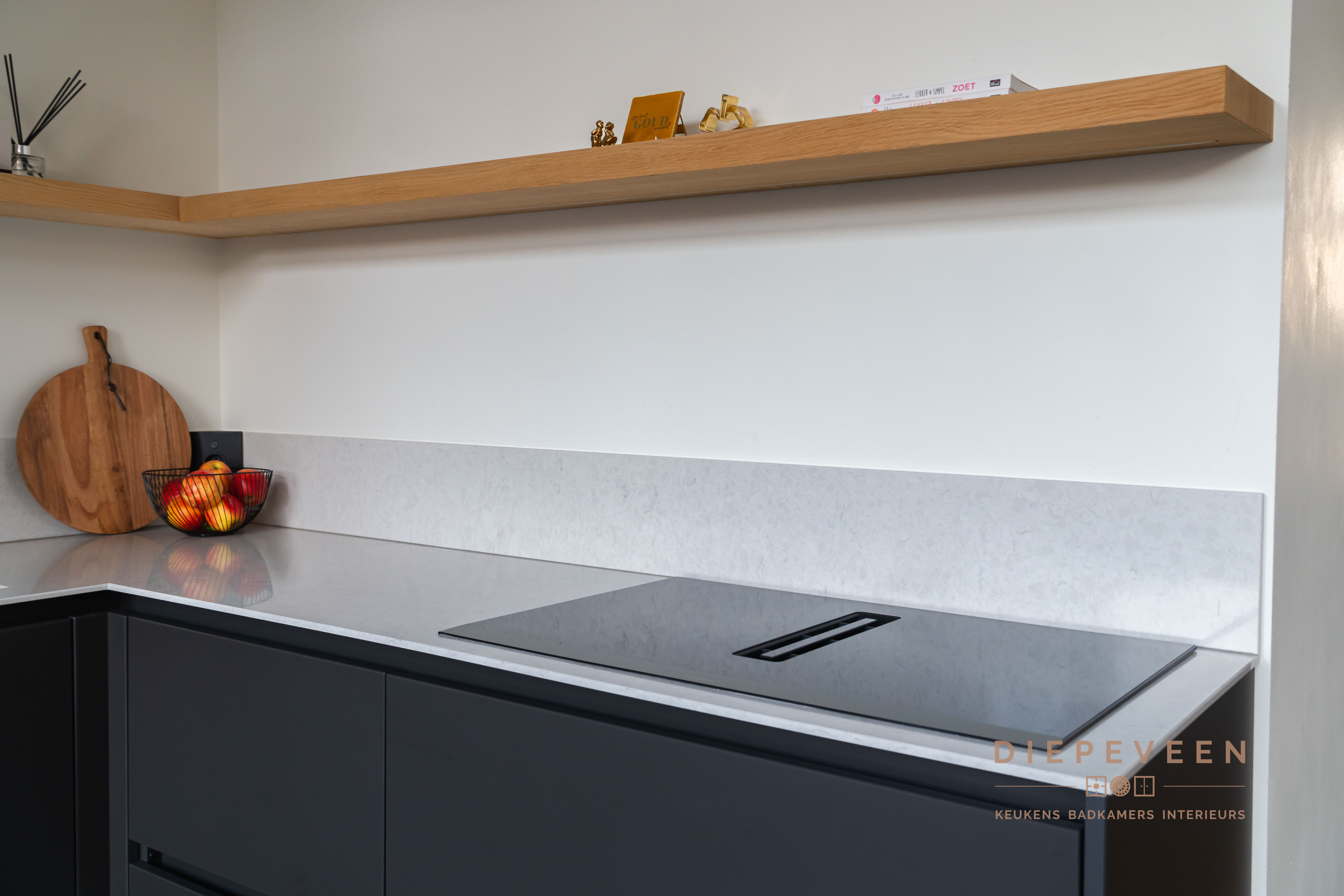 || TIJDLOOS || Met deze keuken haal je stijl en functionaliteit in huis! De hoekopstelling combineert zwarte kastjes met een wit marmeren werkblad, wat zorgt voor een modern en verfijnd geheel. Boven de keuken loopt een houten plank, wat warmte en karakter toevoegt aan het ontwerp. De hoge kasten bieden volop opbergruimte en hebben een geïntegreerde oven die naadloos opgaat in het strakke design. Een praktische en moderne keuken!