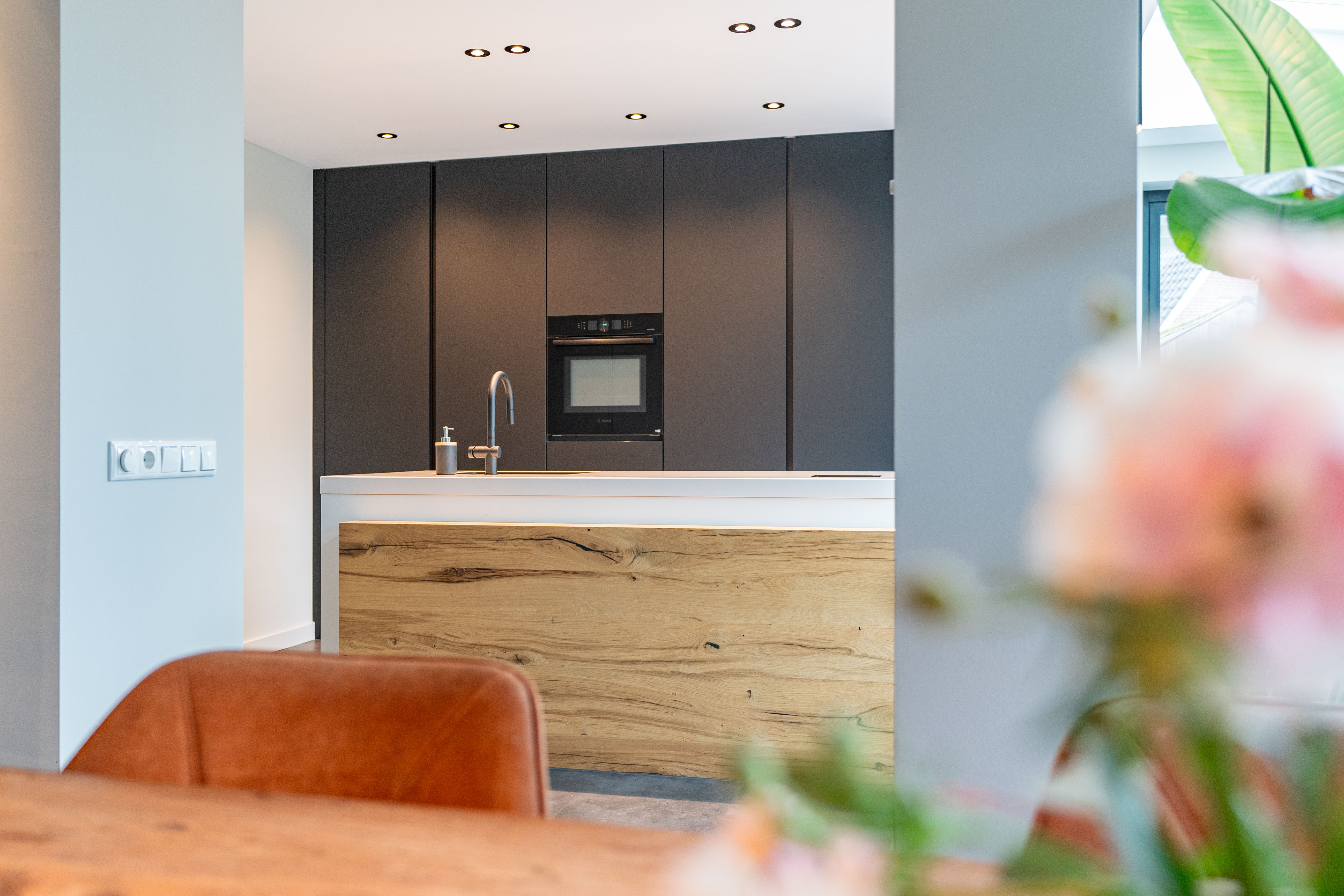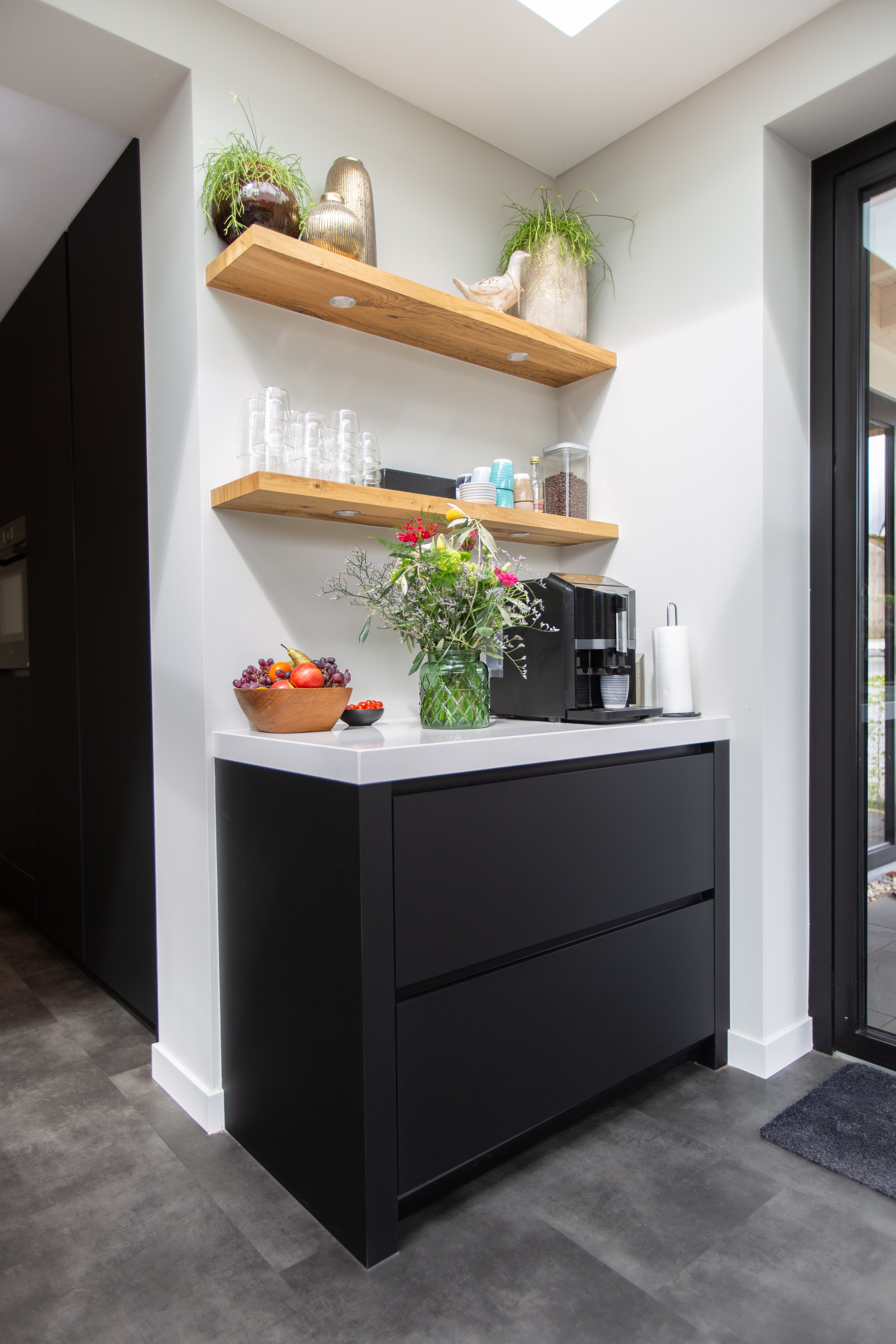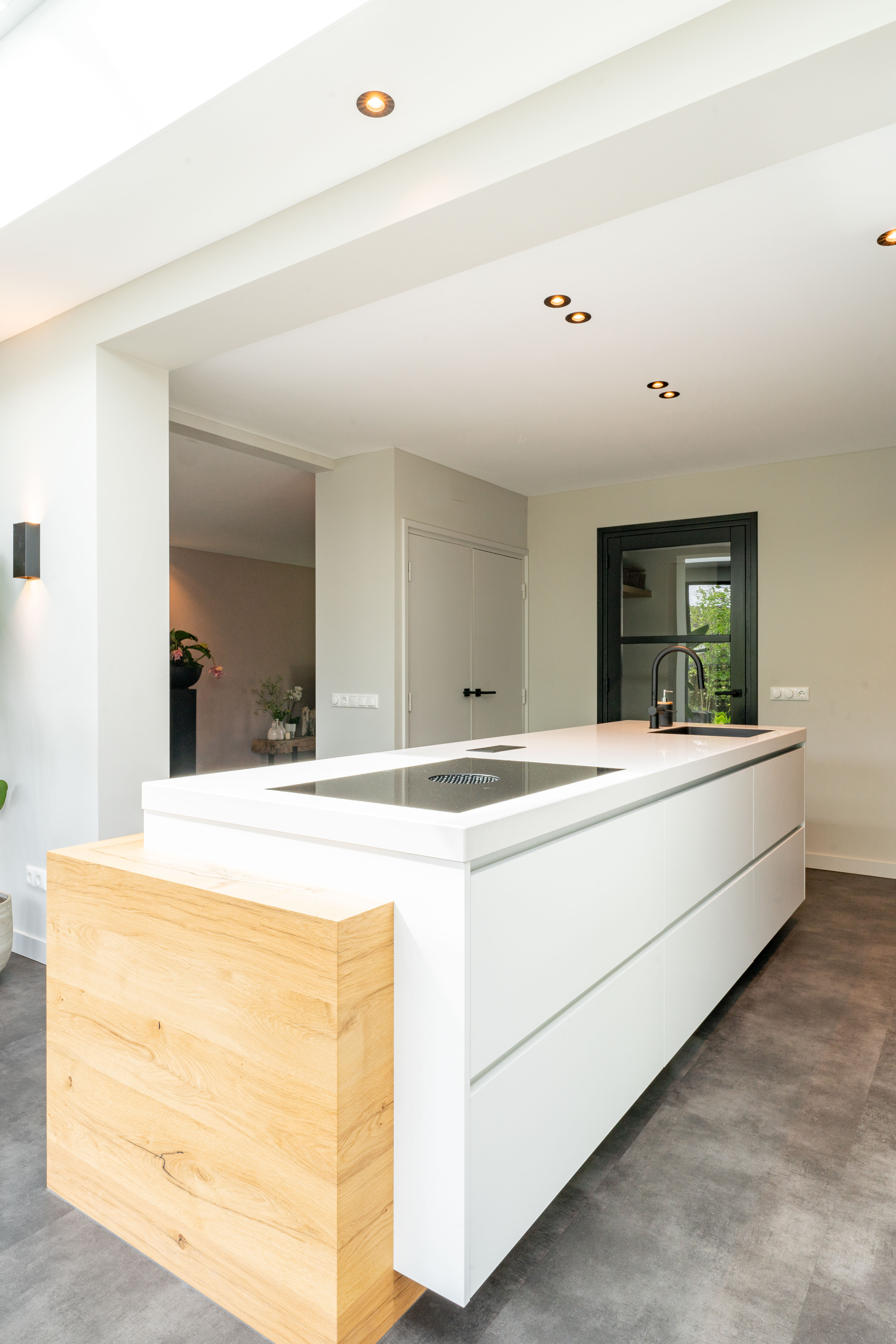 Deze prachtige lichte keuken doet het huis volledig tot zijn recht komen. De keuken is uitgerust met twee verschillende soorten fronten. Voor het kookeiland is gekozen voor strakke, witte fronten, terwijl de kastenwand en de fronten aan de zijkant zijn uitgevoerd in matzwart. Dankzij de overvloedige lichtinval in de ruimte kon er goed gekozen worden voor een donkere tint. Om deze lichte keuken compleet te maken, is er een wit composieten werkblad geplaatst, gecombineerd met een houten ombouw rond het kookeiland. Deze houten ombouw maakt het eiland echt het centrale punt van de keuken. Een opvallend detail is dat de spots in de koffiehoek geïntegreerd zijn in de planken, wat zowel praktisch als esthetisch aantrekkelijk is!