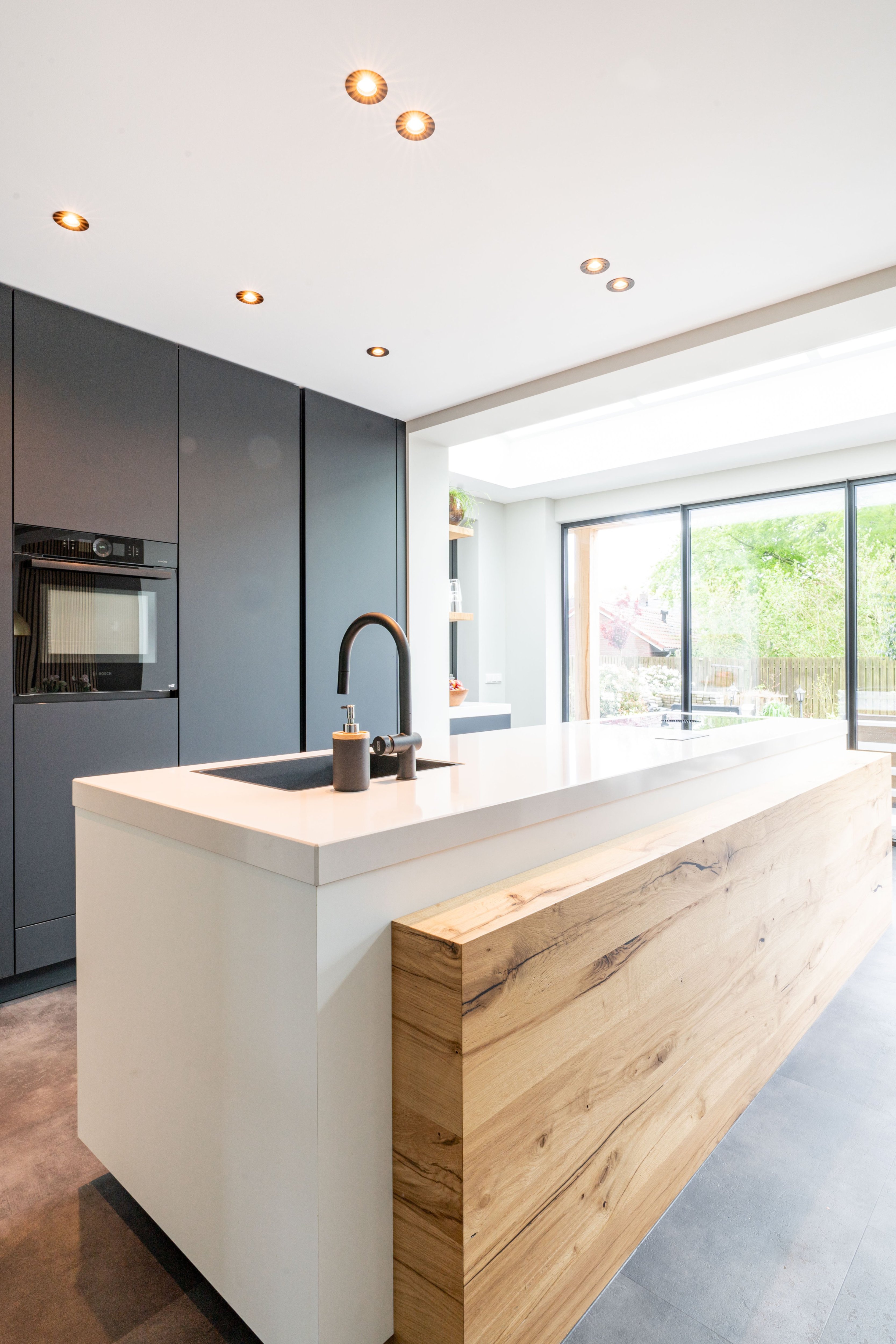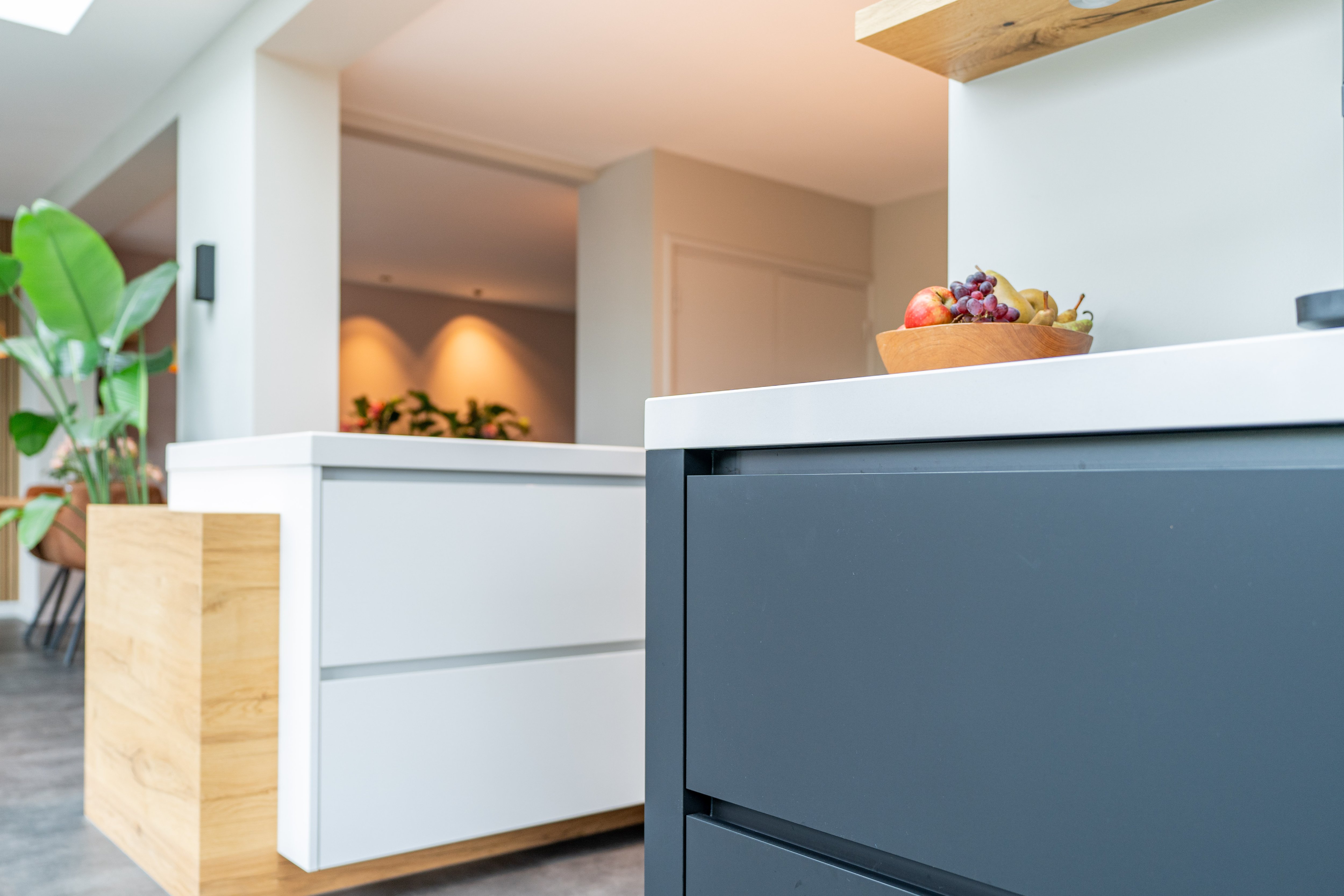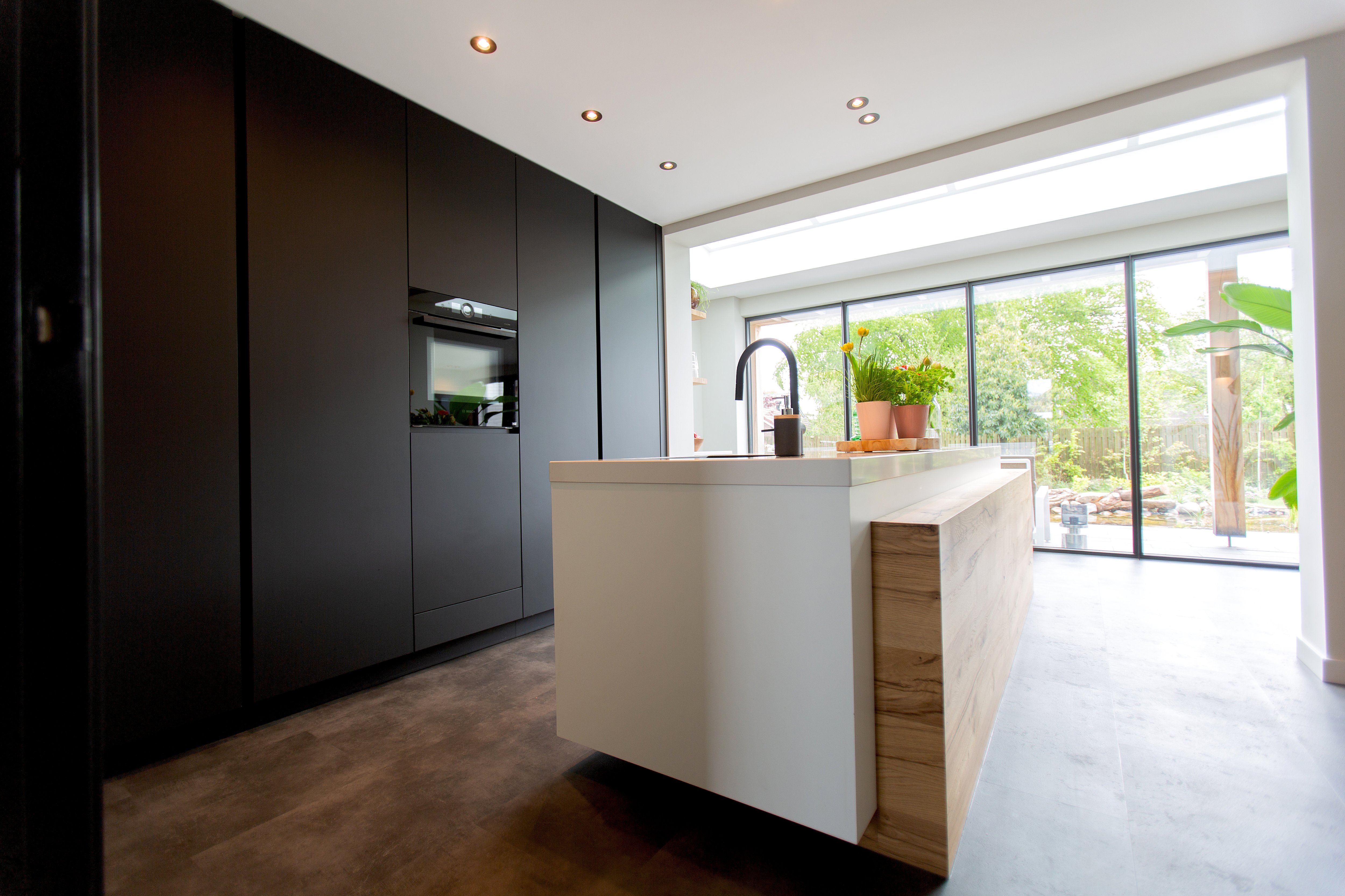 Deze prachtige lichte keuken doet het huis volledig tot zijn recht komen. De keuken is uitgerust met twee verschillende soorten fronten. Voor het kookeiland is gekozen voor strakke, witte fronten, terwijl de kastenwand en de fronten aan de zijkant zijn uitgevoerd in matzwart. Dankzij de overvloedige lichtinval in de ruimte kon er goed gekozen worden voor een donkere tint. Om deze lichte keuken compleet te maken, is er een wit composieten werkblad geplaatst, gecombineerd met een houten ombouw rond het kookeiland. Deze houten ombouw maakt het eiland echt het centrale punt van de keuken. Een opvallend detail is dat de spots in de koffiehoek geïntegreerd zijn in de planken, wat zowel praktisch als esthetisch aantrekkelijk is!
