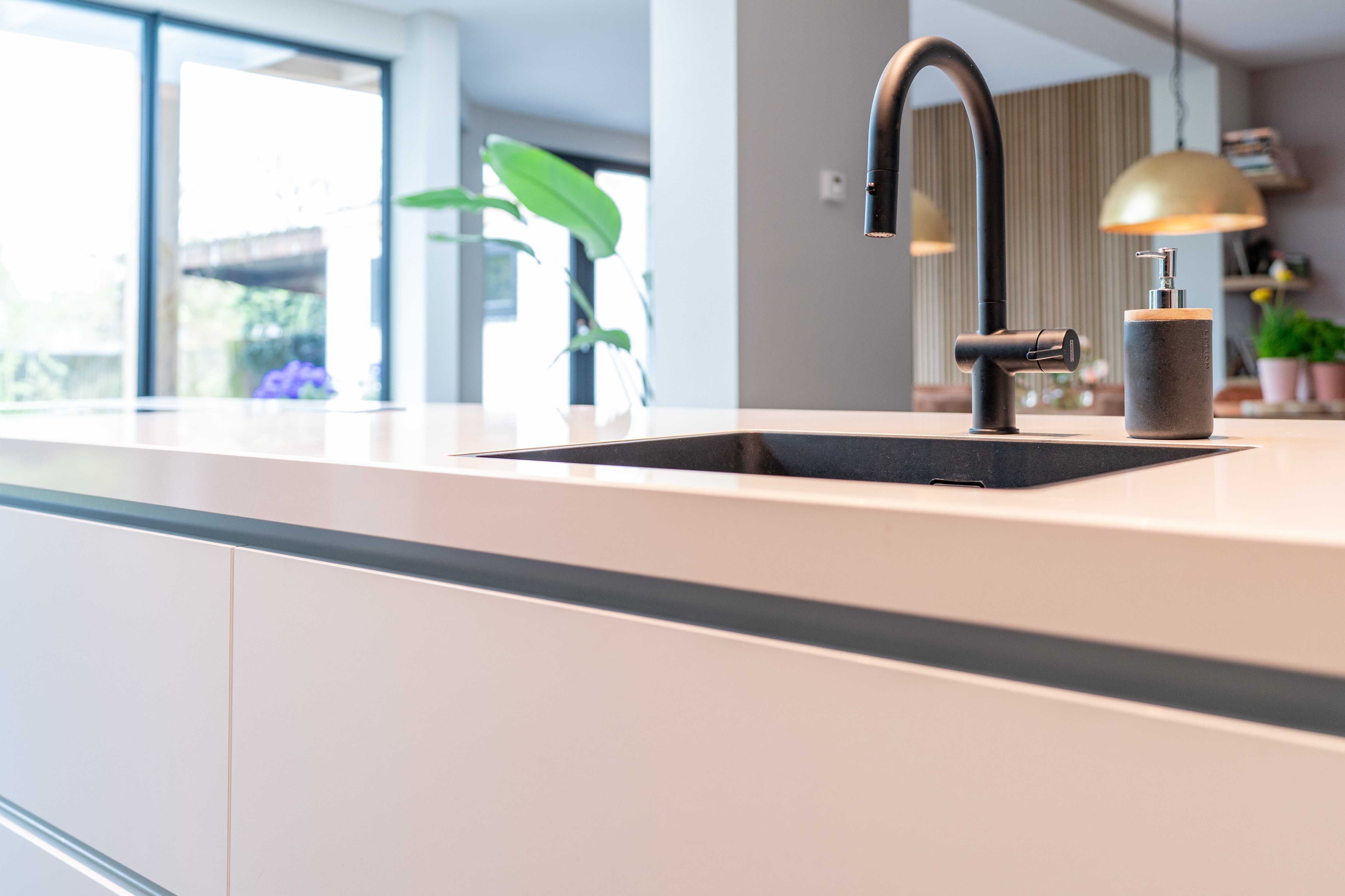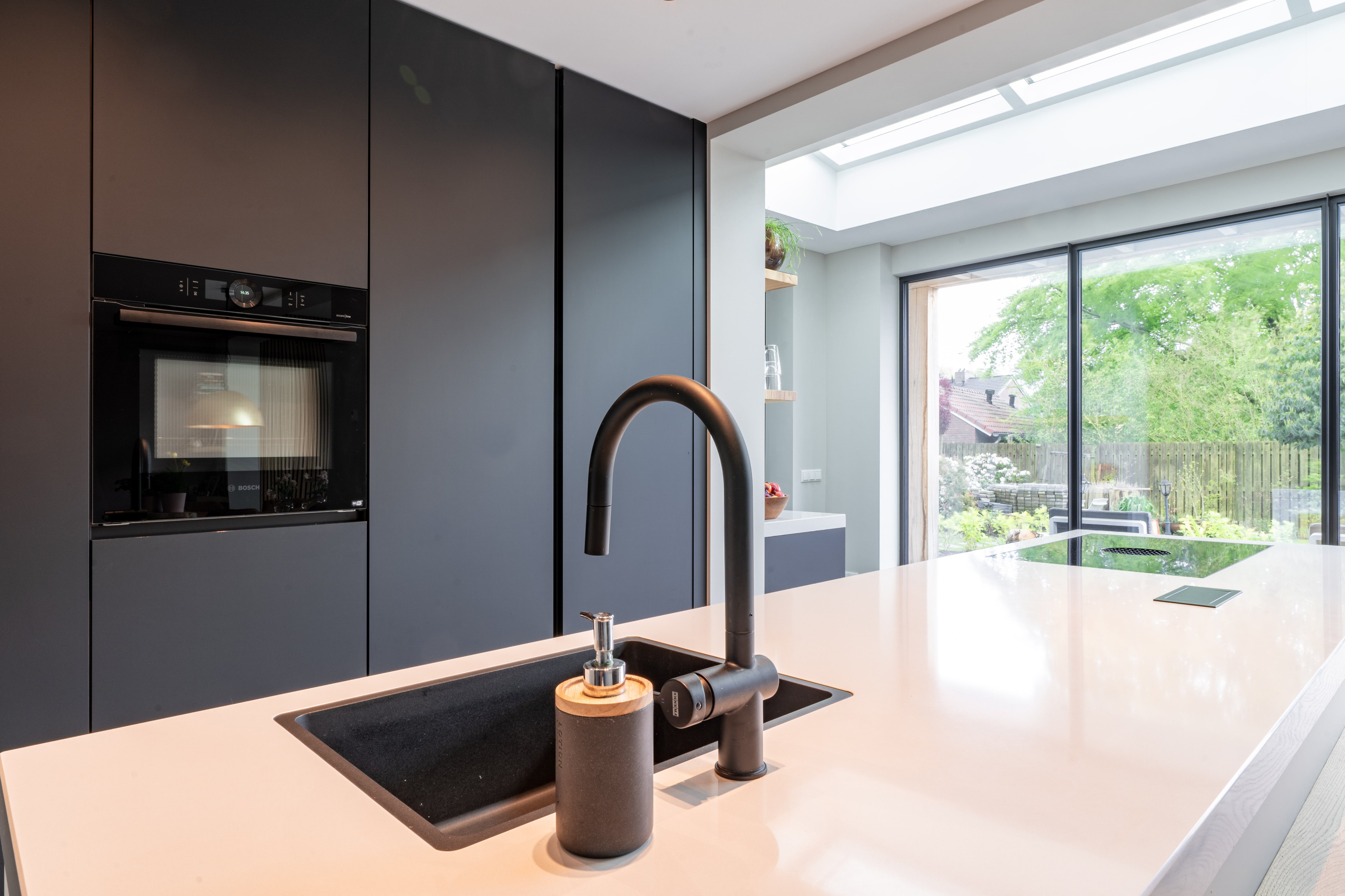 Deze keuken is uitgerust met een Bosch koelkast, vriezer en combi-oven. Daarnaast is er een matzwarte Franke kraan met uittrekbare uitloop geïnstalleerd, die perfect aansluit bij de kastenwand. De bijpassende spoelbak, eveneens van Franke, is ook matzwart. Op het kookeiland is een Bora X Pure inductiekookplaat geplaatst, waardoor de bewoners kunnen koken met uitzicht op het zitgedeelte.