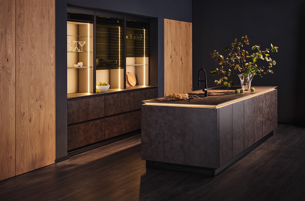 Het concept ‘Autumn Walk’ speelt met kleurcombinaties, waarvoor de natuur de inspiratie heeft geleverd en die ook kenmerkend zijn voor alle producten van Villeroy & Boch. Olijfkleuren en aardtinten zorgen voor diepte in de keuken, maar vormen ook een aantrekkelijk contrast met de lichtgekleurde hoge kasten van honingkleurig rustiek eiken. De glanzende koperrode werkbladen en fronten zijn van keramiek. Met dit materiaal is het verhaal van Villeroy & Boch meer dan 275 jaar geleden begonnen. Als aanvulling op het harmonieuze spel van kleuren kan de klant ook in een handomdraai zorgen voor een stemmige verlichting. Er is, bijvoorbeeld, een dimbare verlichting onder de werkbladen, of in de vitrine met rolluiken van glas. Ook als het licht niet brandt, is de vitrine een echte blikvanger.