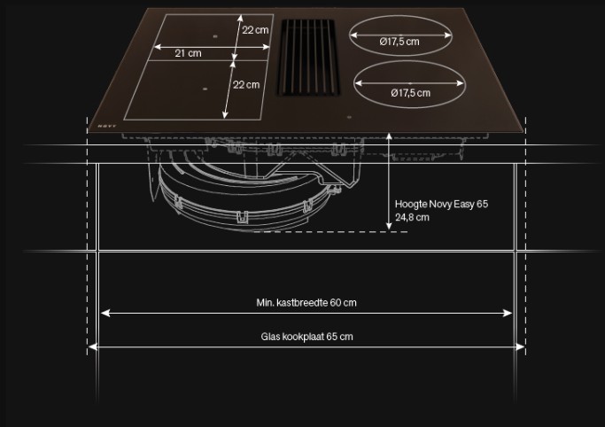 Dit Pure Monoblock filter heeft een levensduur van 450uur wat overeenkomt met 2 à 3 jaar kookplezier. Een indicatie op het apparaat geeft aan wanneer het filter vervangen dient te worden. Dit filter kan eenvoudig uitgenomen worden en zit achter het vetfilter. Optioneel kan er gekozen worden voor de Novy Easy installatiekit voor recirculatie. Deze kit bevat een complete buizenset en een diffusorelement die de gezuiverde lucht verspreid onder de kasten blaast.