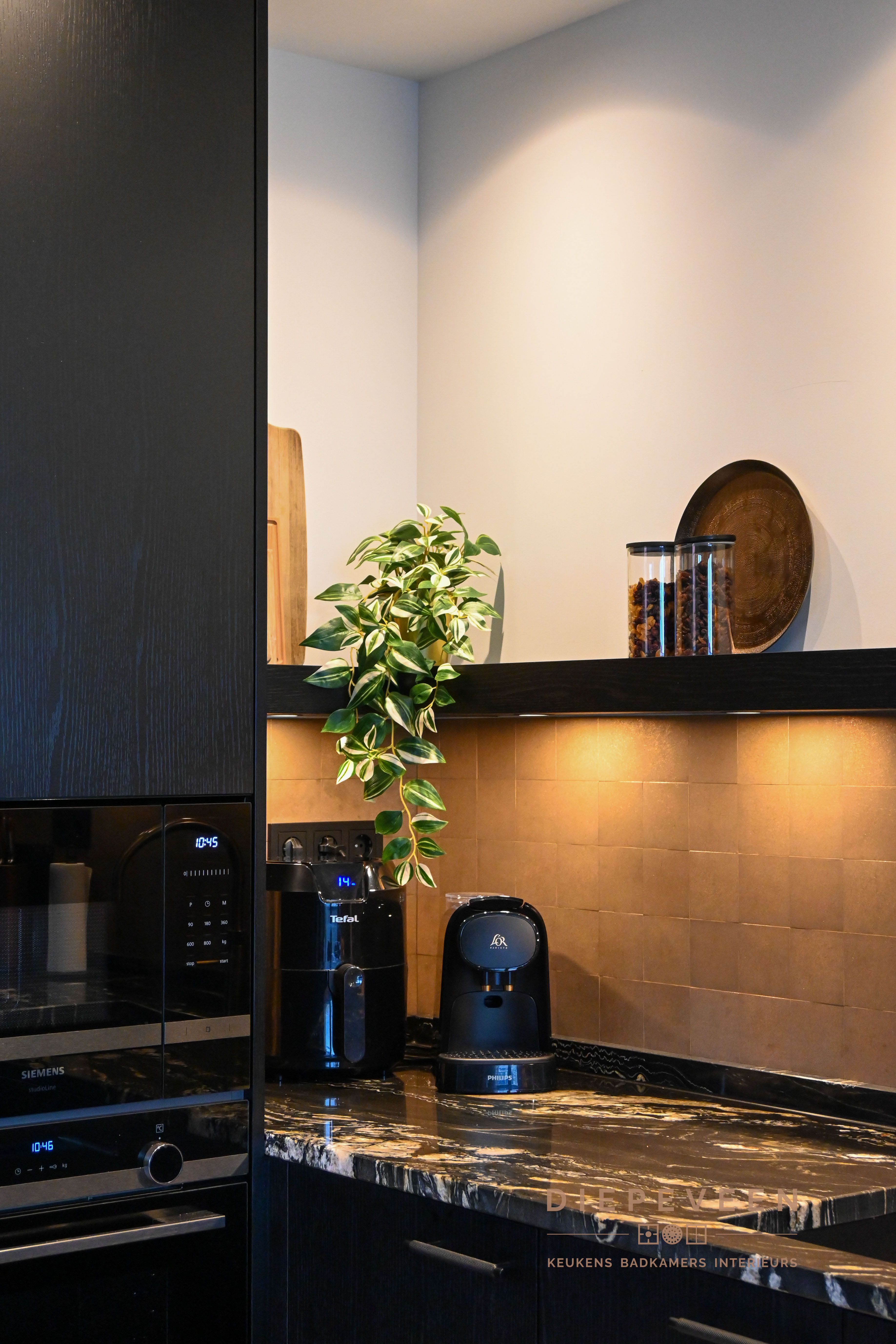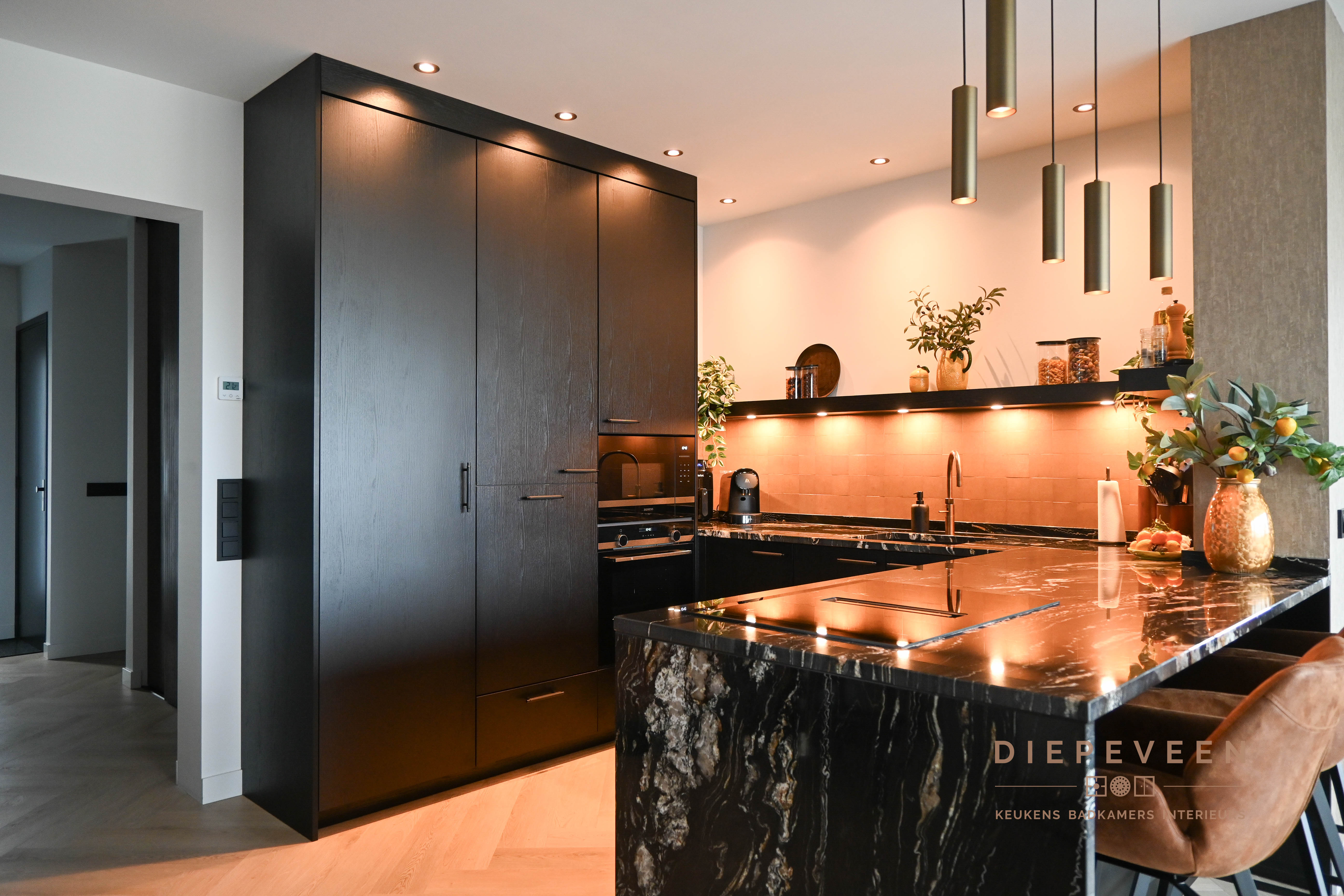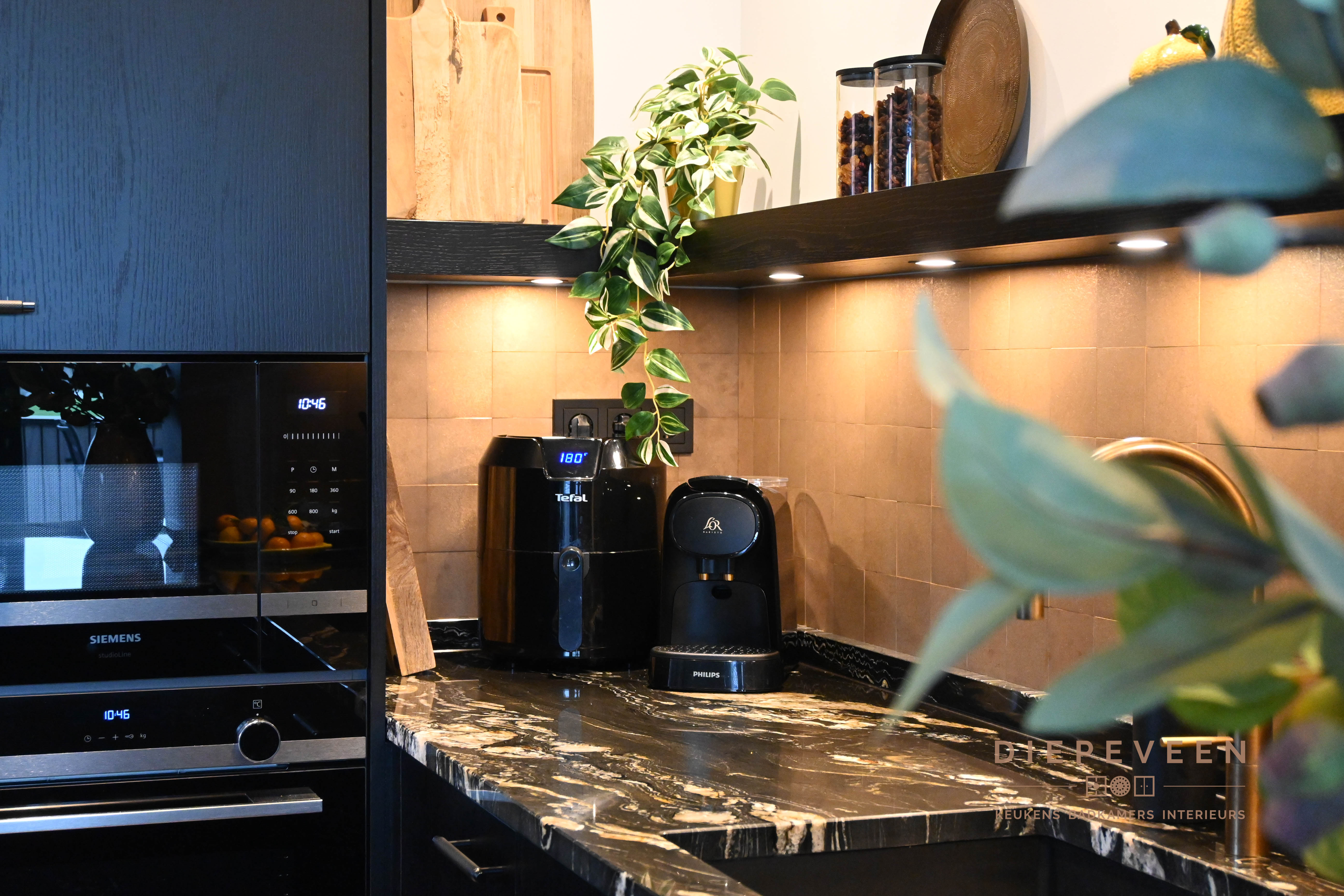 || ZWART & STIJLVOL || Deze keuken combineert modern design met een warme sfeer. De zwarte kastjes en het zwart-wit marmeren werkblad vormen een stijlvol geheel, terwijl de tegeltjes achter de keuken zorgen voor een speels kleuraccent. Boven de tegeltjes hangt een zwarte plank met ingebouwde verlichting, die zowel praktisch als sfeervol is. De messing patina kraan en de bronzen greepjes voegen een luxe en unieke touch toe. Verderop in de keuken vind je hoge kasten met een geïntegreerd zitgedeelte, wat de perfecte plek is voor een heerlijke lunch of uitgebreid diner. Dit slimme ontwerp maakt de keuken niet alleen functioneel, maar ook een plek om samen te komen en te genieten. Een keuken die echt alles biedt!