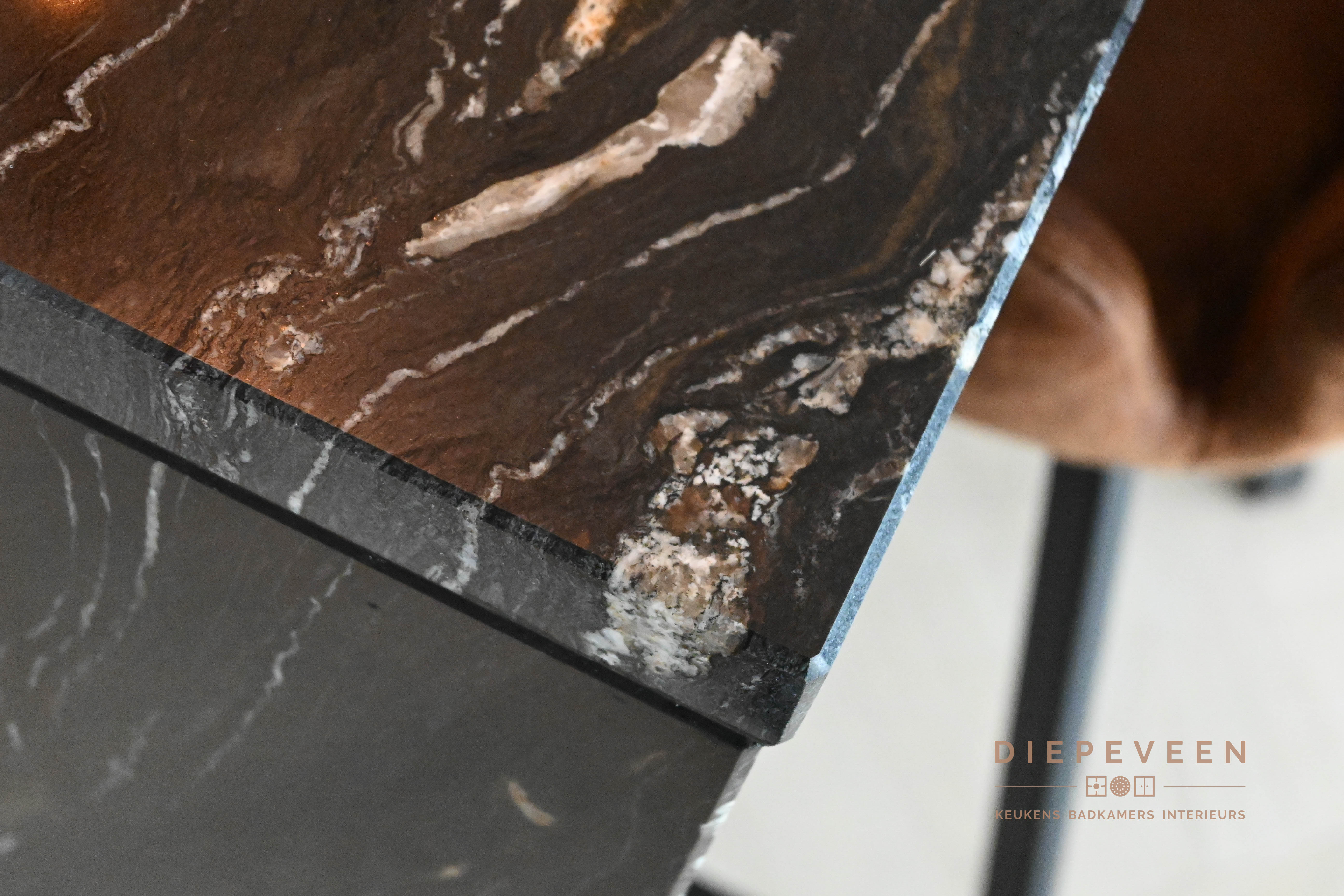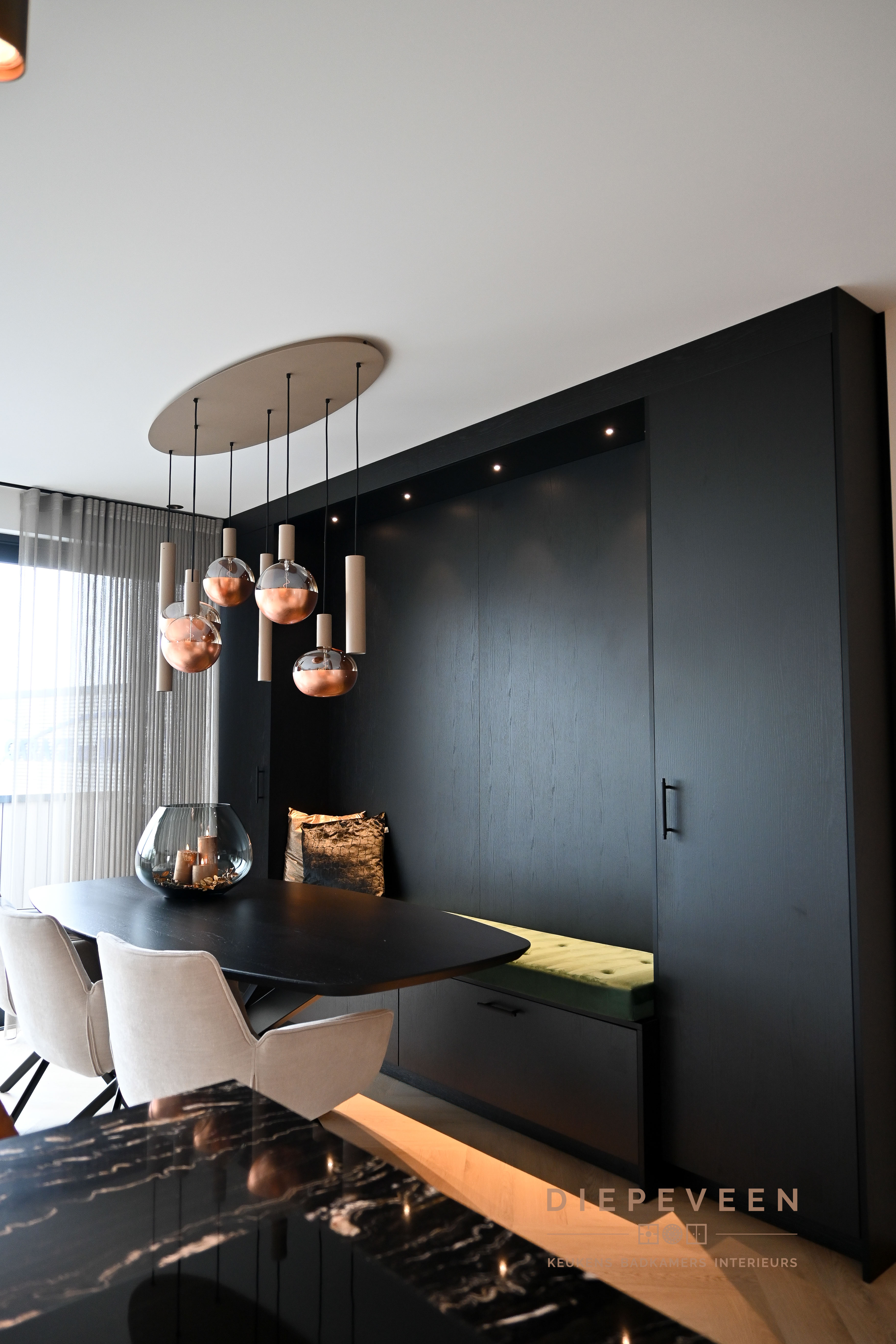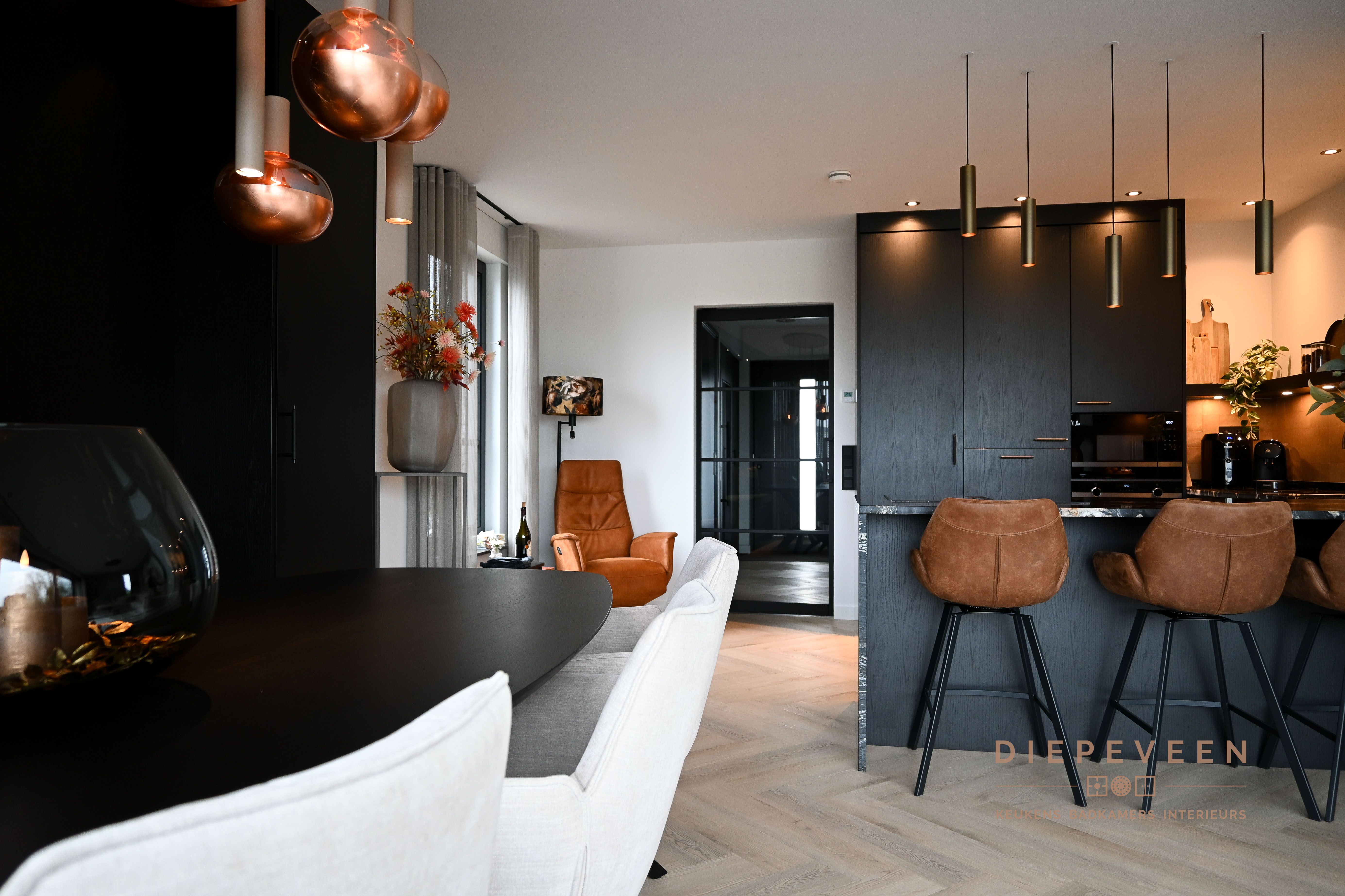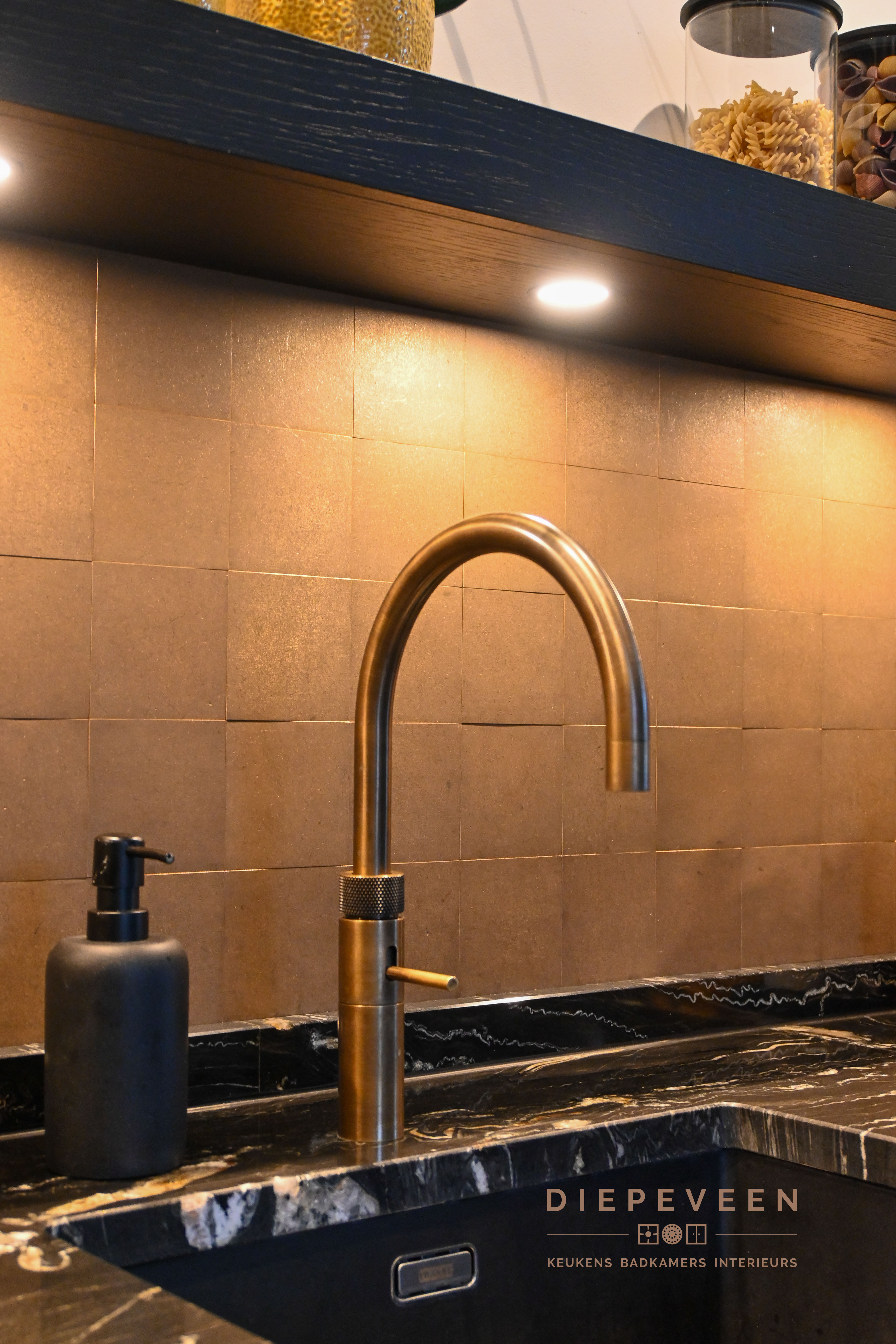 || ZWART & STIJLVOL || Deze keuken combineert modern design met een warme sfeer. De zwarte kastjes en het zwart-wit marmeren werkblad vormen een stijlvol geheel, terwijl de tegeltjes achter de keuken zorgen voor een speels kleuraccent. Boven de tegeltjes hangt een zwarte plank met ingebouwde verlichting, die zowel praktisch als sfeervol is. De messing patina kraan en de bronzen greepjes voegen een luxe en unieke touch toe. Verderop in de keuken vind je hoge kasten met een geïntegreerd zitgedeelte, wat de perfecte plek is voor een heerlijke lunch of uitgebreid diner. Dit slimme ontwerp maakt de keuken niet alleen functioneel, maar ook een plek om samen te komen en te genieten. Een keuken die echt alles biedt!