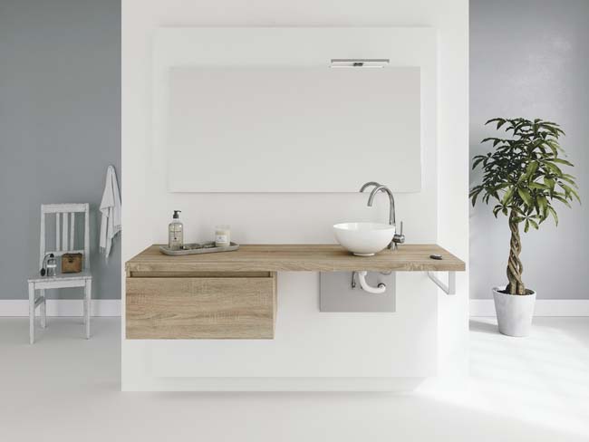 Boven het blad kan gekozen worden voor een vaste spiegel of spiegelkast tegen de muur. Optioneel is het ook mogelijk om de spiegel of spiegelkast via een achterwand op een geleidingssysteem te plaatsen. Het geheel – blad, wastafelkast en spiegel/spiegelkast – is dan in hoogte verstelbaar.