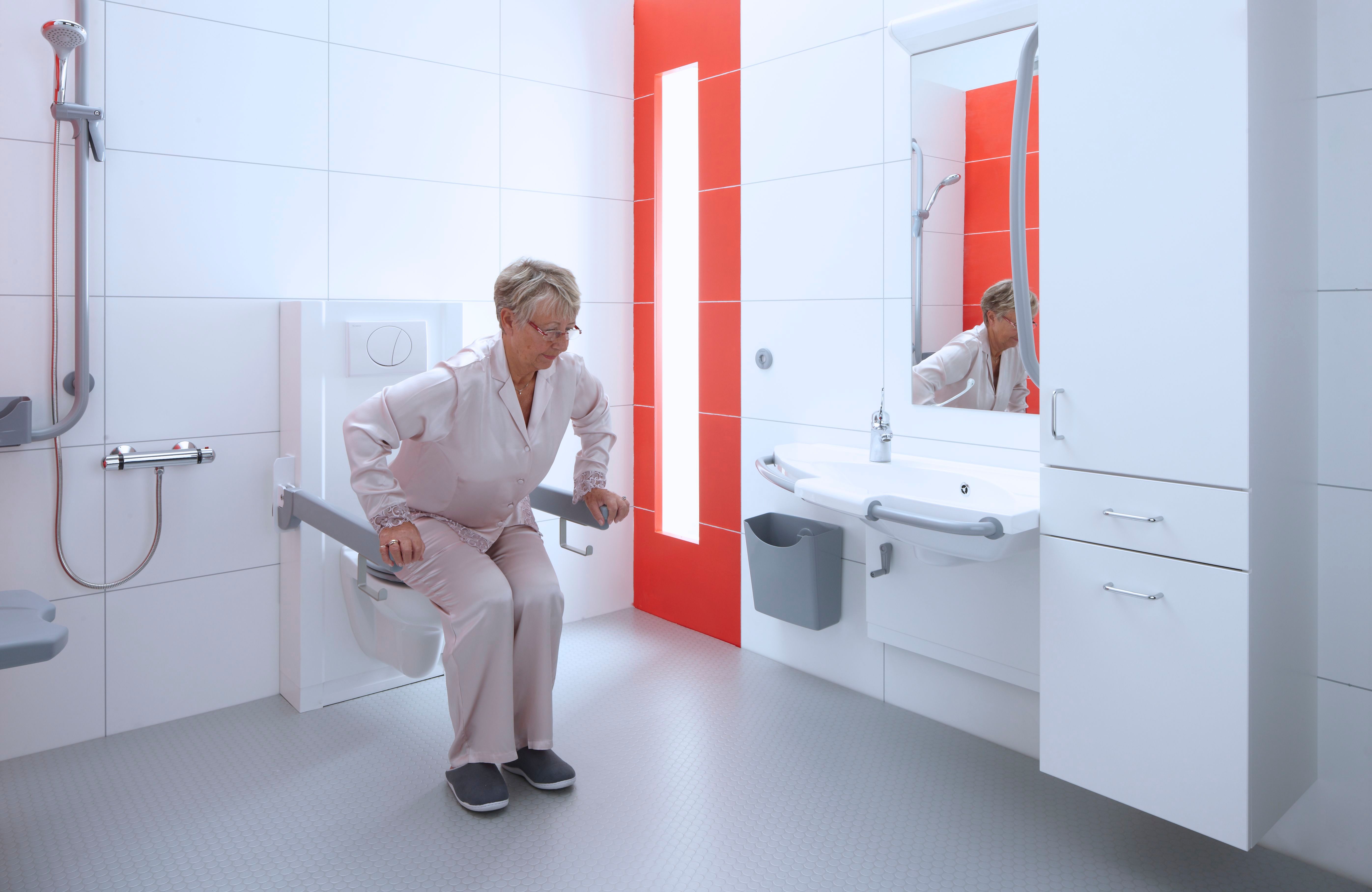 Aangrenzend de designvormgeving is dit badkamerconcept ook afgestemd op de bekrompen afmetingen in verzorgingshuizen, verpleeghuizen en ziekenhuizen (een rolstoelvriendelijke badkamer is daar vanzelfsprekend ook van belang). De doordachte indeling plus de in hoogte verstelbare badkamer hulpmiddelen en sterke antibacteriële handgrepen bij de zorg-wastafel, sta-op toilet, en het opklapbare douchezitje zorgen ervoor, dat zowel de gebruiker van de hulpmiddelen als de eventuele zorgverleners een optimale revenu verkrijgt. De gebruiker behoudt de zelfbeschikking en de verzorger wordt minder belast tijdens de werkzaamheden. De gehele aangepaste badkamer is getest en uitgevonden door echte mensen met een zorgachtergrond en niet door bijvoorbeeld architecten.