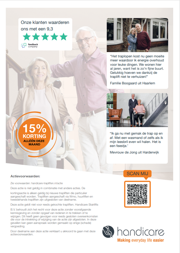 Wilt u weten wat een Handicare traplift u gaat kosten? Dan kunt u geheel vrijblijvend een offerte aanvragen. Eén van onze adviseurs zal dan bij u langskomen en brengt u vervolgens een uitgebreide offerte uit. Onze trapliftadviseurs zitten door heel Nederland verspreid, waardoor we snel bij u langs kunnen komen.
