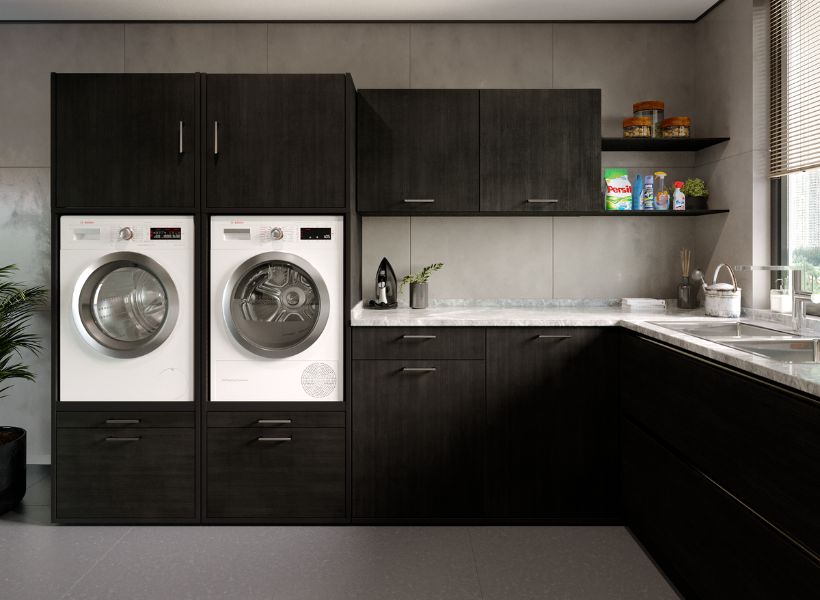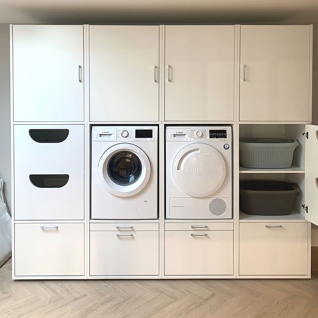In de wasmachinekast van Wastoren kan je de wasmachine en/of droger op hoogte inbouwen. Dat betekent nooit meer bukken om deze apparaten te vullen. Daarnaast ziet de wandkast er heerlijk opgeruimd uit.