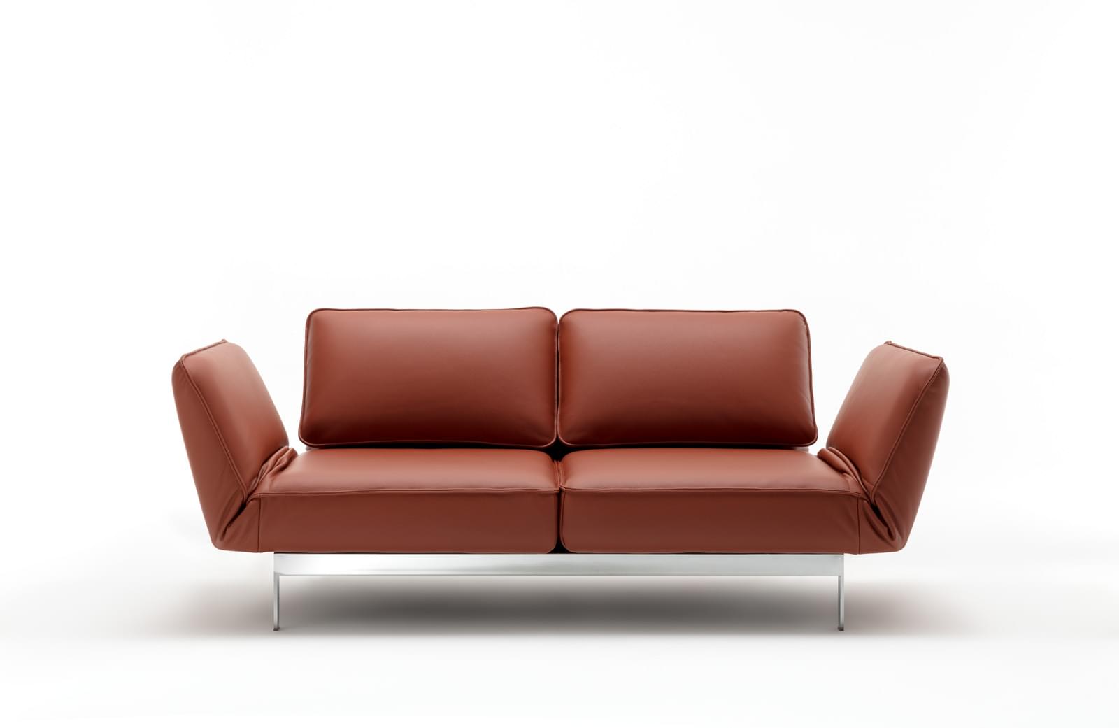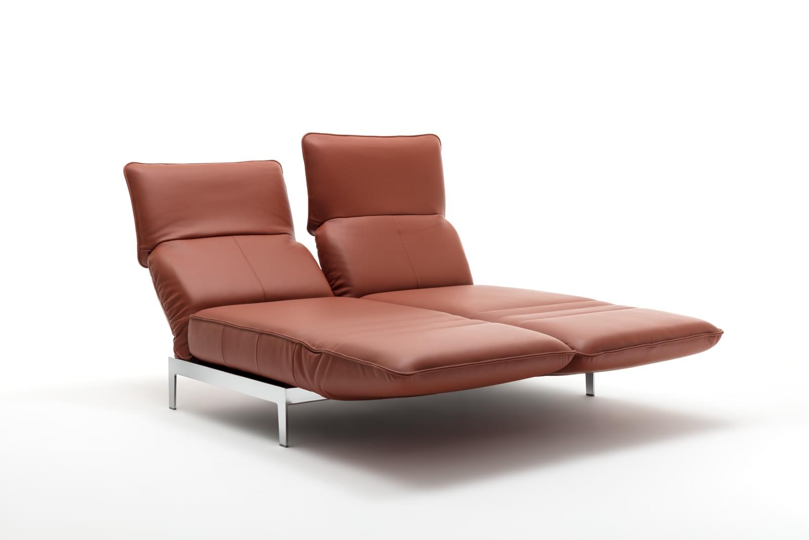 Met Rolf Benz MERA doen slanke vormen en royale relaxposities hun intrede in de woning. Rolf Benz MERA overtuigt met kleine dimensies en grote lichtheid. Het ontwerp is van Beck Design. Met zijn slanke, hoge poten en zijn fijngebouwde frame zweeft Rolf Benz MERA als het ware boven de grond – en maakt niet alleen kleine vertrekken groot.Wanneer bankzitters het rugkussen omhoog klappen, verandert de rugleuning in een extra hoge, comfortabele leuning die traploos kan worden versteld en een ontspannen relaxen mogelijk maakt. Ook het hoofdgedeelte kan op de individuele lievelingspositie worden ingesteld. Draait men de zitting en klapt men het zijdeel omlaag, ontstaat er plek om de benen op te laten rusten. Omdat het voetgedeelte zich precies op de hoogte van de zitting bevindt, kunnen ook gesloten eilanden worden gevormd. Bovendien maken de verstelbare zijdelen een comfortabel dwars zitten en liggen mogelijk.Ook MERA komt zeer goed tot zijn recht uitgevoerd in Cognac leer.