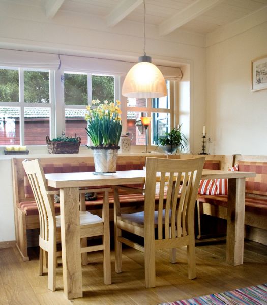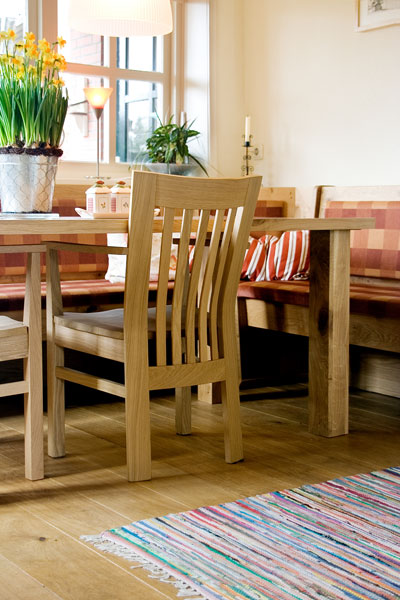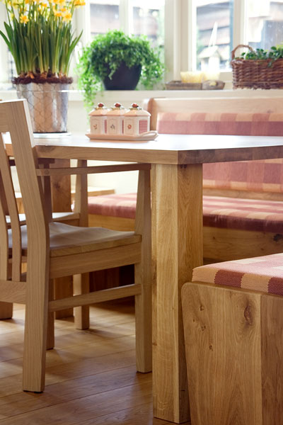 Oostenrijkse eethoek Salzburg. Deze eethoek, in massief noesteneiken, is uitgevoerd met een gestoffeerde rug. De eetkamertafel heeft geen regelwerk onder het tafelblad, zodat er makkelijk eetkamerstoelen met armleuning onder passen. Het geheel is afgewerkt in CBM 281 (bl. matlak), maar is uiteraard in vele afwerkingen leverbaar.