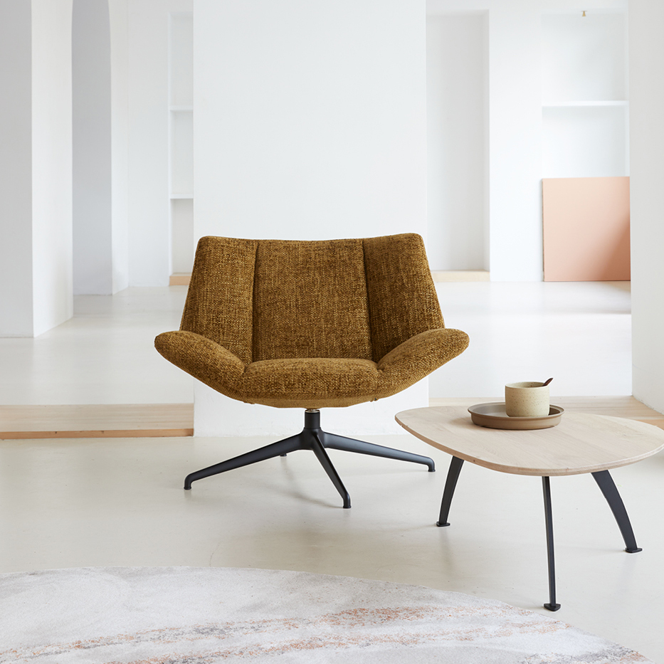 De fauteuil Aiden staat op een draaivoet en is leverbaar als laag en als hoog model. Verkrijgbaar in veel stofsoorten en in diverse kleuren leer. Fauteuil Aiden van het Nederlandse merk Dyyk springt niet alleen in het oog maar voorziet ook in zitcomfort. De vormentaal van fauteuil Aiden maken dat deze blikvanger goed past in een modern tot eigentijds interieur.