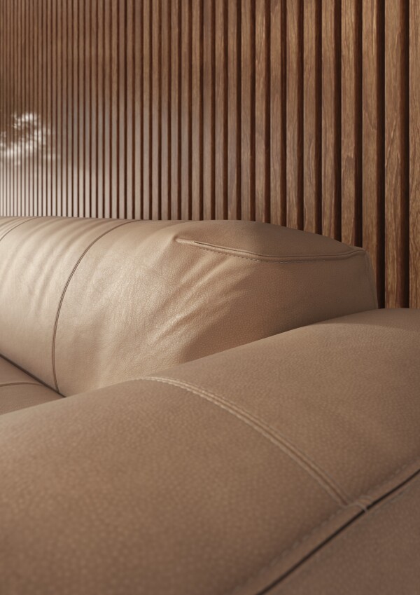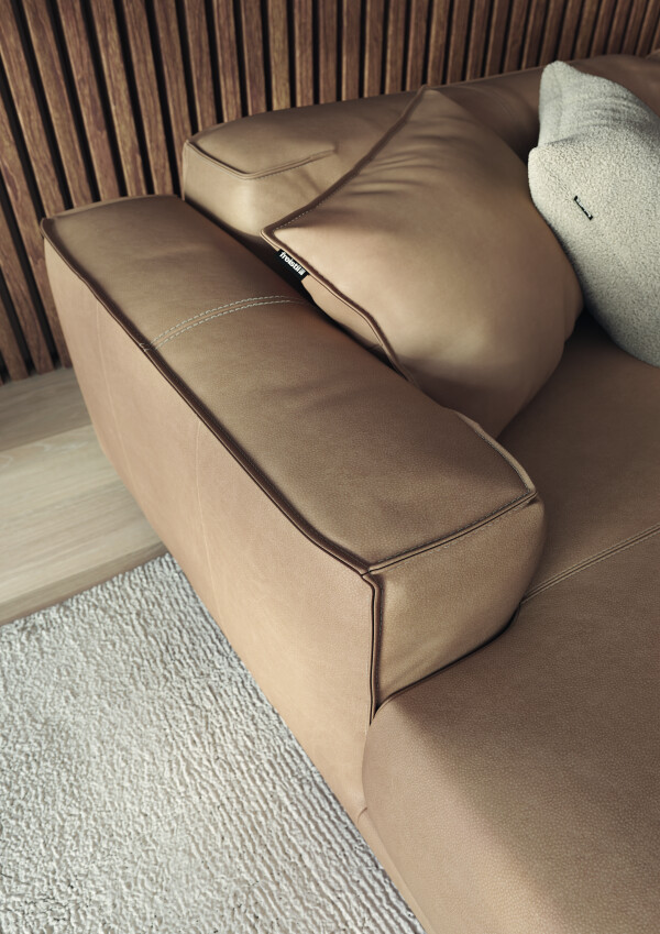 Deze bank combineert een nonchalante uitstraling met een verfijnde afwerking: zachte, uitnodigende kussens worden omlijst door markante naden en een bekleding die strak om de vorm valt – als een maatpak, maar dan om in weg te zakken.