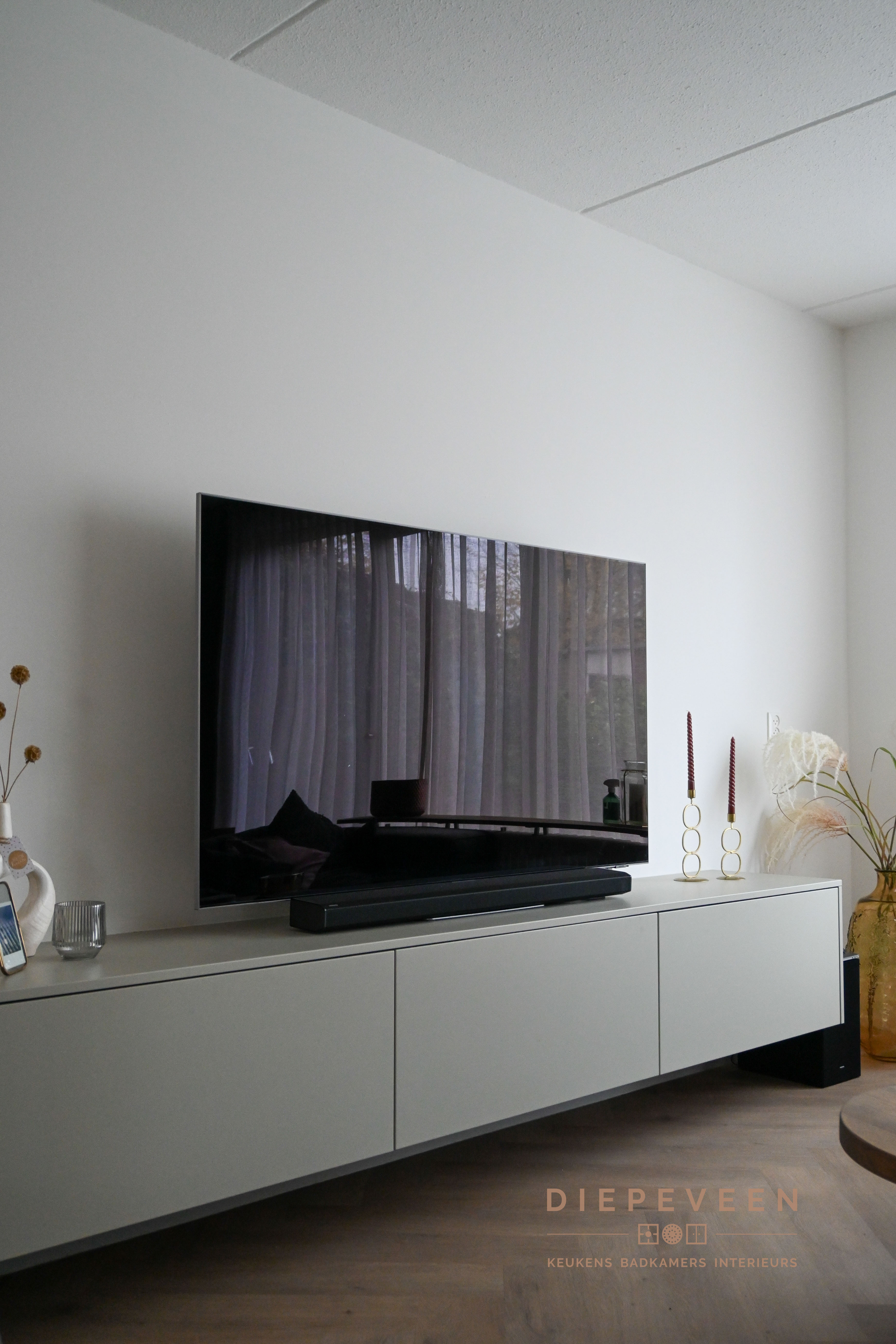 || MODERN TV-MEUBEL || Dit prachtige TV-meubel in een lichtgrijze kleur maakt de ruimte helemaal af! Doordat het aan de muur is gemonteerd lijkt het net of het meubel zweeft. Daarnaast biedt het genoeg opbergruimte, en is de bedrading netjes uit het zicht waardoor het geheel een strak en verzorgd uiterlijk heeft.