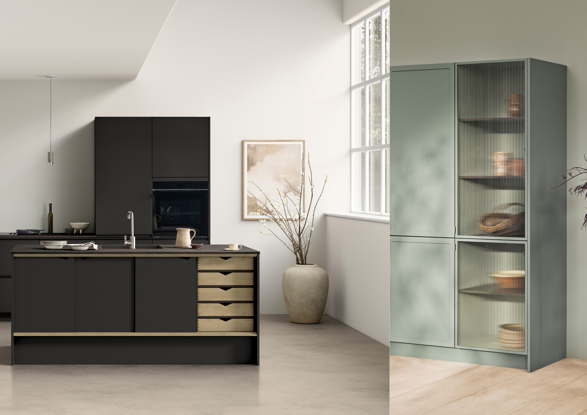 Daarnaast zijn de open kasten, die ruimte bieden voor persoonlijke accenten, beschikbaar in black, arizona beige, green, light oak en dark oak. Deze kasten kunnen desgewenst worden afgesloten met geribbeld of helder glas, waardoor functionaliteit en verfijning op elegante wijze samenkomen.