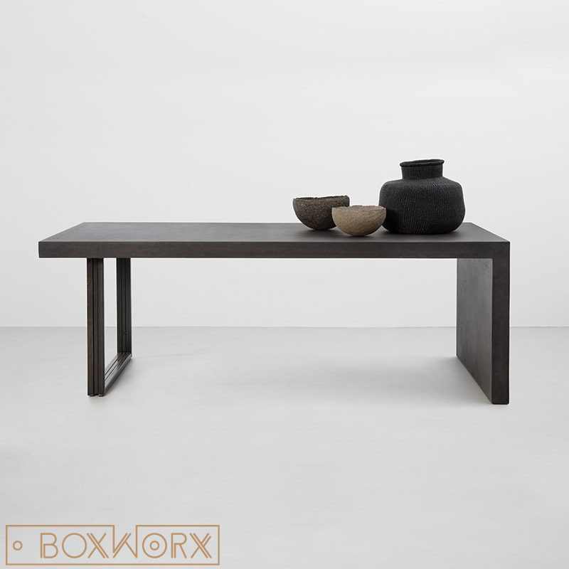 Ook voor het onderstel van staal kan je kiezen uit verschillende afwerkingen. Op de foto zijn de stalen poten afgewerkt in een koper kleur. Koper geeft een warm contrast met het diep zwarte blad. Voor de afwerking kan echter ook gekozen worden voor natuurlijk staal met de originele walslaag of de kleur mat zwart. Als je kiest voor natuurlijk gekleurd staal, krijgt dit altijd een transparante coating. Het onderstel is voorzien van meubeldoppen, zodat het staal nooit direct in contact staat met jouw vloer.