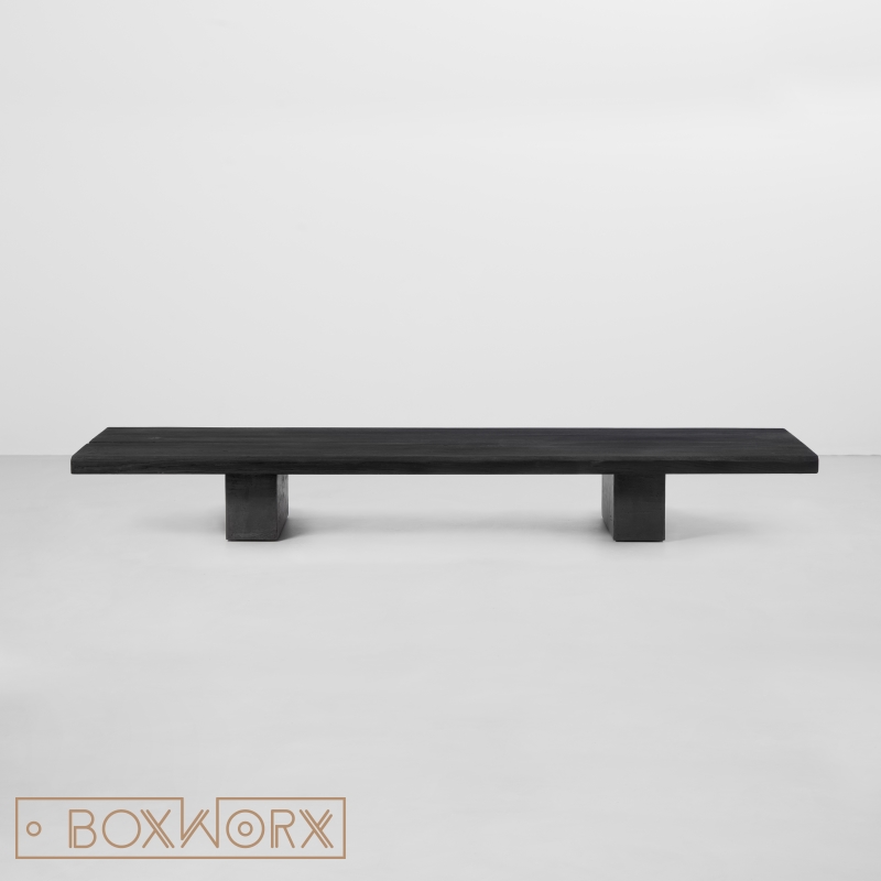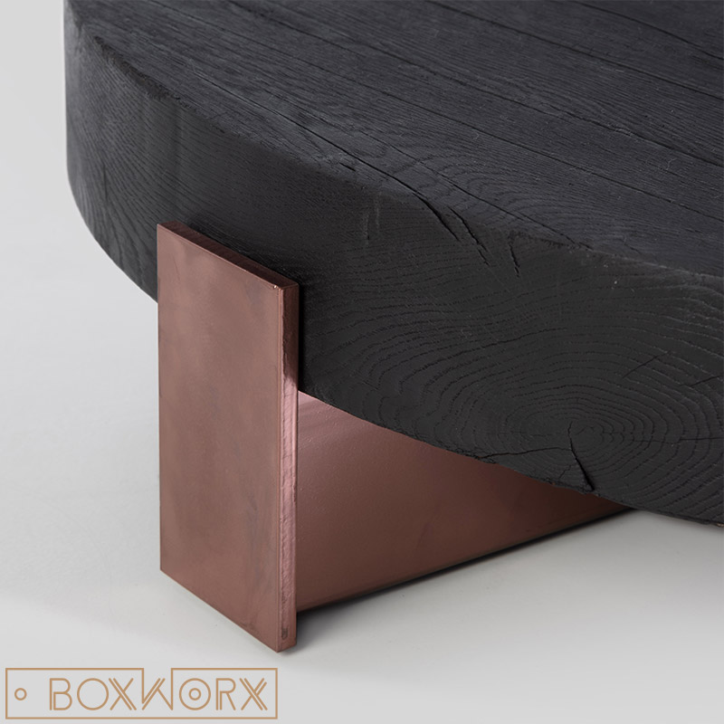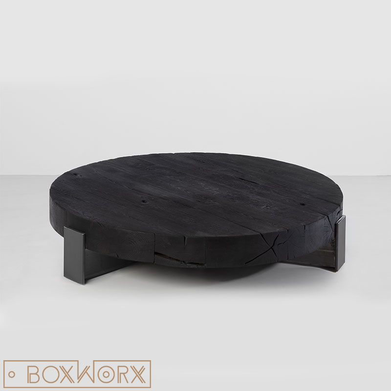 Het eiken blad van Salontafel MASS is natuurlijk gekleurd door middel van branding. Deze speciale Shou Sugi Ban brandtechniek is geïnspireerd op eeuwenoude Japanse tradities. Het hout krijgt hierdoor een unieke zwarte koollaag. De oerkracht van het vuur is prachtig zichtbaar zowel in de kleur als in de textuur van het hout. Het hout wordt afgespoeld en na droging vervolgens afgewerkt met een speciale componenten olie. De hitte en het vuur zorgen ervoor dat de natuurlijke nerven en scheuren nog meer zijn geaccentueerd. Het eikenhouten blad van de salontafel krijgt hierdoor zijn artistieke en originele afwerking en een levendige diepzwarte matte kleur.