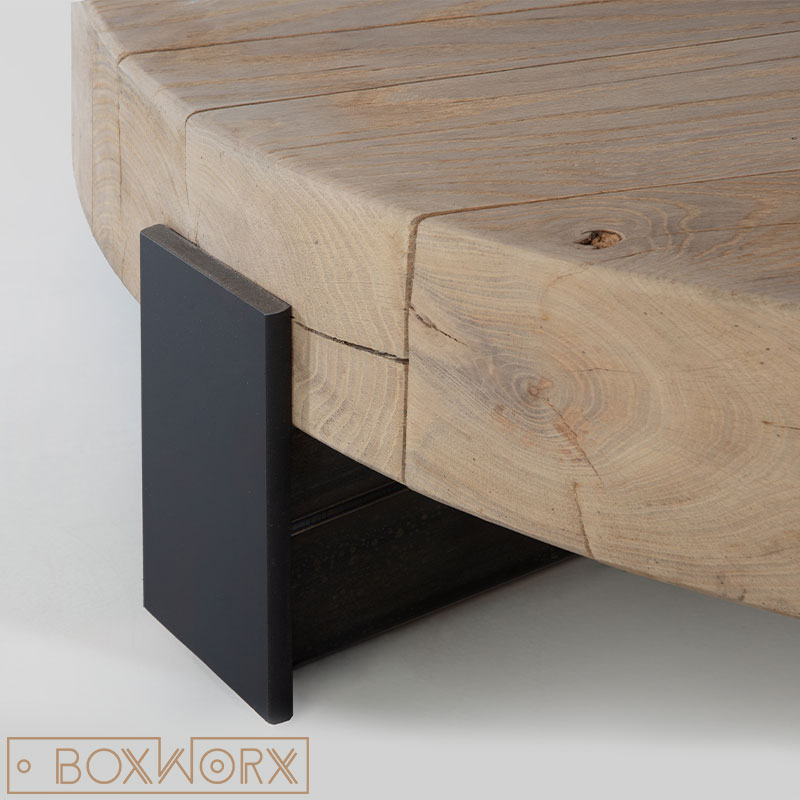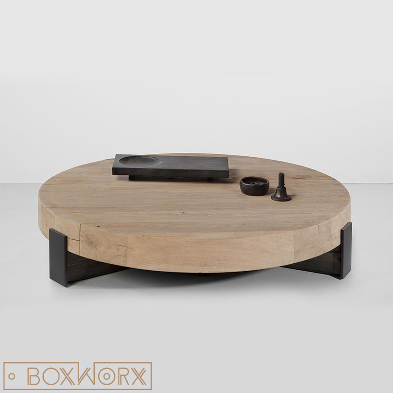 Salontafel MASS is door zijn ronde vorm en massieve levendige tafelblad van oude dikke eiken balken een echte eyecatcher in je interieur.