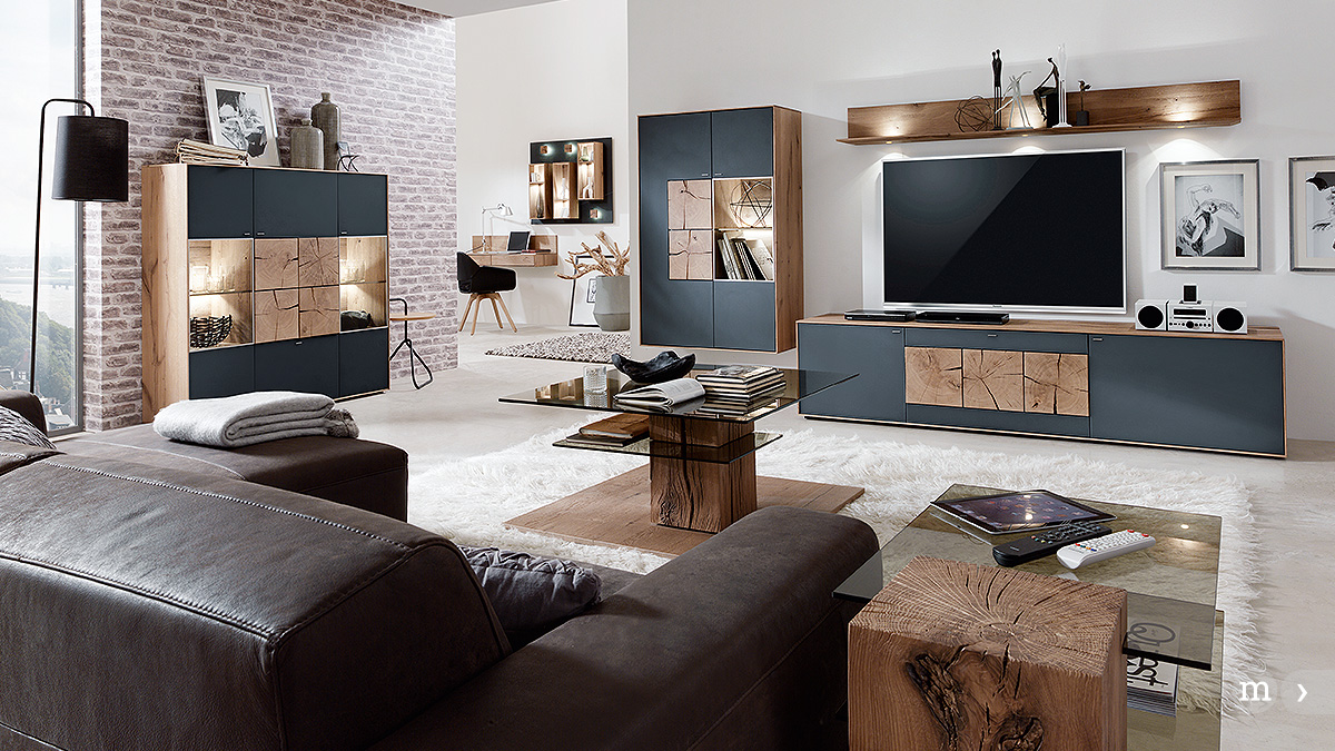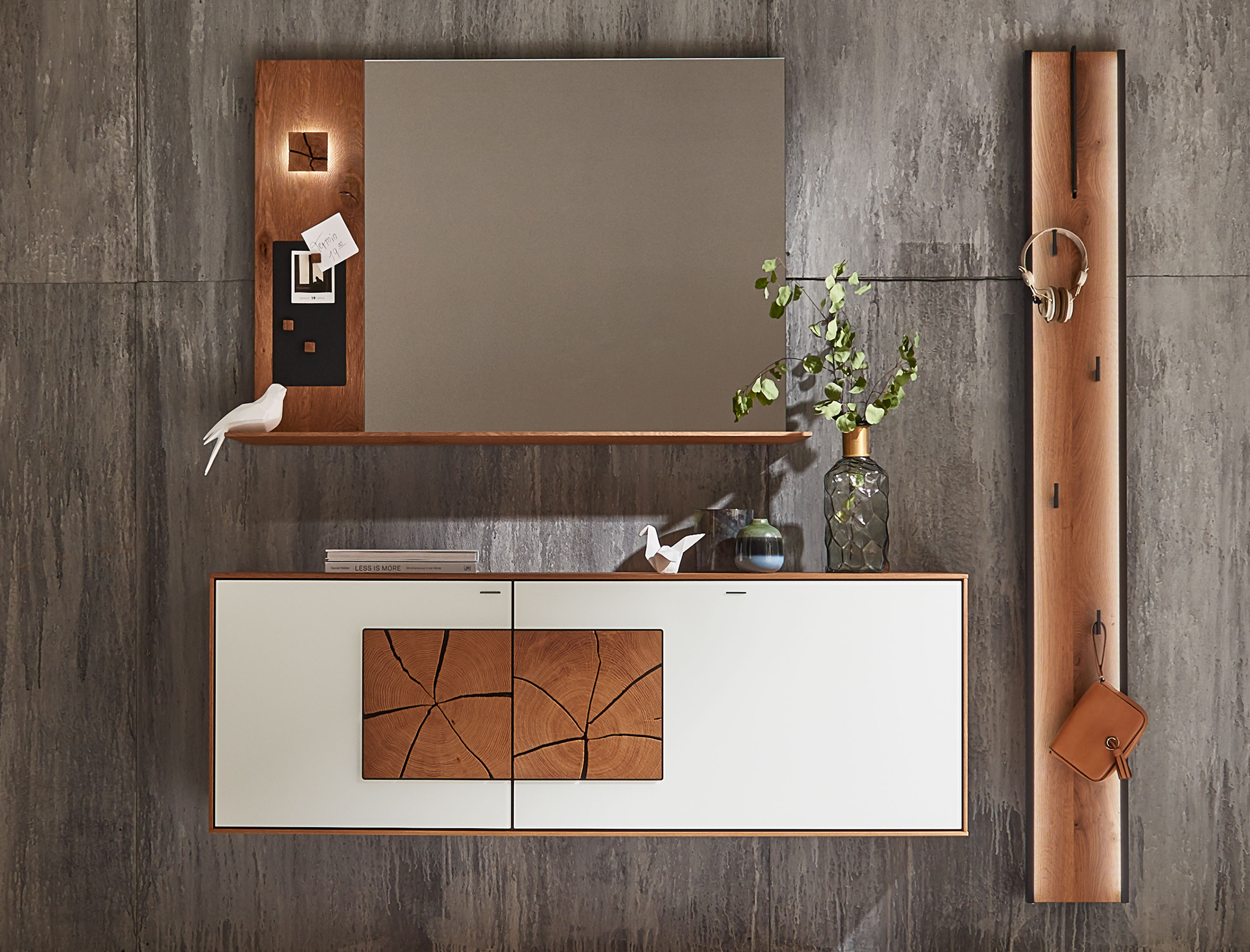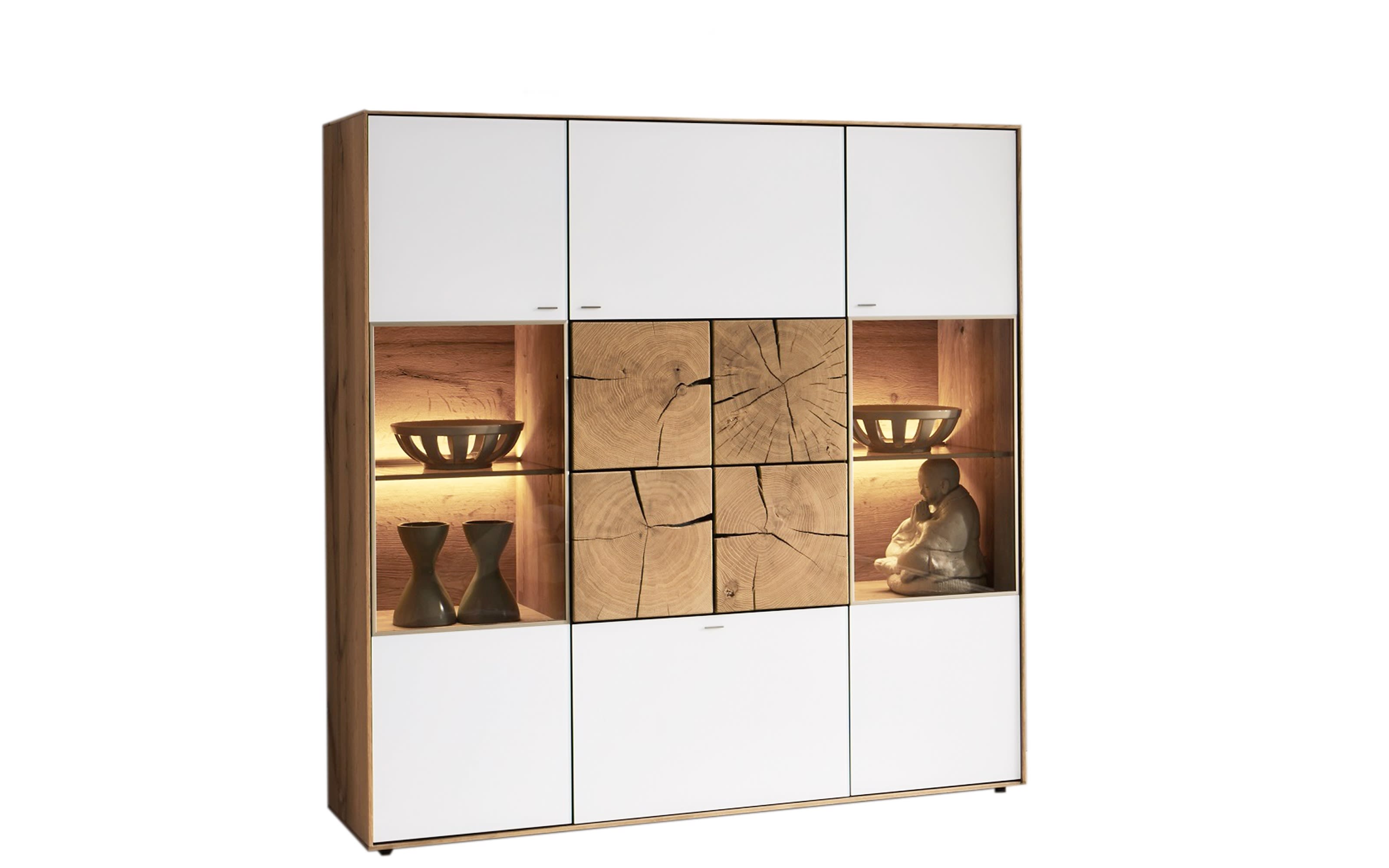 De karakteristieke houten kernen zijn gemaakt van een massief stuk eiken uit het midden van de boom, dat van nature scheurt. De scheuren en knoesten geven elk meubelstuk een sensationele eigen identiteit. Stijl, duurzaamheid en vakmanschap vloeien moeiteloos samen in deze prachtige meubelen. De smaakvolle fronten van de kasten zijn van echt glas en leverbaar in drie verschillende kleuren: wit, antraciet of fango.