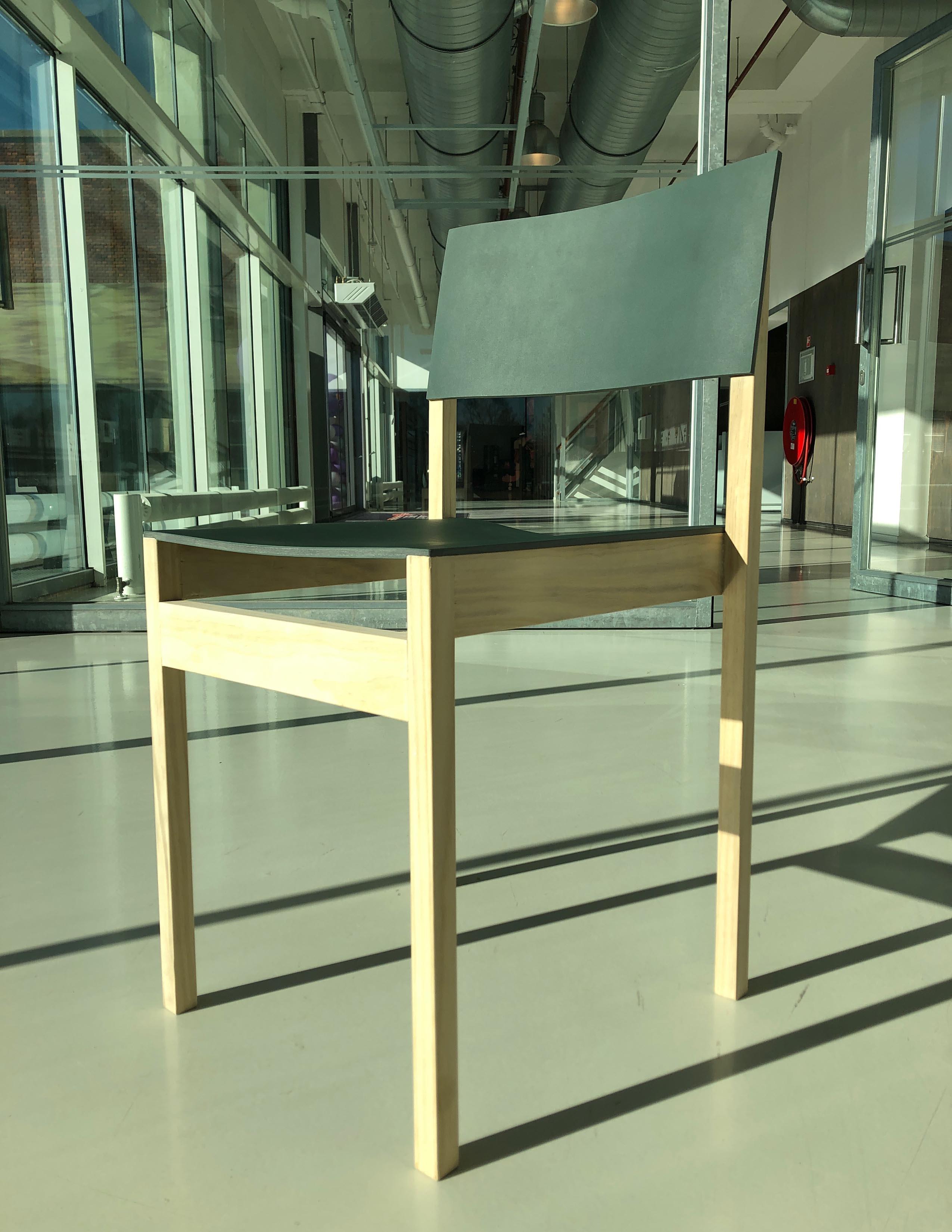 Normaal worden houten zitvlakken van stoelen met hitte geperst. Dit geldt niet voor het gebruikte materiaal voor de Lonc stoel. De Slim stoel bestaat uit Accoya hout, furniture linoleum en dik papier. Dat laatste is een restproduct uit de linoleum productie van Forbo: het einde van de rol. Lonc vond dit een prima drager voor het furniture linoleum dat zij al wilde toepassen. Door het te persen en het furniture linoleum te bevestigen, konden twee vliegen in één klap worden geslagen: blijven werken met lokale en duurzame materialen en tegelijkertijd ervoor zorgen dat dit materiaal niet verloren gaat.