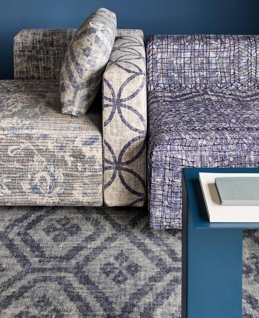 De &Ex collectie zitelementen biedt acht verschillende dessins in vier verschillende kleurgroepen: Indigo, Karmijn, Blad en Steen. Of de combinatie van kleuren en dessins kalm en rustgevend zijn of juist levendig en kleurrijk, de &Ex collectie helpt om een warme en unieke omgeving te creëren, die inspireert.