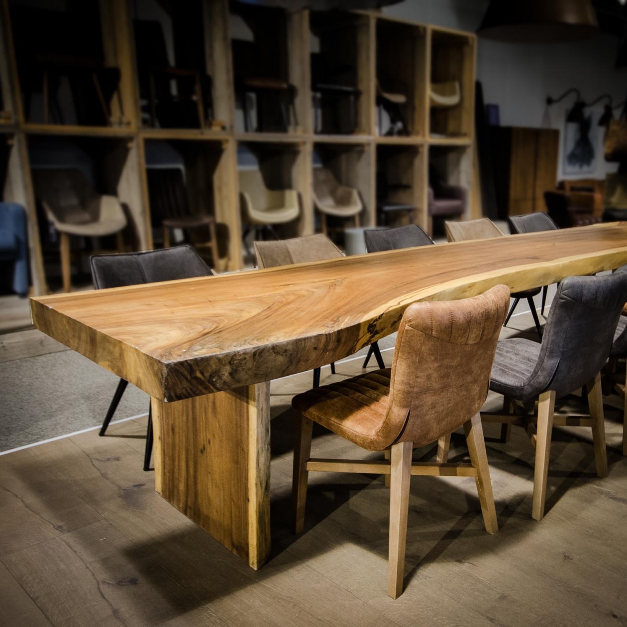 Boomstamtafels zijn populairder dan ooit. Bent u ook op zoek naar een robuuste boomstamtafel gemaakt van robuust eiken? De boomstamtafels bij HoekbankXXL kunt u helemaal naar wens samenstellen. U heeft de keuze uit maar liefst zes verschillende poten. Kies bijvoorbeeld voor een industriële boomstamtafel met een metalen trapeze poot, zoals afgebeeld. Wilt u liever een boomstamtafel met een landelijke uitstraling? Kies dan voor tafelpoten van hout. De vrijheid bij het samenstellen van uw ideale eettafel kunnen we bieden, omdat we al onze boomstamtafels speciaal voor u op maat laten maken.
