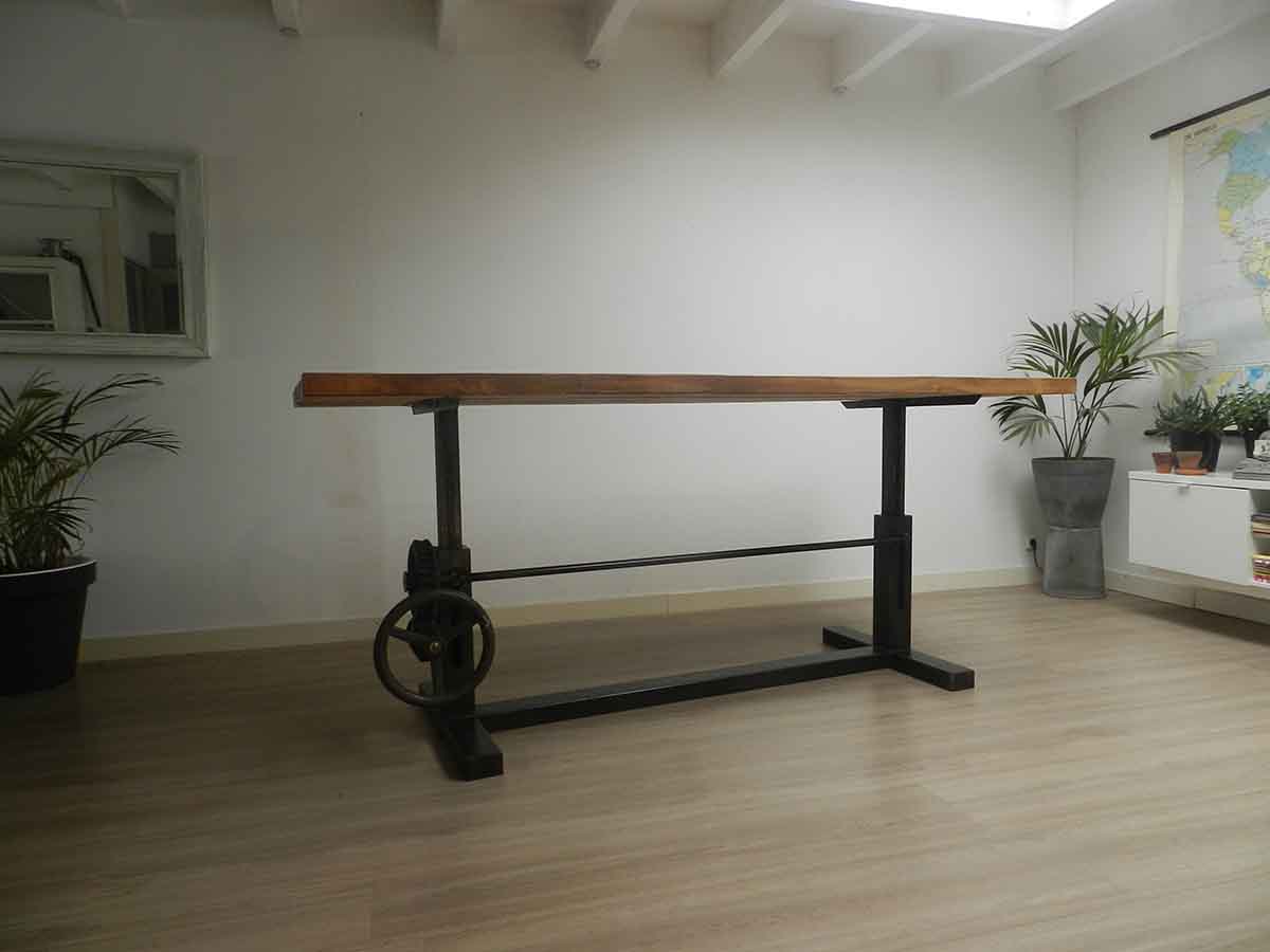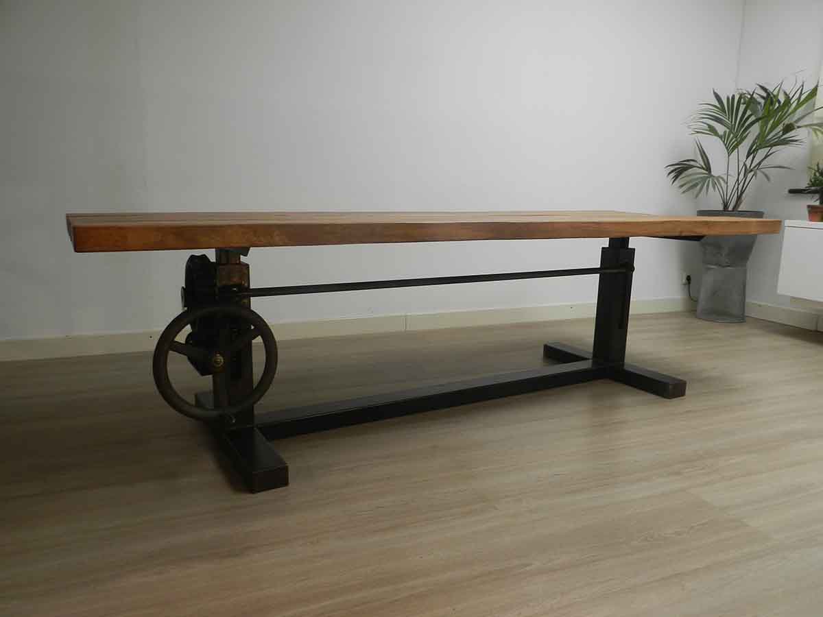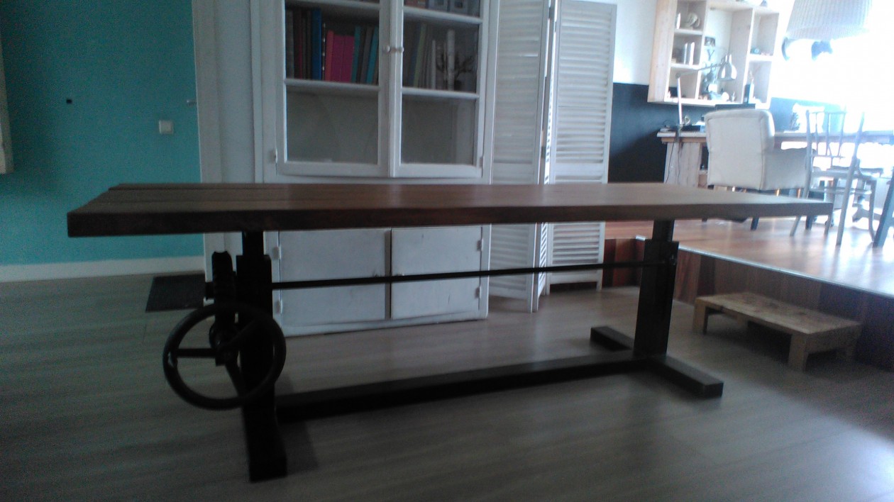 Door de vertanding en de tandheugels is het tafelblad gemakkelijk in hoogte te verstellen. Handig als staantafel of aan te zitten met een kruk. I.v.m de unieke oude onderdelen die voor dit model gebruikt worden zal elke tafel er net iets anders uitzien. Dit model industriële tafel is volledig in eigen werkplaats gemaakt waardoor deze op maat en met houtsoort naar keuze gemaakt kan worden. Zo kan er bijvoorbeeld voor een massief eiken tafelblad gekozen worden of een wagonplanken tafelblad.
